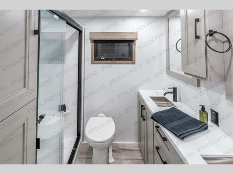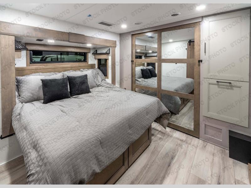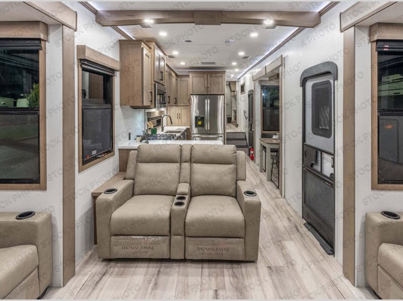 Experience the pinnacle of luxury fifth-wheel living! Retreat to the serene bedroom, featuring an electric tilt king bed with drawers under the bed, a spacious wardrobe, and washer/dryer prep. Enjoy entertainment on the 39” Smart LED TV and ample storage in the dresser. The gourmet kitchen is equipped with a pantry, 26 cu. refrigerator, convection microwave, and sliding table/desk for effortless dining and work-from-home convenience. The living room is a haven of relaxation, boasting a stunning 65” Smart LED TV, warm fireplace, theater seating, and double hide-a-bed sofas ideal for hosting guests with ease. Unwind in style in the full bathroom, featuring a dual sink vanity and ample storage. Also, enjoy the convenience of two entry/two exit doors. This fifth wheel is a masterpiece of comfort, style, and functionality, perfect for full-time living.