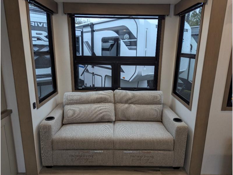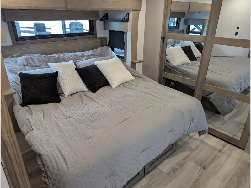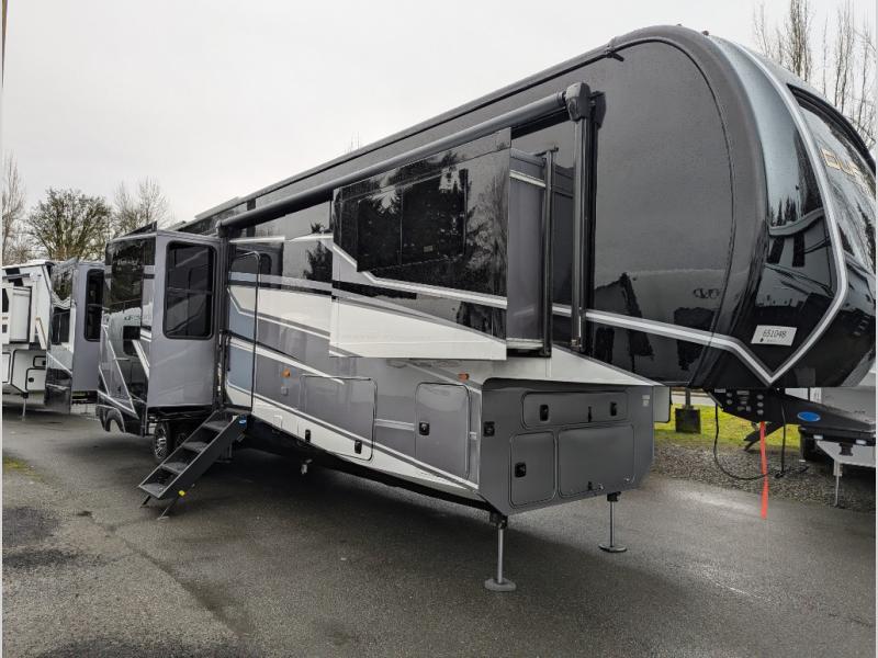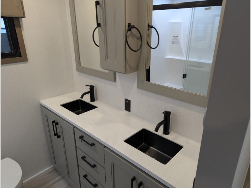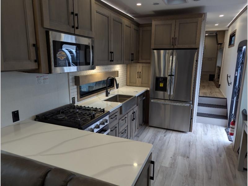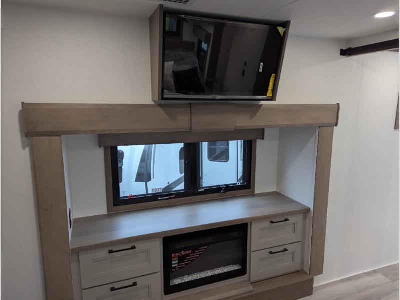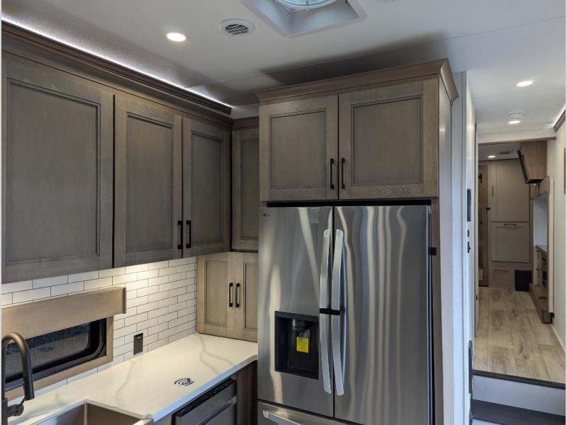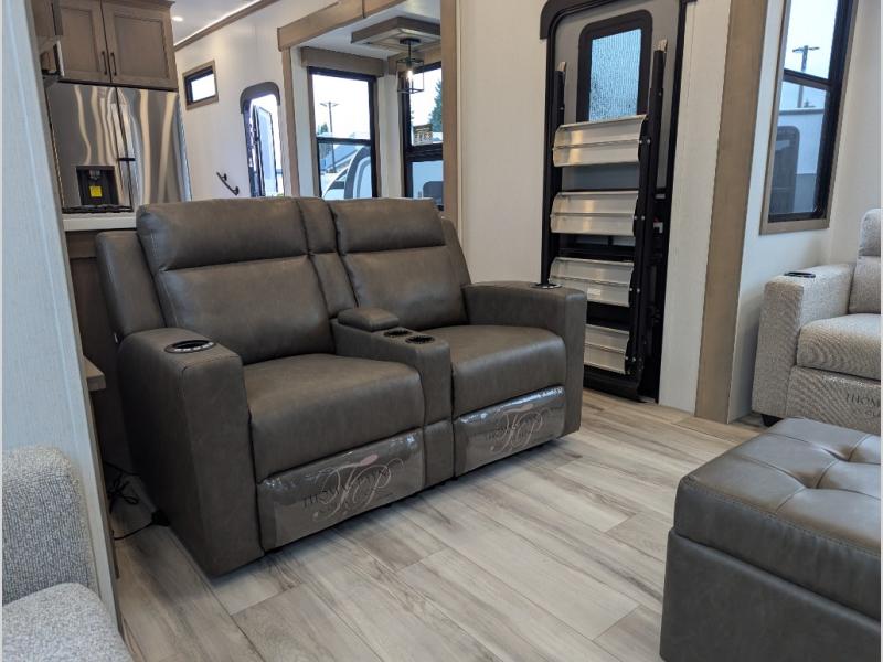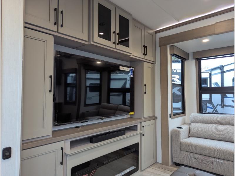 Experience the pinnacle of luxury fifth-wheel living! Retreat to the serene bedroom, featuring an electric tilt king bed with drawers under the bed, a spacious wardrobe, and washer/dryer prep. Enjoy entertainment on the 39” Smart LED TV and ample storage in the dresser. The gourmet kitchen is equipped with a pantry, 26 cu. refrigerator, convection microwave, and sliding table/desk for effortless dining and work-from-home convenience. The living room is a haven of relaxation, boasting a stunning 65” Smart LED TV, warm fireplace, theater seating, and double hide-a-bed sofas ideal for hosting guests with ease. Unwind in style in the full bathroom, featuring a dual sink vanity and ample storage. Also, enjoy the convenience of two entry/two exit doors. This fifth wheel is a masterpiece of comfort, style, and functionality, perfect for full-time living.