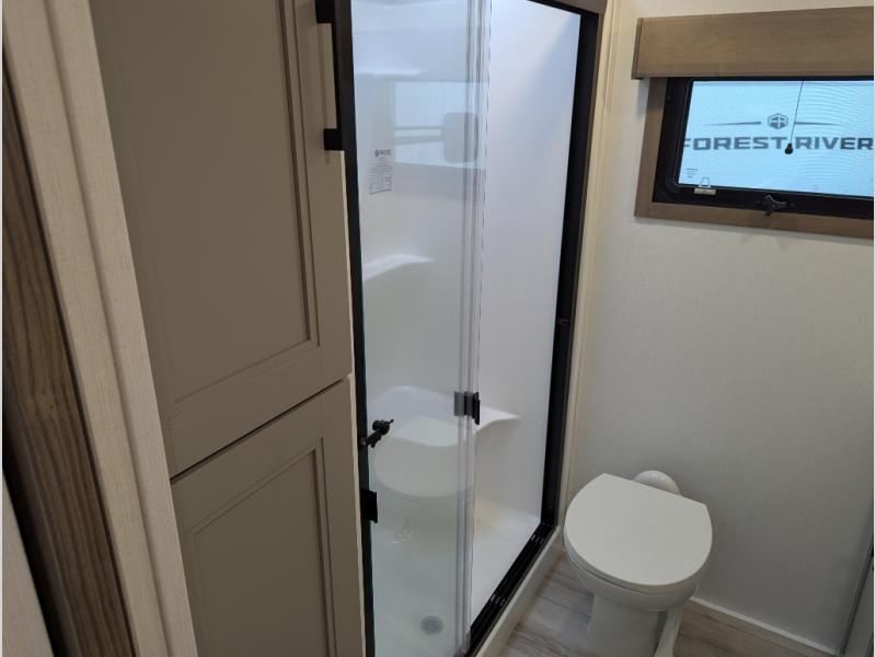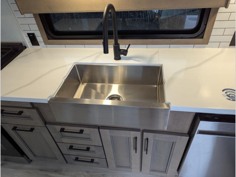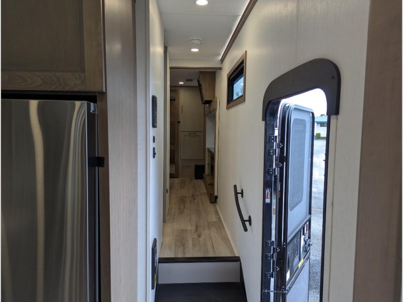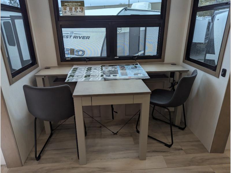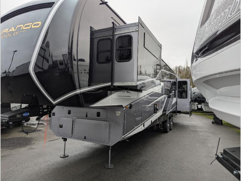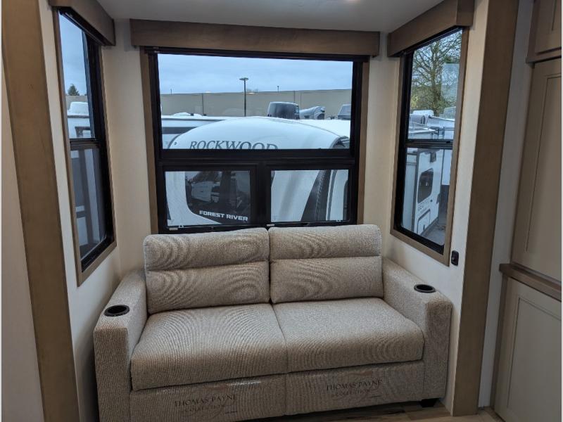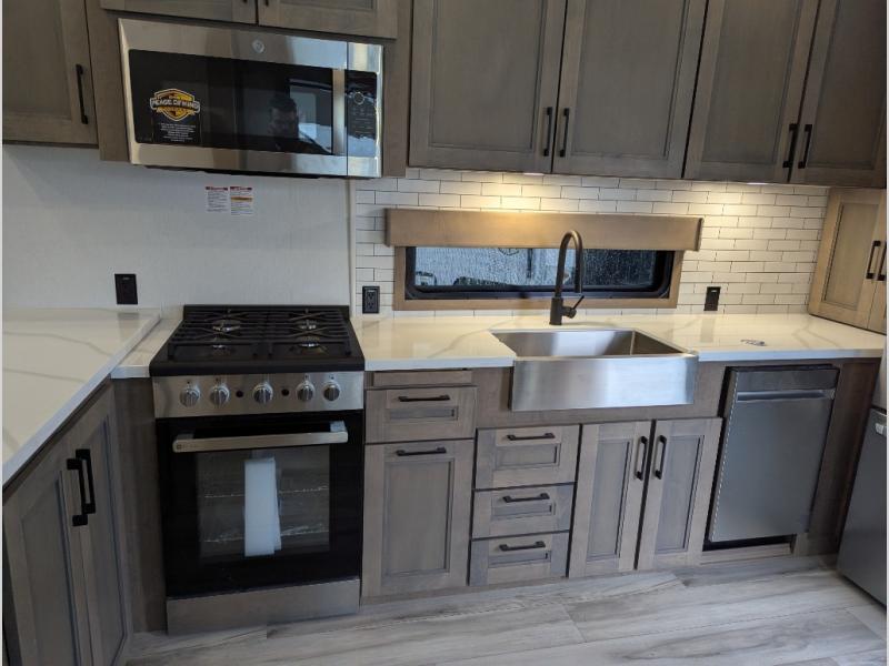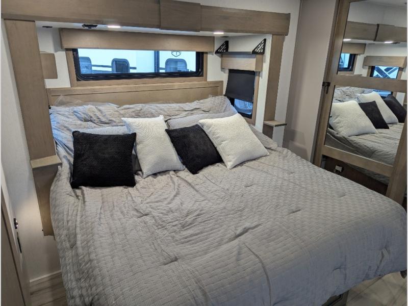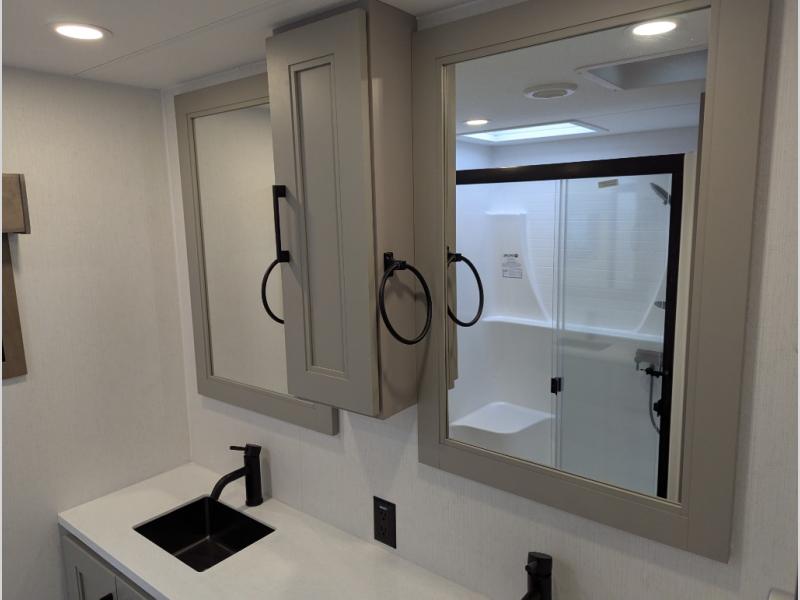 Experience the pinnacle of luxury fifth-wheel living! Retreat to the serene bedroom, featuring an electric tilt king bed with drawers under the bed, a spacious wardrobe, and washer/dryer prep. Enjoy entertainment on the 39” Smart LED TV and ample storage in the dresser. The gourmet kitchen is equipped with a pantry, 26 cu. refrigerator, convection microwave, and sliding table/desk for effortless dining and work-from-home convenience. The living room is a haven of relaxation, boasting a stunning 65” Smart LED TV, warm fireplace, theater seating, and double hide-a-bed sofas ideal for hosting guests with ease. Unwind in style in the full bathroom, featuring a dual sink vanity and ample storage. Also, enjoy the convenience of two entry/two exit doors. This fifth wheel is a masterpiece of comfort, style, and functionality, perfect for full-time living.