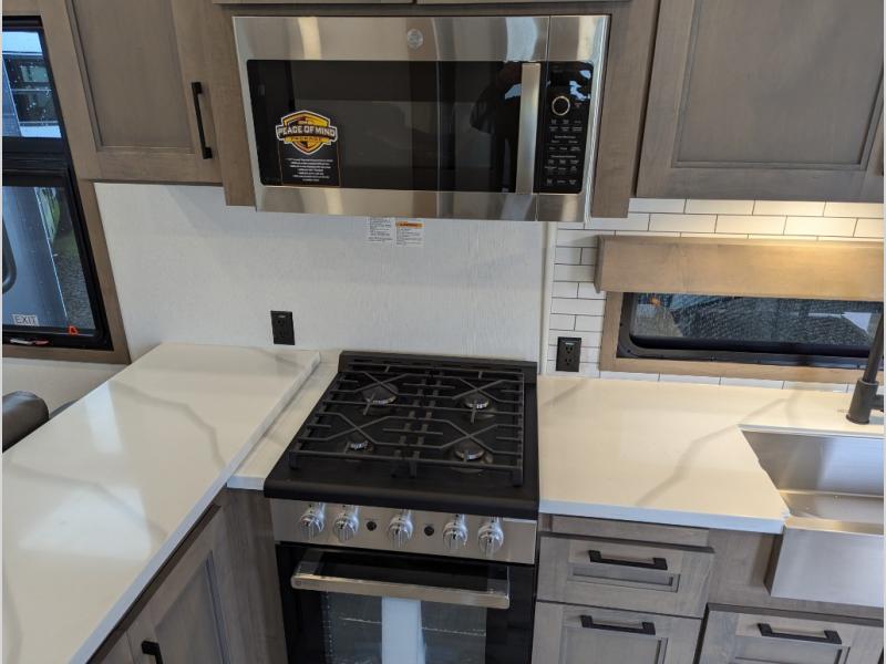 With any KZ Durango Gold full-time luxury fifth wheel, you will enjoy the new Blancher Maple and Morel Fog cabinetry, stainless steel appliances such as a 30" convection microwave and 24" oven with a four burner range, plus a stainless dishwasher. Other top features include an electric tilt bed with Serta Comfort foam king mattress, three 15K A/C units, plus theater seating with powered recline, heat and massage features. You will also appreciate a handy central vacuum system with attachments that stores out of sight. Each Durango Gold is constructed with six-sided aluminum framing, and has a heated, insulated and an enclosed underbelly. It is also constructed with Tufflex roofing material which is flexible, puncture resistant, and reflective. The now mandatory "Off The Grid" solar package includes two 200W solar panels, a 30A MPPT solar charge controller, and a 2,000W True Sine Wave inverter for off-grid capabilities.