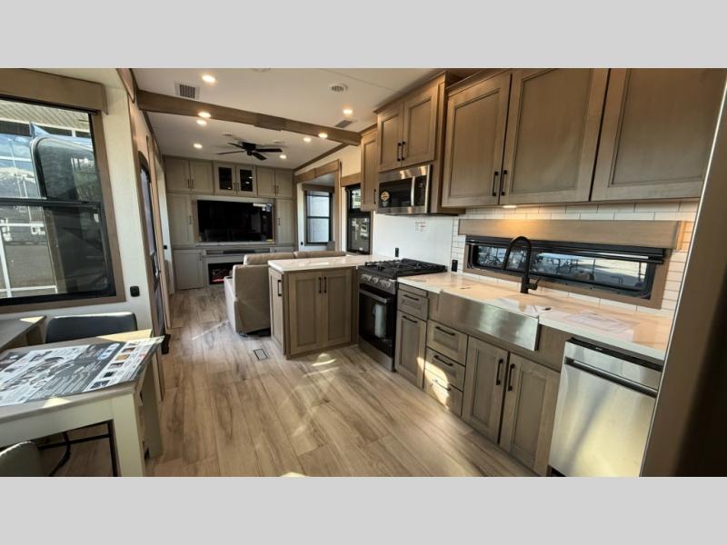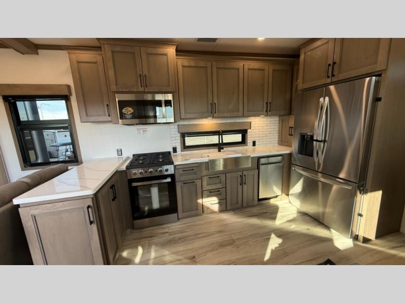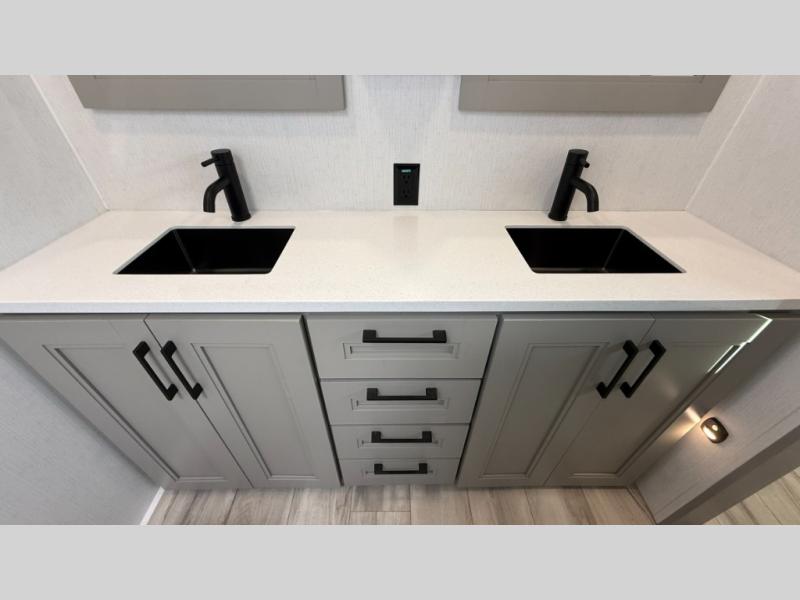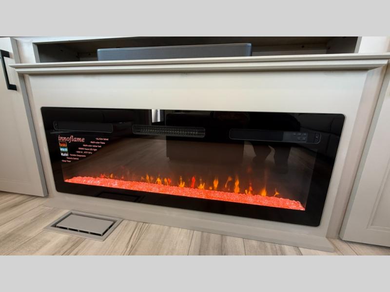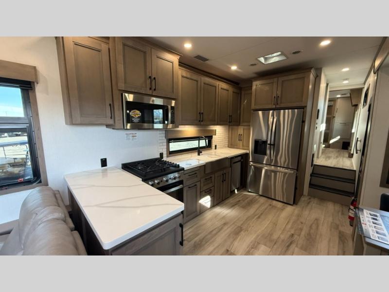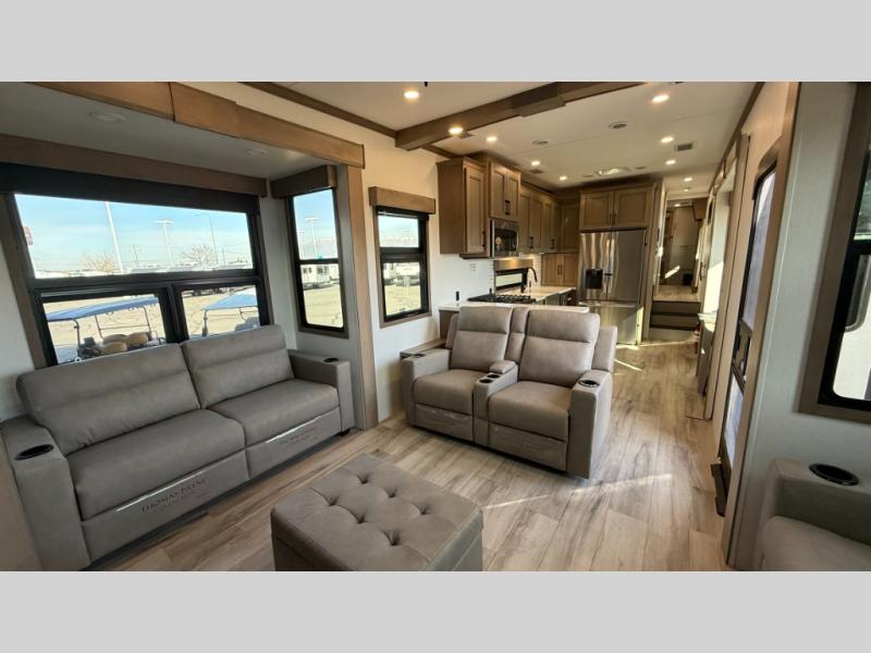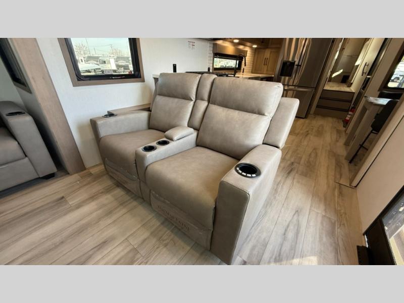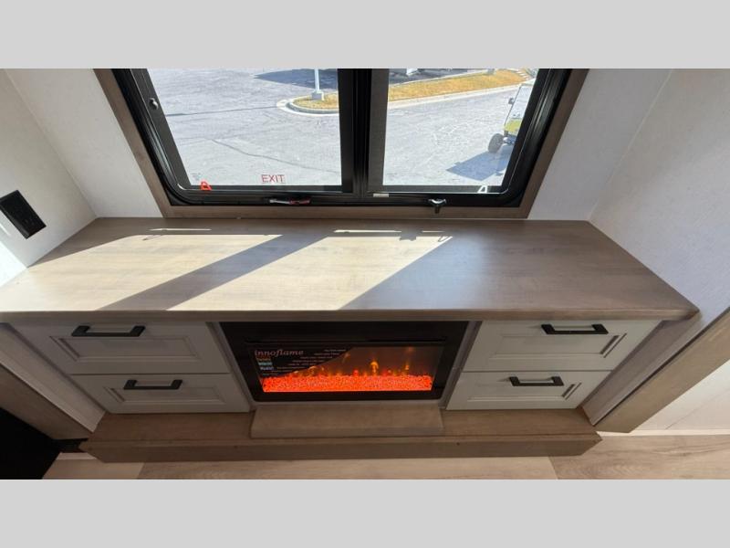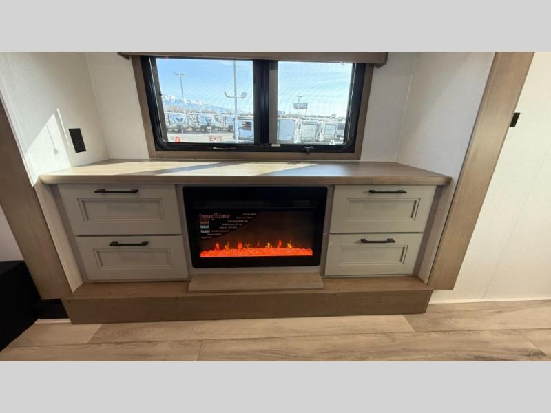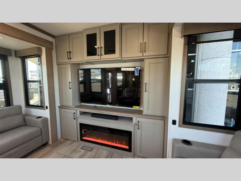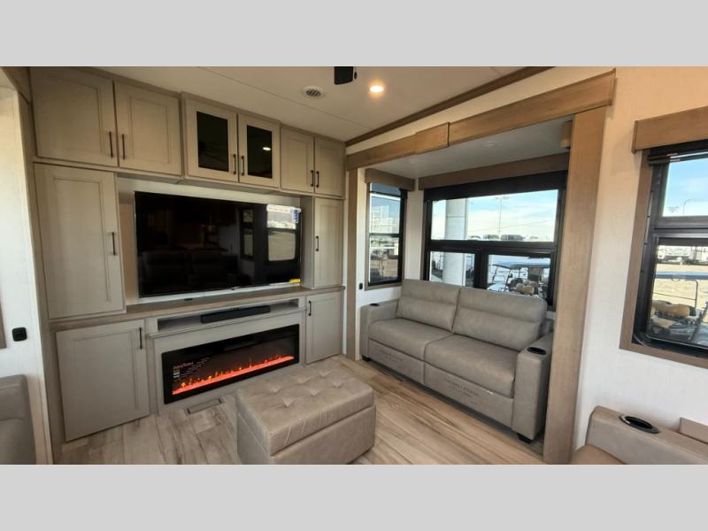 Experience the pinnacle of luxury fifth-wheel living! Retreat to the serene bedroom, featuring an electric tilt king bed with drawers under the bed, a spacious wardrobe, and washer/dryer prep. Enjoy entertainment on the 39” Smart LED TV and ample storage in the dresser. The gourmet kitchen is equipped with a pantry, 26 cu. refrigerator, convection microwave, and sliding table/desk for effortless dining and work-from-home convenience. The living room is a haven of relaxation, boasting a stunning 65” Smart LED TV, warm fireplace, theater seating, and double hide-a-bed sofas ideal for hosting guests with ease. Unwind in style in the full bathroom, featuring a dual sink vanity and ample storage. Also, enjoy the convenience of two entry/two exit doors. This fifth wheel is a masterpiece of comfort, style, and functionality, perfect for full-time living.