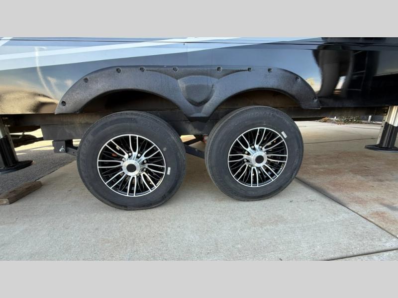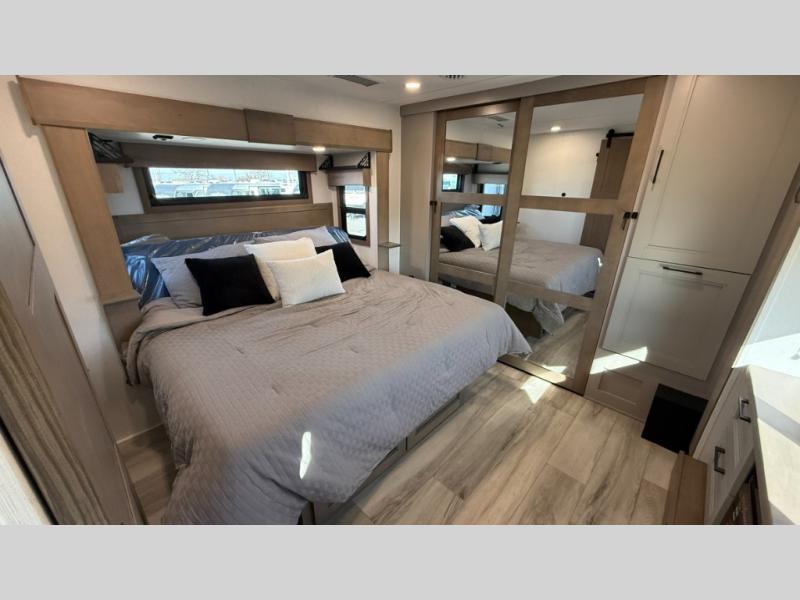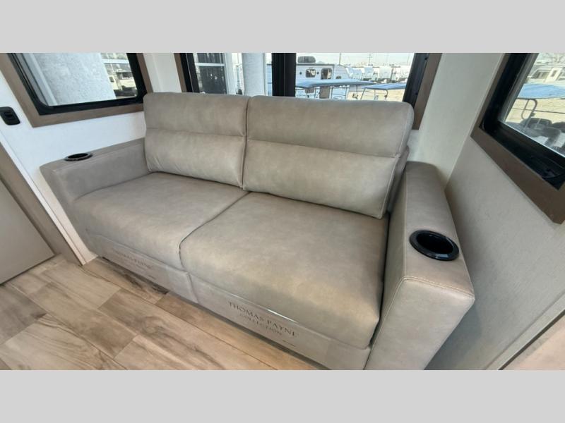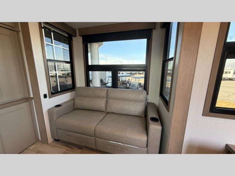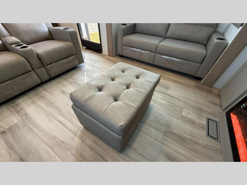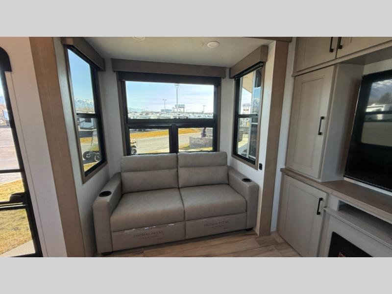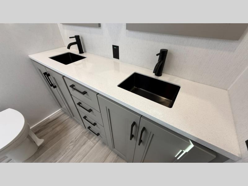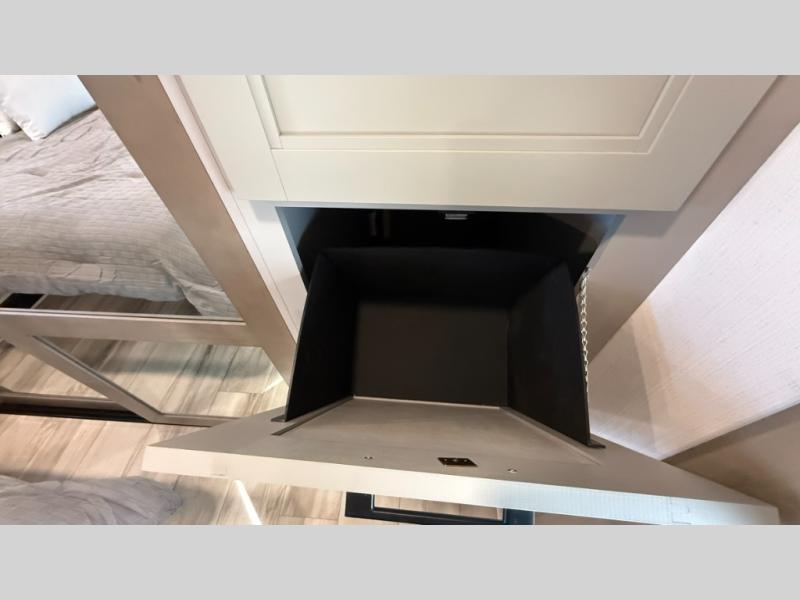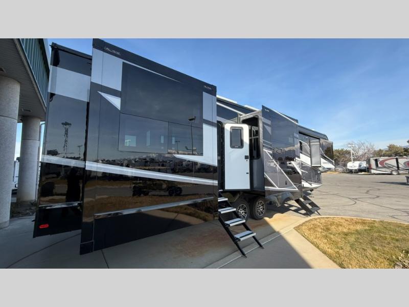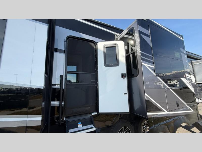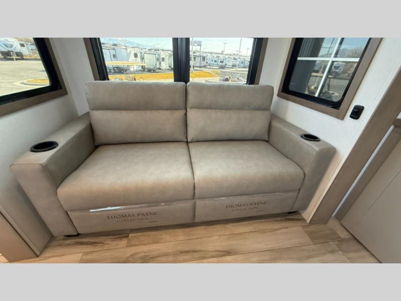 Experience the pinnacle of luxury fifth-wheel living! Retreat to the serene bedroom, featuring an electric tilt king bed with drawers under the bed, a spacious wardrobe, and washer/dryer prep. Enjoy entertainment on the 39” Smart LED TV and ample storage in the dresser. The gourmet kitchen is equipped with a pantry, 26 cu. refrigerator, convection microwave, and sliding table/desk for effortless dining and work-from-home convenience. The living room is a haven of relaxation, boasting a stunning 65” Smart LED TV, warm fireplace, theater seating, and double hide-a-bed sofas ideal for hosting guests with ease. Unwind in style in the full bathroom, featuring a dual sink vanity and ample storage. Also, enjoy the convenience of two entry/two exit doors. This fifth wheel is a masterpiece of comfort, style, and functionality, perfect for full-time living.