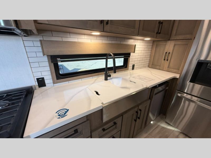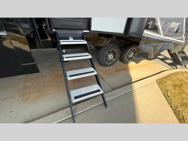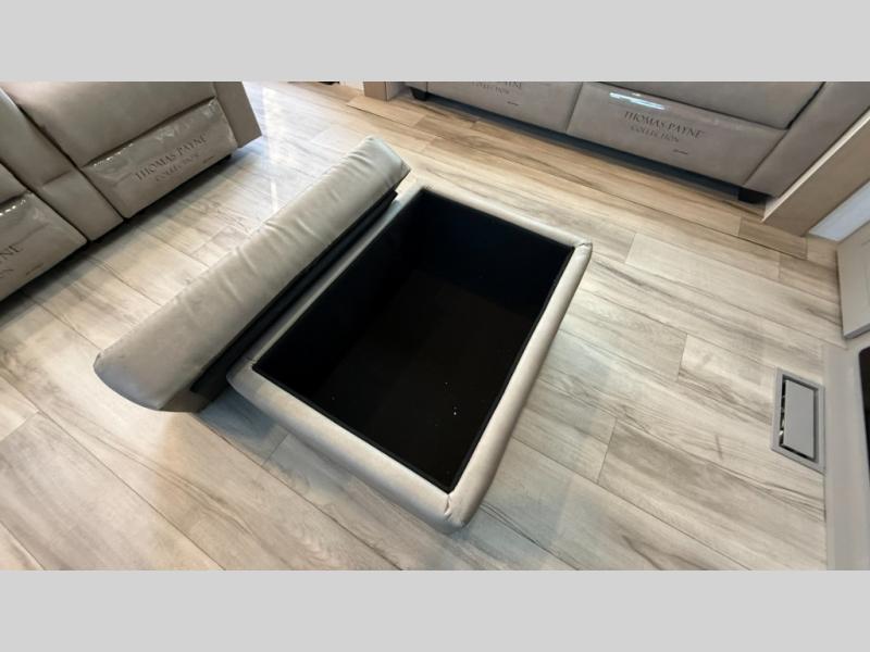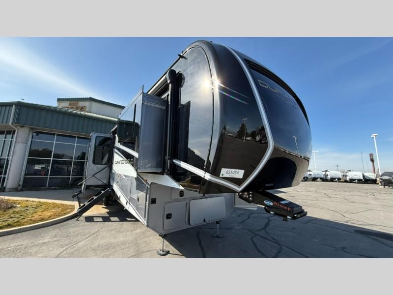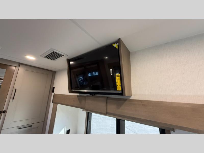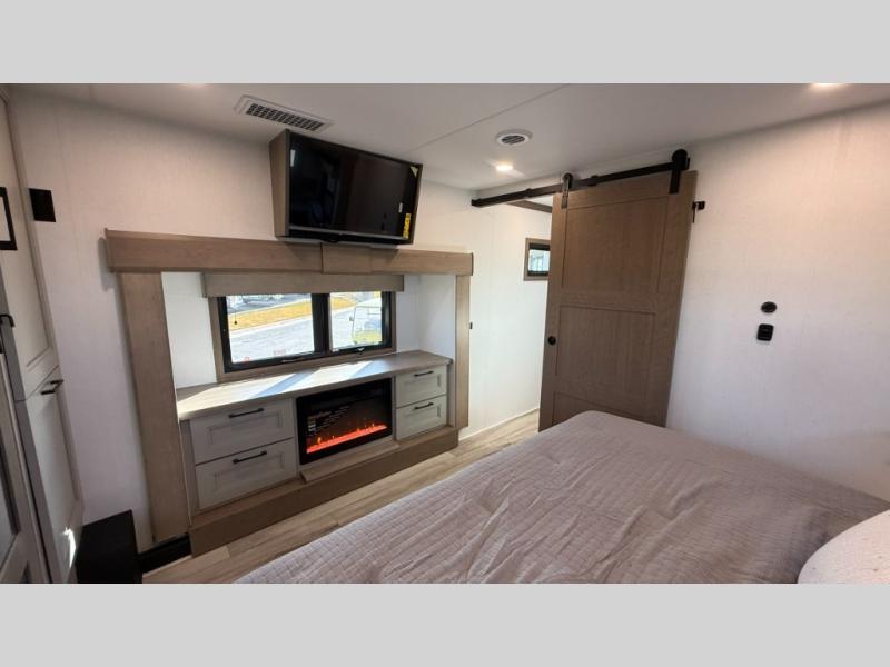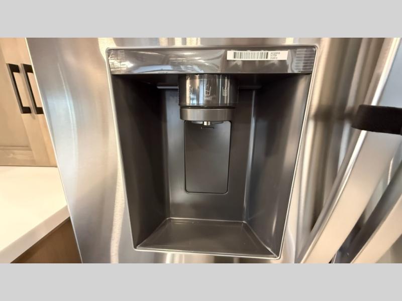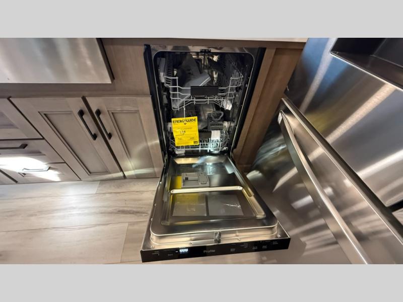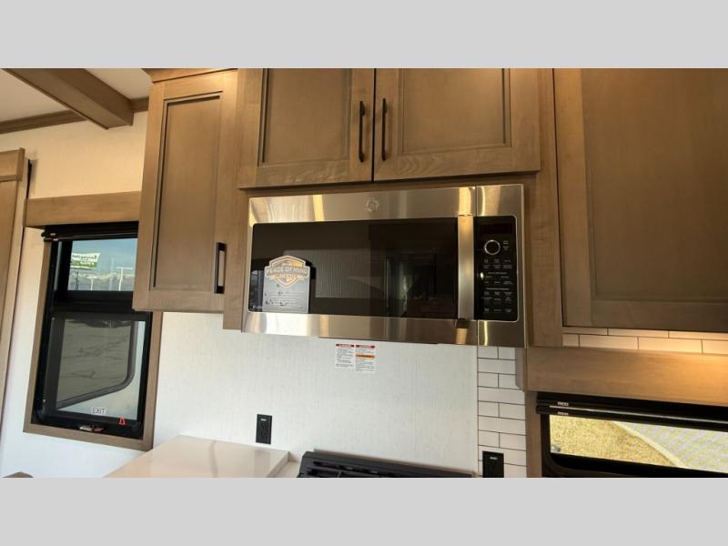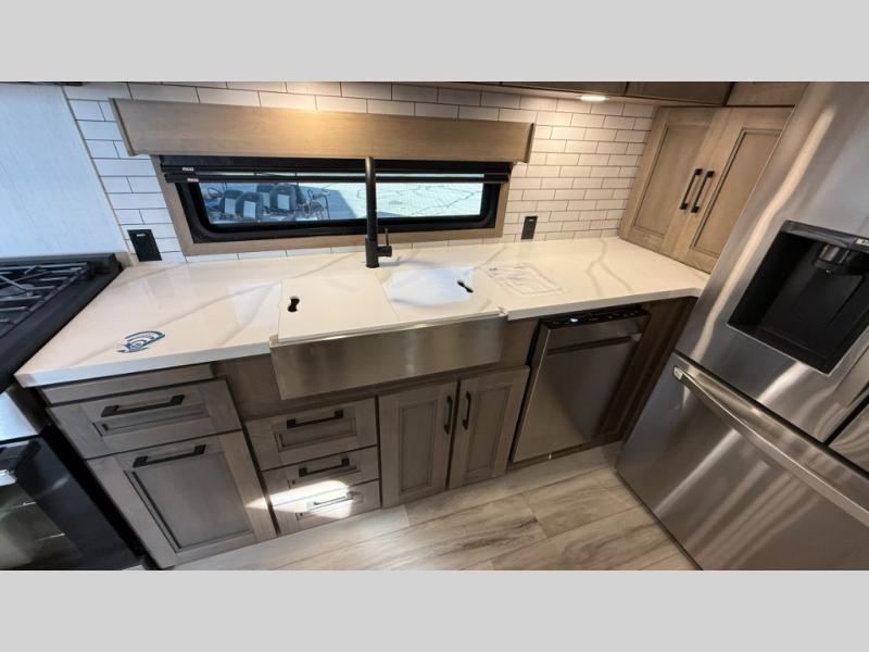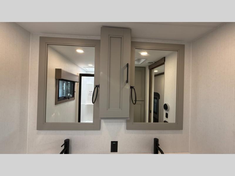 Experience the pinnacle of luxury fifth-wheel living! Retreat to the serene bedroom, featuring an electric tilt king bed with drawers under the bed, a spacious wardrobe, and washer/dryer prep. Enjoy entertainment on the 39” Smart LED TV and ample storage in the dresser. The gourmet kitchen is equipped with a pantry, 26 cu. refrigerator, convection microwave, and sliding table/desk for effortless dining and work-from-home convenience. The living room is a haven of relaxation, boasting a stunning 65” Smart LED TV, warm fireplace, theater seating, and double hide-a-bed sofas ideal for hosting guests with ease. Unwind in style in the full bathroom, featuring a dual sink vanity and ample storage. Also, enjoy the convenience of two entry/two exit doors. This fifth wheel is a masterpiece of comfort, style, and functionality, perfect for full-time living.