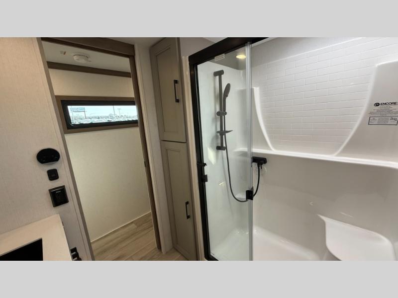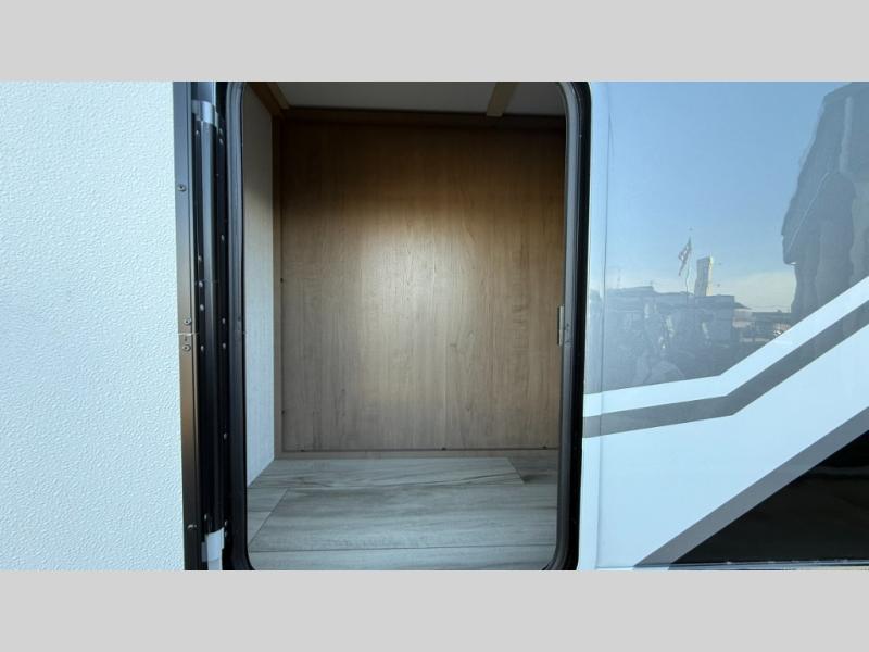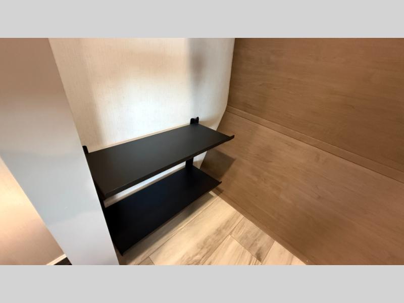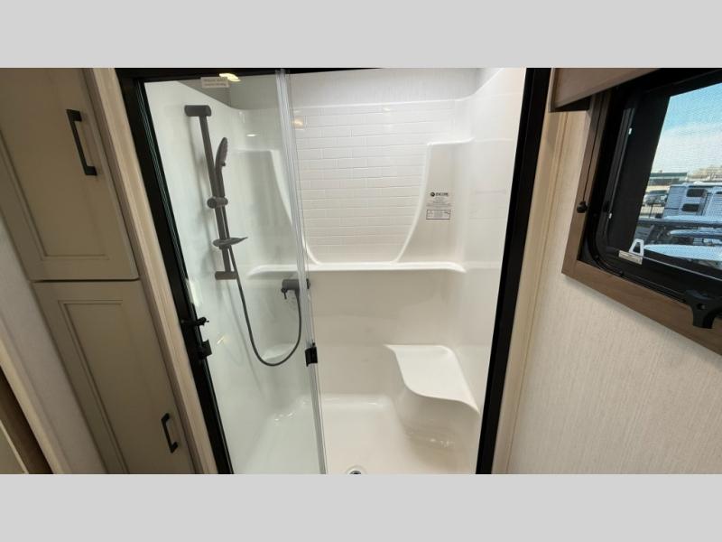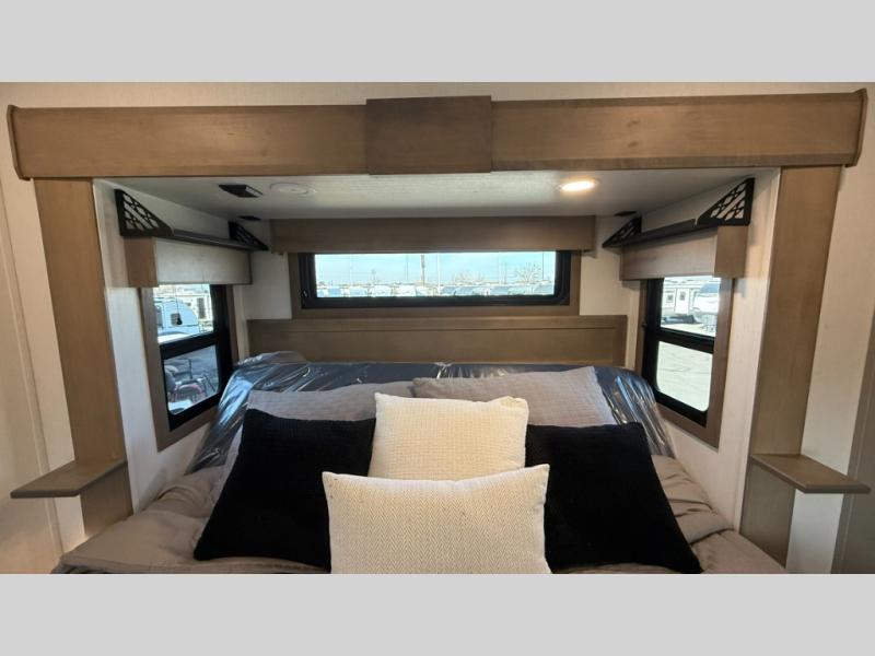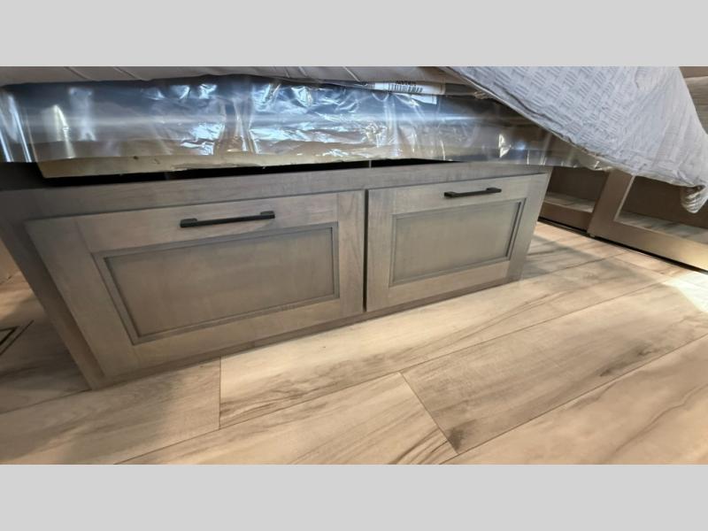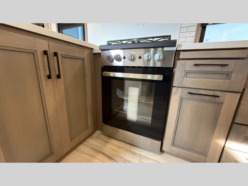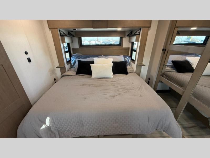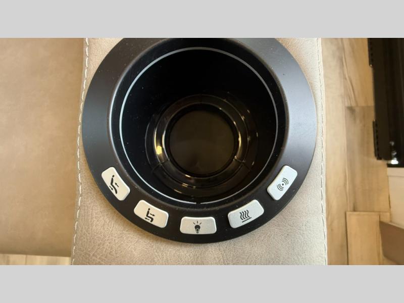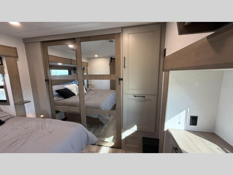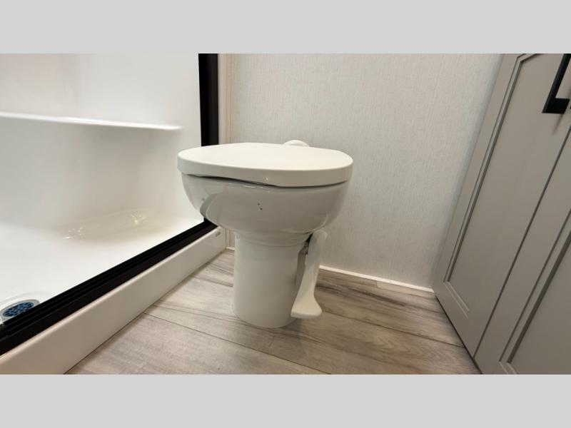 Experience the pinnacle of luxury fifth-wheel living! Retreat to the serene bedroom, featuring an electric tilt king bed with drawers under the bed, a spacious wardrobe, and washer/dryer prep. Enjoy entertainment on the 39” Smart LED TV and ample storage in the dresser. The gourmet kitchen is equipped with a pantry, 26 cu. refrigerator, convection microwave, and sliding table/desk for effortless dining and work-from-home convenience. The living room is a haven of relaxation, boasting a stunning 65” Smart LED TV, warm fireplace, theater seating, and double hide-a-bed sofas ideal for hosting guests with ease. Unwind in style in the full bathroom, featuring a dual sink vanity and ample storage. Also, enjoy the convenience of two entry/two exit doors. This fifth wheel is a masterpiece of comfort, style, and functionality, perfect for full-time living.