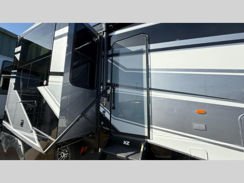 With any KZ Durango Gold full-time luxury fifth wheel, you will enjoy the new Blancher Maple and Morel Fog cabinetry, stainless steel appliances such as a 30" convection microwave and 24" oven with a four burner range, plus a stainless dishwasher. Other top features include an electric tilt bed with Serta Comfort foam king mattress, three 15K A/C units, plus theater seating with powered recline, heat and massage features. You will also appreciate a handy central vacuum system with attachments that stores out of sight. Each Durango Gold is constructed with six-sided aluminum framing, and has a heated, insulated and an enclosed underbelly. It is also constructed with Tufflex roofing material which is flexible, puncture resistant, and reflective. The now mandatory "Off The Grid" solar package includes two 200W solar panels, a 30A MPPT solar charge controller, and a 2,000W True Sine Wave inverter for off-grid capabilities.