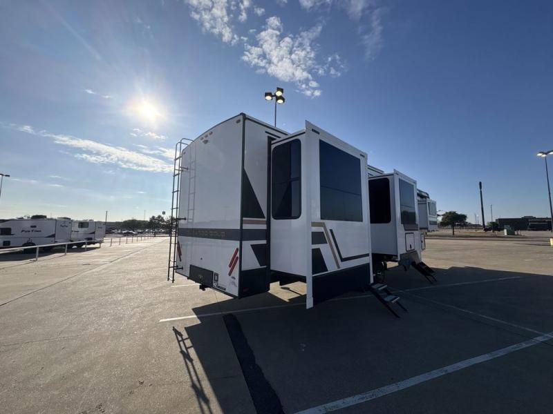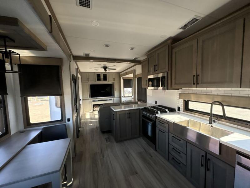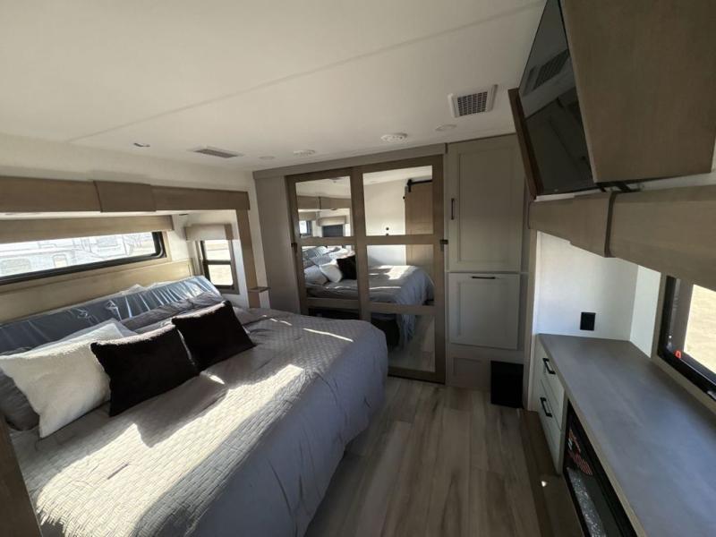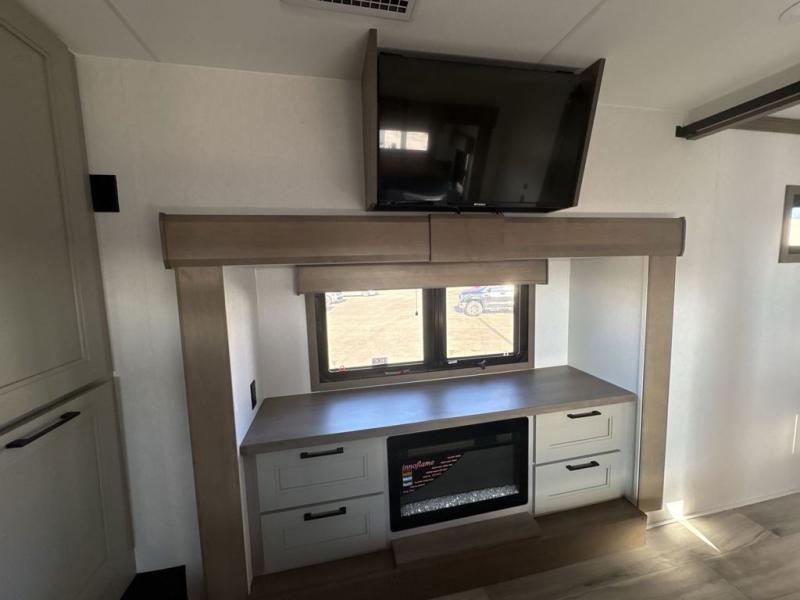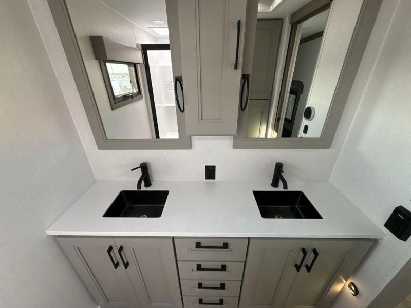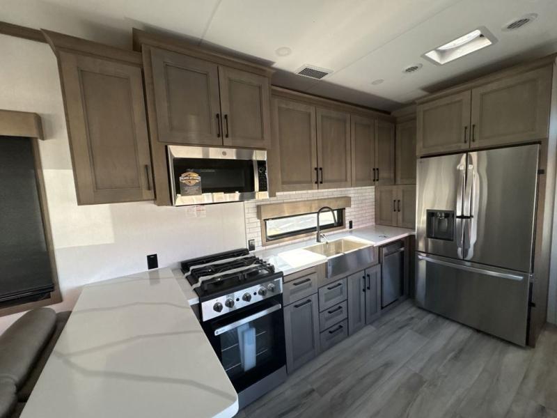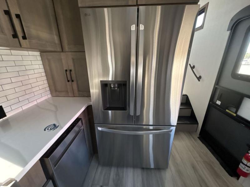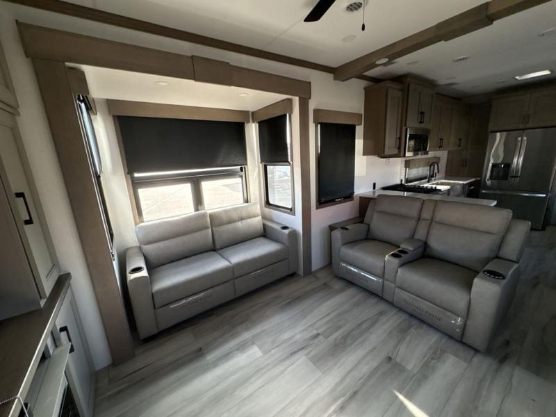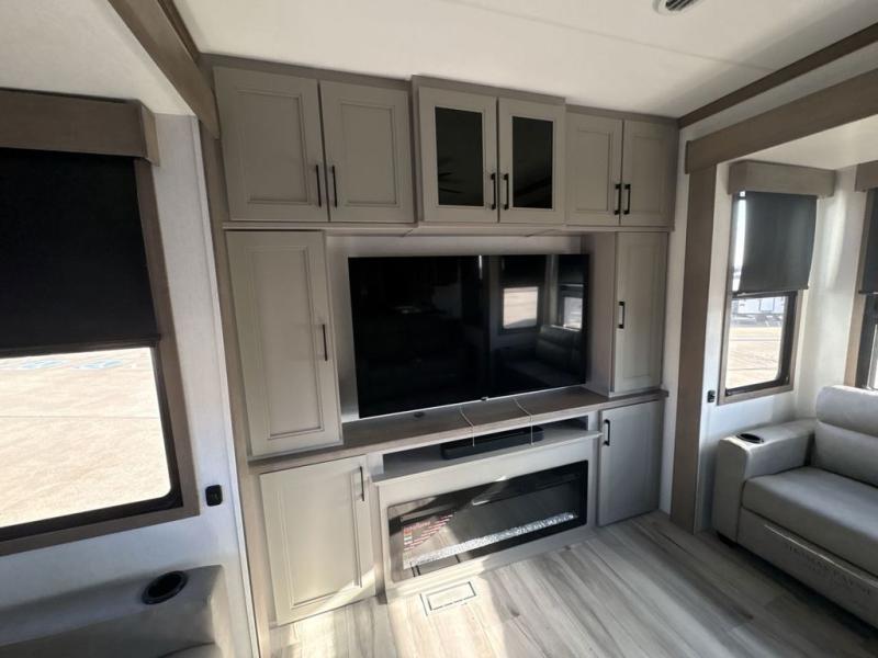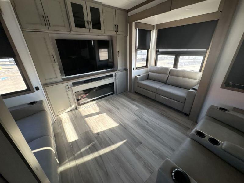 Experience the pinnacle of luxury fifth-wheel living! Retreat to the serene bedroom, featuring an electric tilt king bed with drawers under the bed, a spacious wardrobe, and washer/dryer prep. Enjoy entertainment on the 39” Smart LED TV and ample storage in the dresser. The gourmet kitchen is equipped with a pantry, 26 cu. refrigerator, convection microwave, and sliding table/desk for effortless dining and work-from-home convenience. The living room is a haven of relaxation, boasting a stunning 65” Smart LED TV, warm fireplace, theater seating, and double hide-a-bed sofas ideal for hosting guests with ease. Unwind in style in the full bathroom, featuring a dual sink vanity and ample storage. Also, enjoy the convenience of two entry/two exit doors. This fifth wheel is a masterpiece of comfort, style, and functionality, perfect for full-time living.