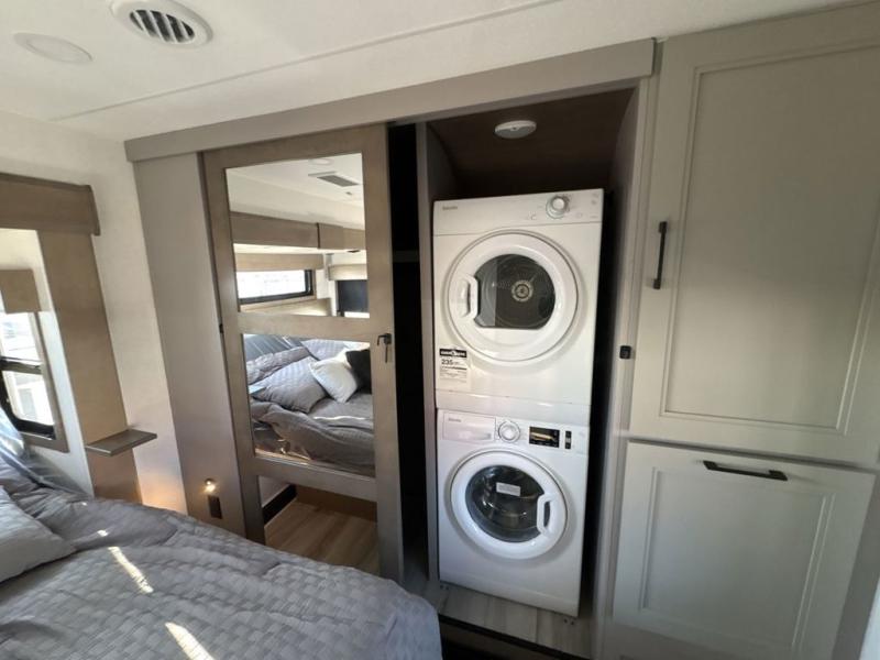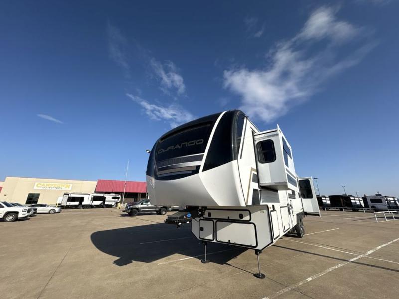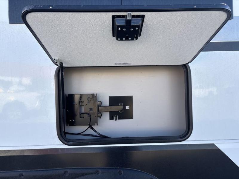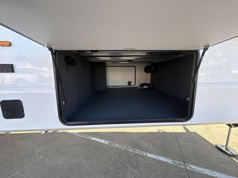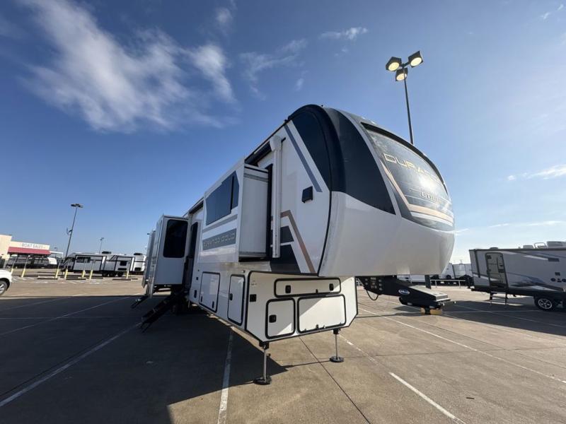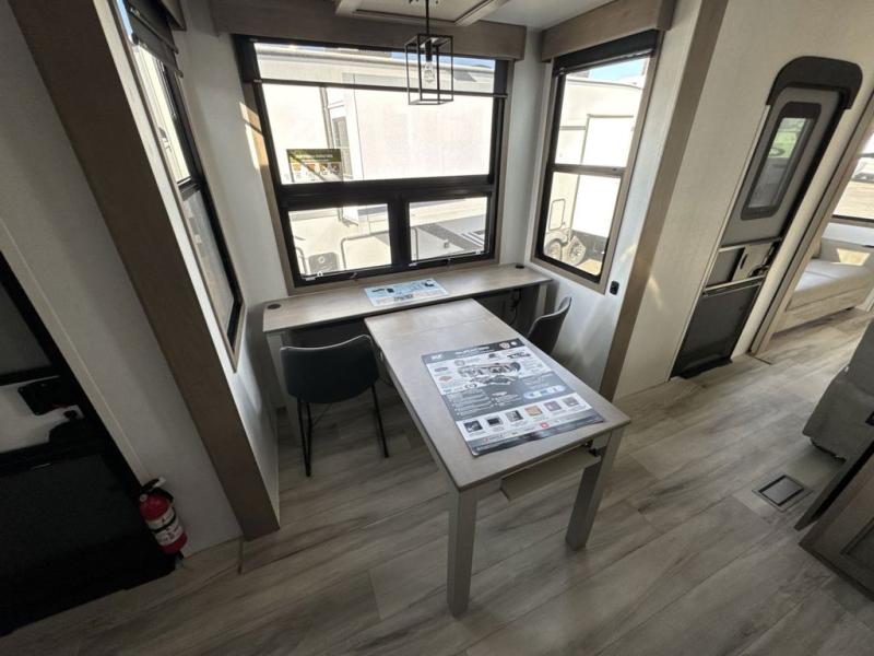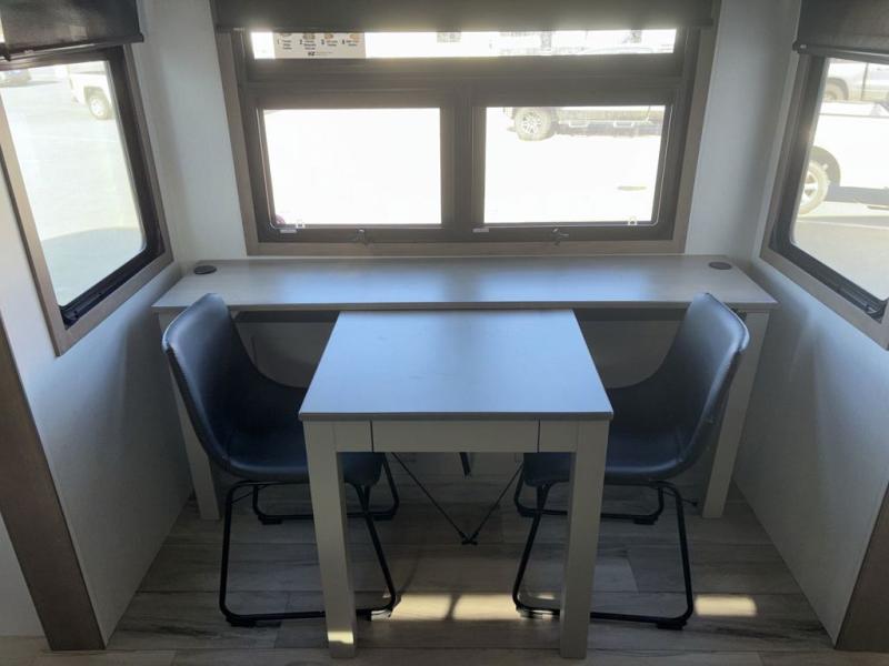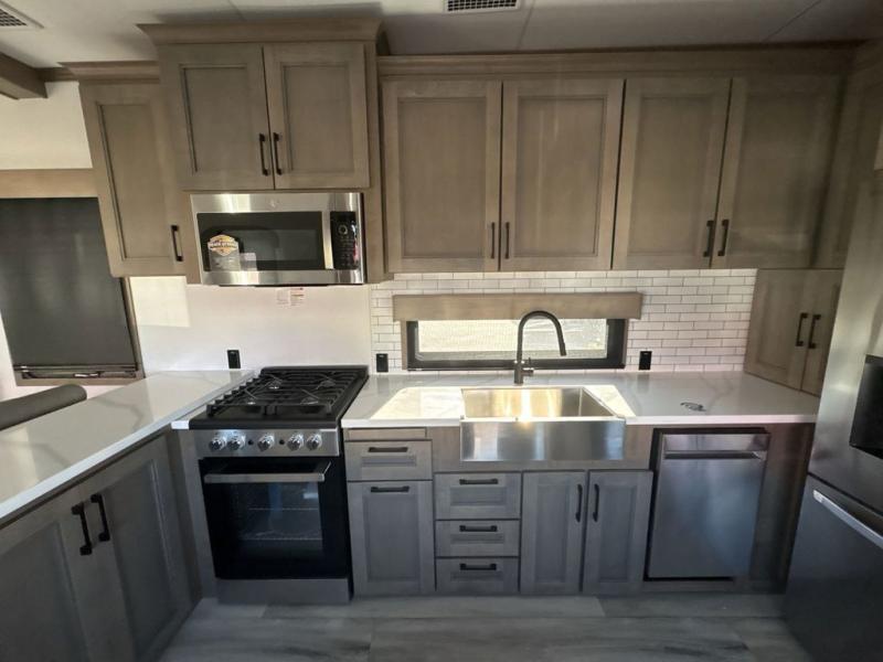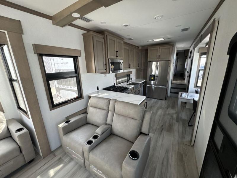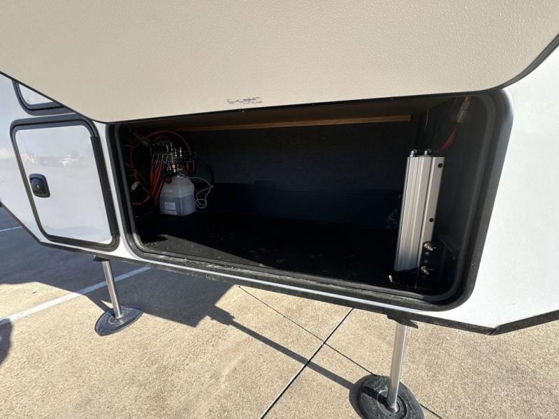 Experience the pinnacle of luxury fifth-wheel living! Retreat to the serene bedroom, featuring an electric tilt king bed with drawers under the bed, a spacious wardrobe, and washer/dryer prep. Enjoy entertainment on the 39” Smart LED TV and ample storage in the dresser. The gourmet kitchen is equipped with a pantry, 26 cu. refrigerator, convection microwave, and sliding table/desk for effortless dining and work-from-home convenience. The living room is a haven of relaxation, boasting a stunning 65” Smart LED TV, warm fireplace, theater seating, and double hide-a-bed sofas ideal for hosting guests with ease. Unwind in style in the full bathroom, featuring a dual sink vanity and ample storage. Also, enjoy the convenience of two entry/two exit doors. This fifth wheel is a masterpiece of comfort, style, and functionality, perfect for full-time living.