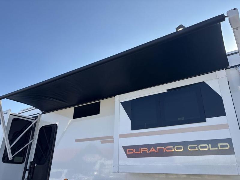 With any KZ Durango Gold full-time luxury fifth wheel, you will enjoy the new Blancher Maple and Morel Fog cabinetry, stainless steel appliances such as a 30" convection microwave and 24" oven with a four burner range, plus a stainless dishwasher. Other top features include an electric tilt bed with Serta Comfort foam king mattress, three 15K A/C units, plus theater seating with powered recline, heat and massage features. You will also appreciate a handy central vacuum system with attachments that stores out of sight. Each Durango Gold is constructed with six-sided aluminum framing, and has a heated, insulated and an enclosed underbelly. It is also constructed with Tufflex roofing material which is flexible, puncture resistant, and reflective. The now mandatory "Off The Grid" solar package includes two 200W solar panels, a 30A MPPT solar charge controller, and a 2,000W True Sine Wave inverter for off-grid capabilities.