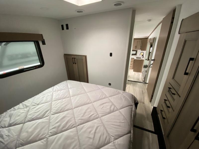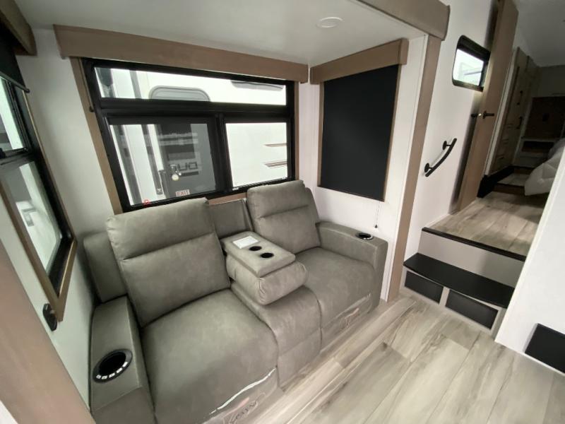 Experience luxury on wheels with this stunning fifth wheel! This unit bedroom features a queen bed, a spacious wardrobe, and a convenient linen closet for an effortless organization with washer/dryer prep. The kitchen is a culinary dream, equipped with a pantry, 12 cu. refrigerator, microwave, and three-burner cooktop for gourmet meal prep. Enjoy meals with family and friends at the dinette, featuring an EZ adjustable table for customizable comfort. The living room boasts an entertainment center and a hide-a-bed sofa for extra sleeping space. Take a bath in this unit's full bathroom, featuring a spacious 36” x 30” shower. You can also, enjoy the convenience of pass-thru storage and relax under the shade of the 18’ awning.