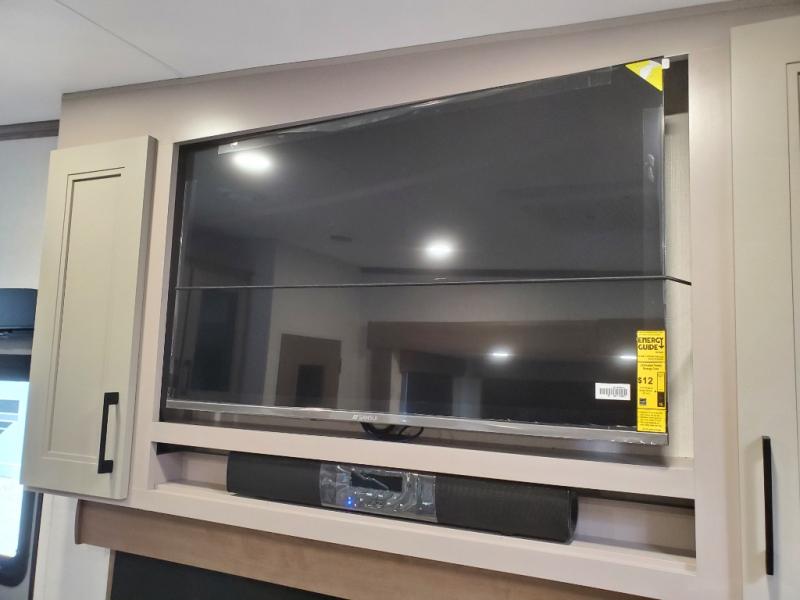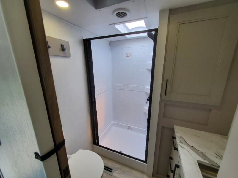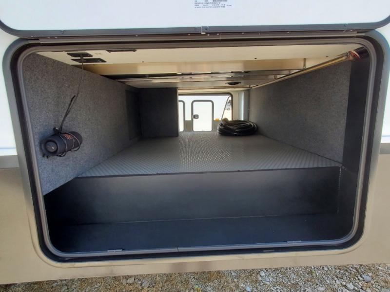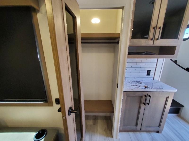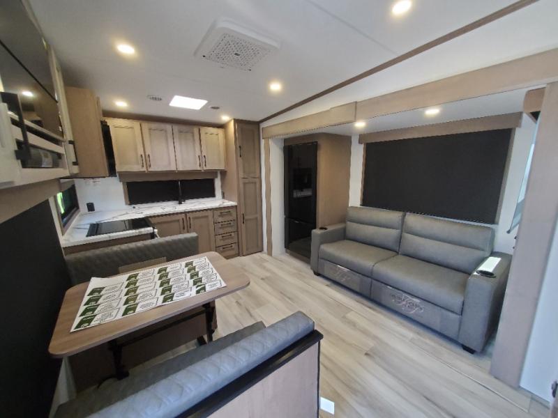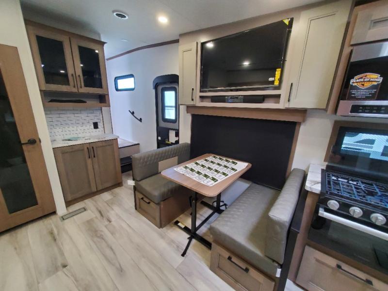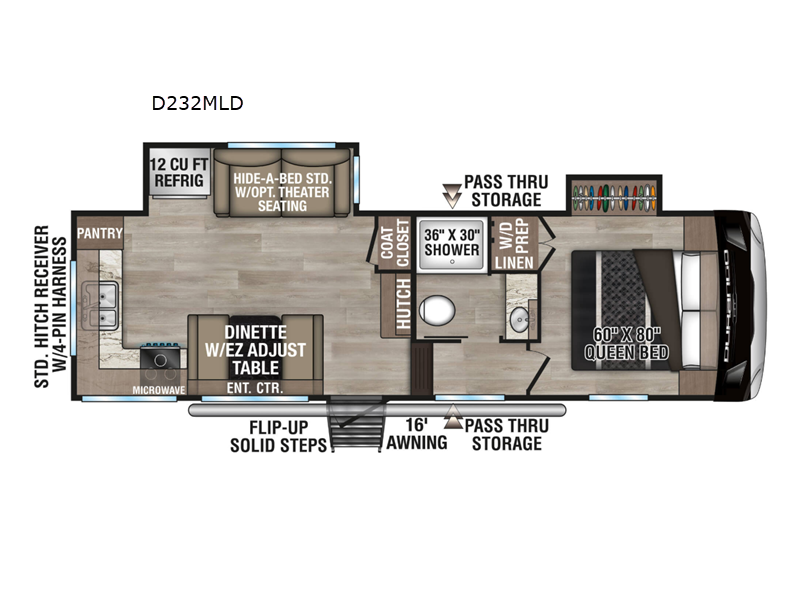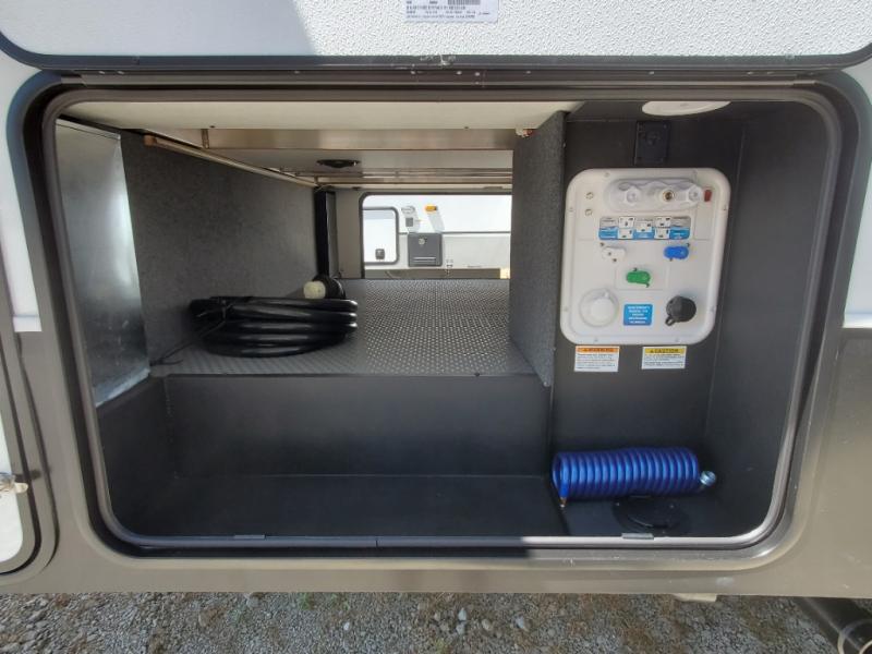 This fifth wheel has everything you need and more. Retreat to the serene bedroom, featuring a queen bed, spacious wardrobe, and washer/dryer prep for effortless laundry days. The kitchen is equipped with a pantry, 12-cu. refrigerator, and microwave for quick and easy meal prep. Enjoy meals with family and friends at the dinette, which features an EZ-adjustable table for customizable comfort. The living room boasts an entertainment center, hutch, and coat closet for ample storage. Relax in style in the full bathroom, featuring a spacious 36” x 30” shower. Finally, enjoy the convenience of pass-thru storage and stay in touch with nature under the shade of the 16“awning.