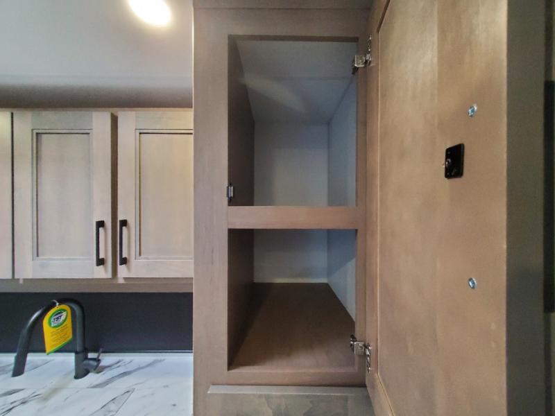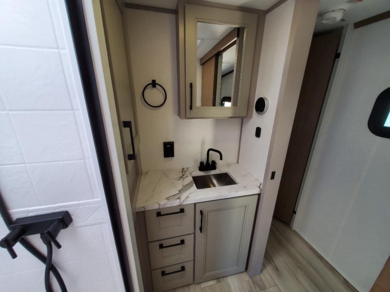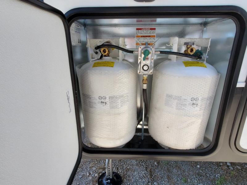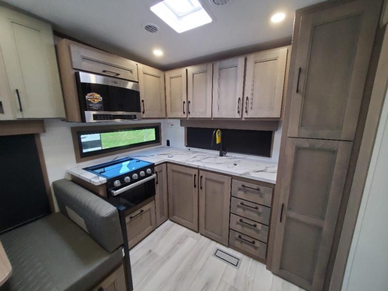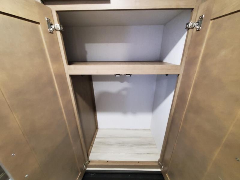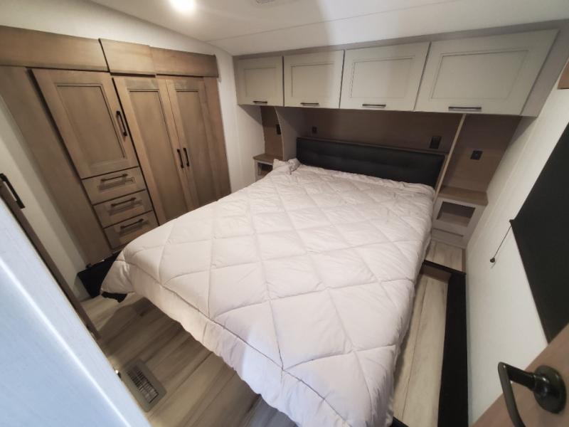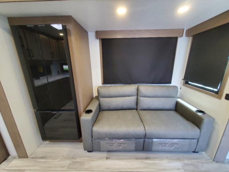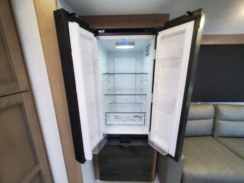 This fifth wheel has everything you need and more. Retreat to the serene bedroom, featuring a queen bed, spacious wardrobe, and washer/dryer prep for effortless laundry days. The kitchen is equipped with a pantry, 12-cu. refrigerator, and microwave for quick and easy meal prep. Enjoy meals with family and friends at the dinette, which features an EZ-adjustable table for customizable comfort. The living room boasts an entertainment center, hutch, and coat closet for ample storage. Relax in style in the full bathroom, featuring a spacious 36” x 30” shower. Finally, enjoy the convenience of pass-thru storage and stay in touch with nature under the shade of the 16“awning.