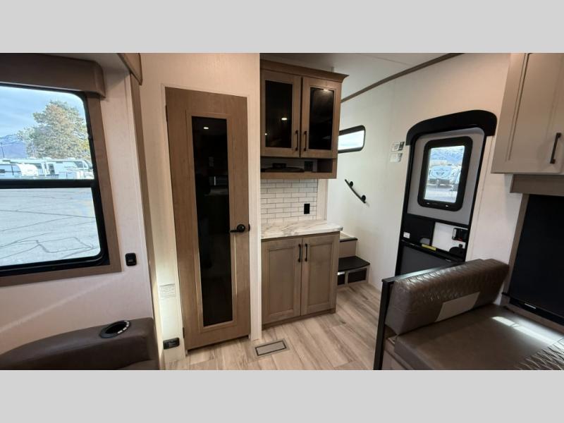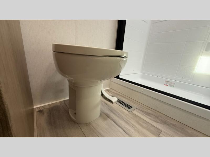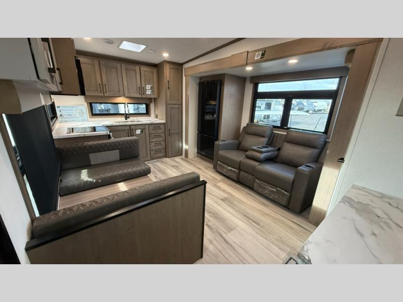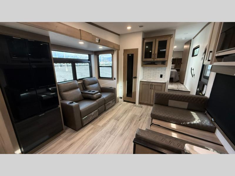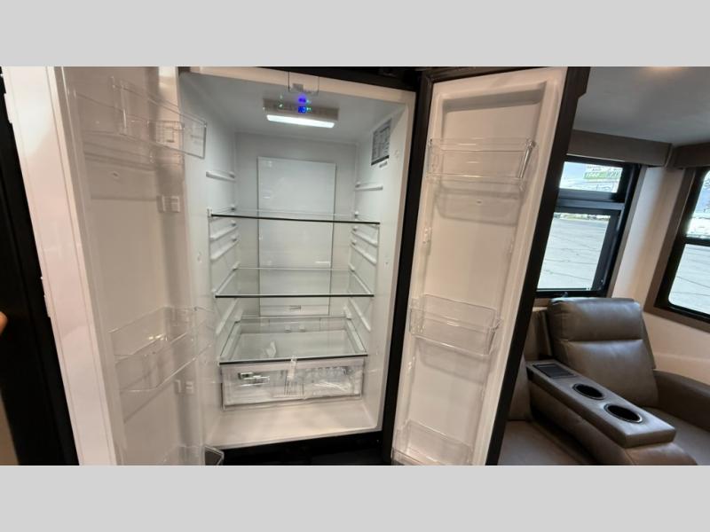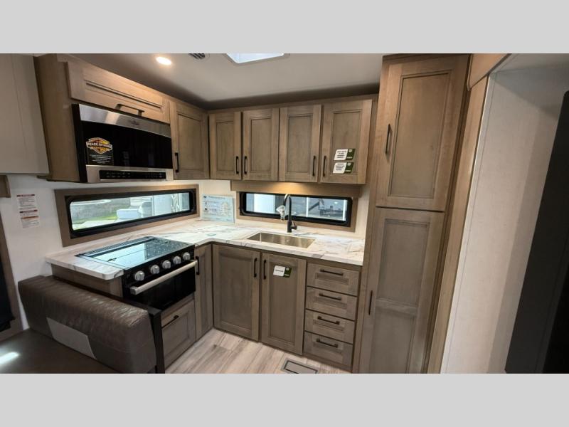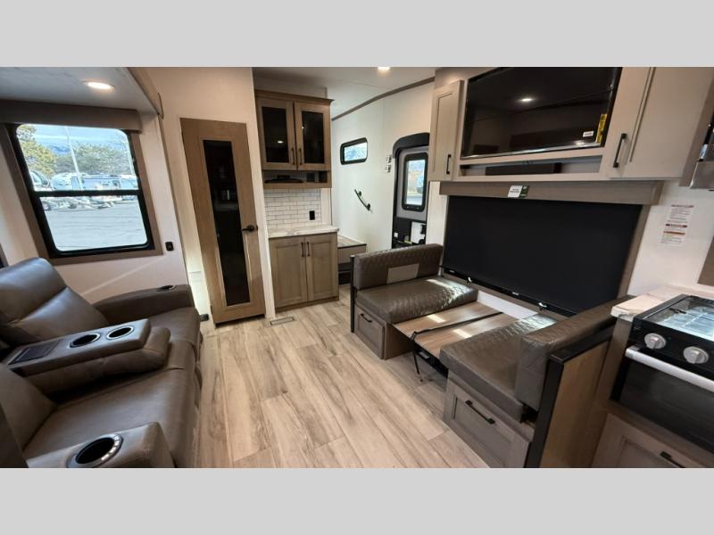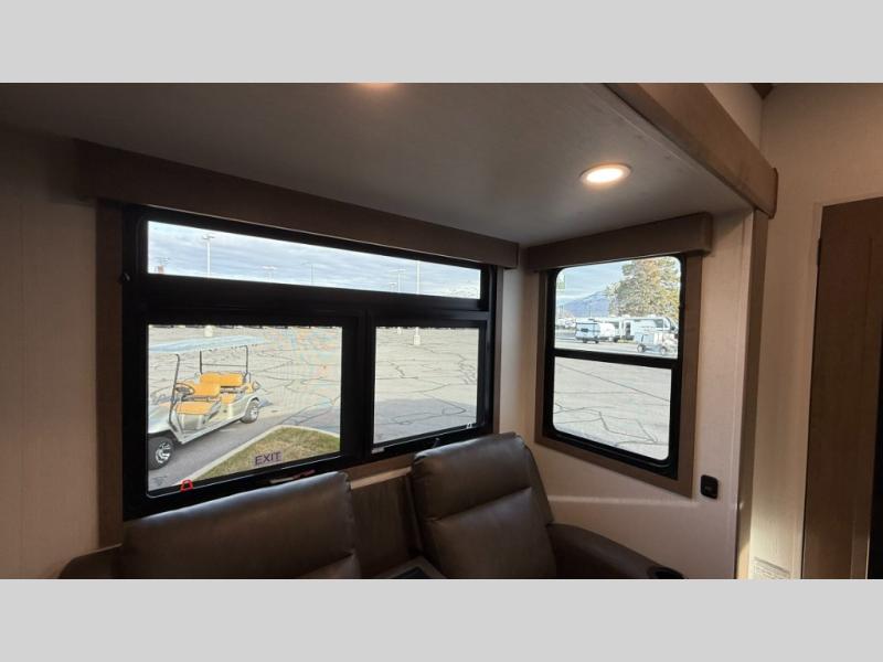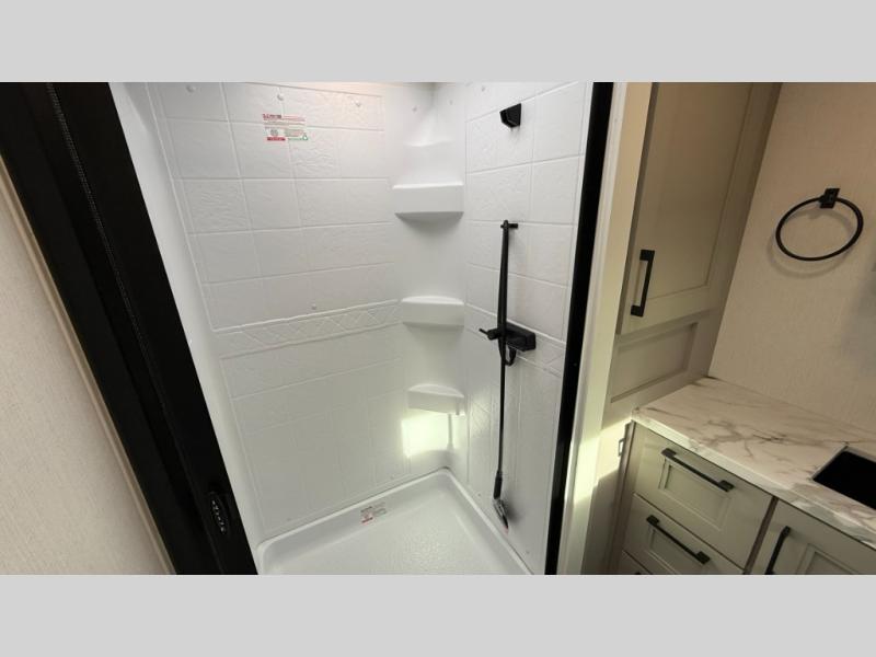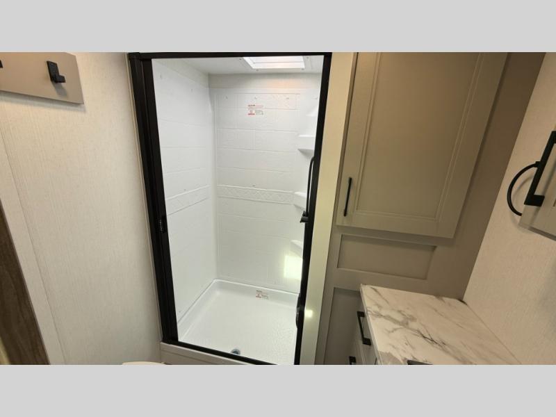 This fifth wheel has everything you need and more. Retreat to the serene bedroom, featuring a queen bed, spacious wardrobe, and washer/dryer prep for effortless laundry days. The kitchen is equipped with a pantry, 12-cu. refrigerator, and microwave for quick and easy meal prep. Enjoy meals with family and friends at the dinette, which features an EZ-adjustable table for customizable comfort. The living room boasts an entertainment center, hutch, and coat closet for ample storage. Relax in style in the full bathroom, featuring a spacious 36” x 30” shower. Finally, enjoy the convenience of pass-thru storage and stay in touch with nature under the shade of the 16“awning.