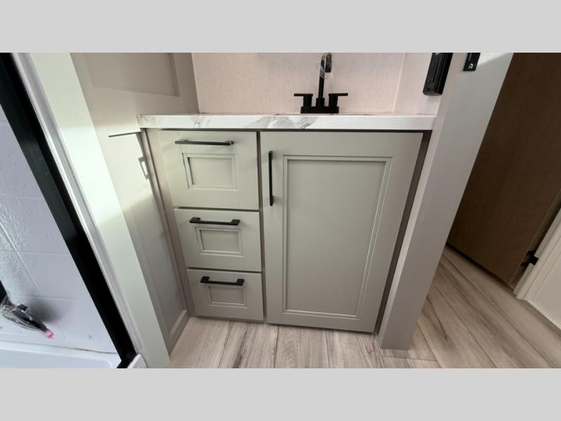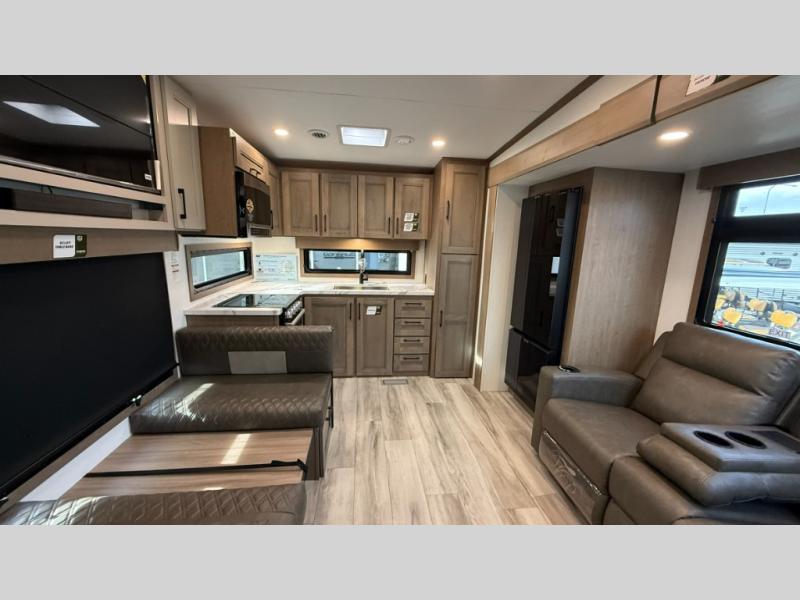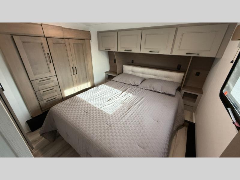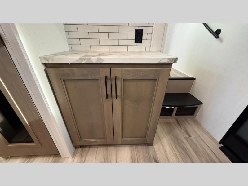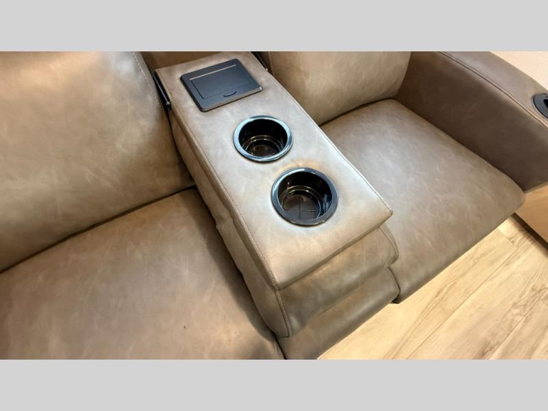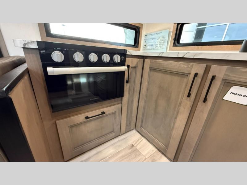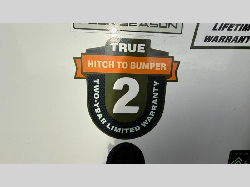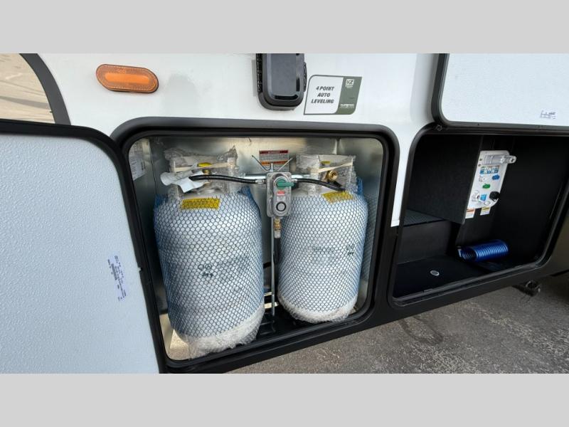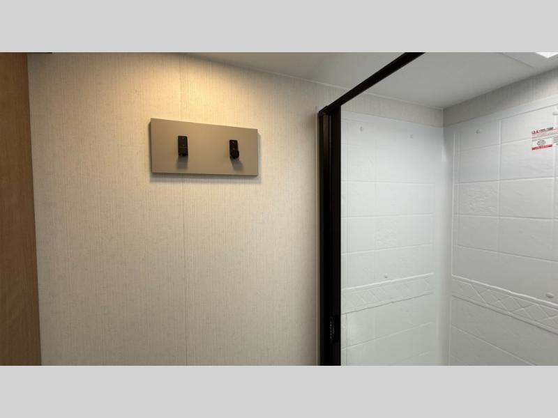 This fifth wheel has everything you need and more. Retreat to the serene bedroom, featuring a queen bed, spacious wardrobe, and washer/dryer prep for effortless laundry days. The kitchen is equipped with a pantry, 12-cu. refrigerator, and microwave for quick and easy meal prep. Enjoy meals with family and friends at the dinette, which features an EZ-adjustable table for customizable comfort. The living room boasts an entertainment center, hutch, and coat closet for ample storage. Relax in style in the full bathroom, featuring a spacious 36” x 30” shower. Finally, enjoy the convenience of pass-thru storage and stay in touch with nature under the shade of the 16“awning.