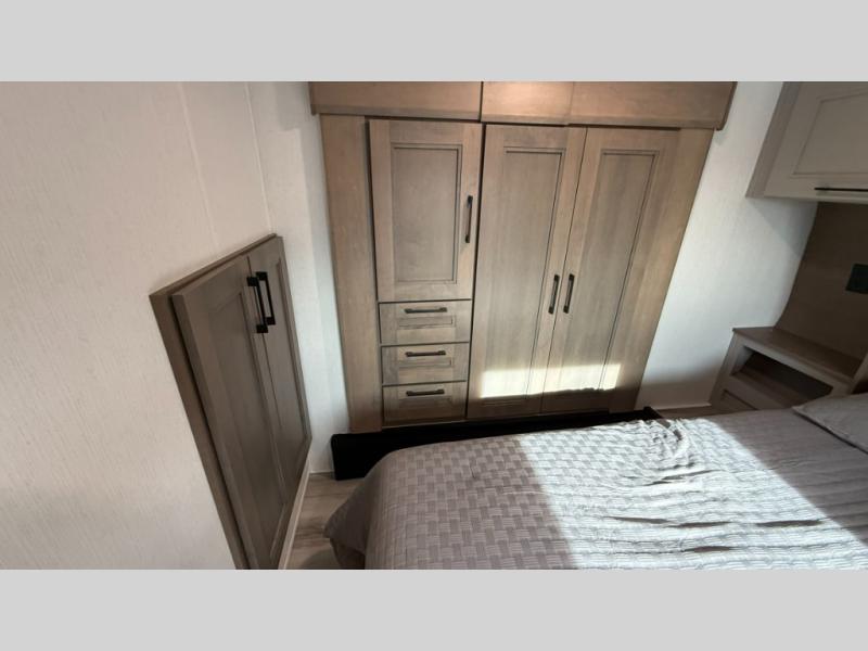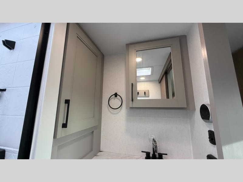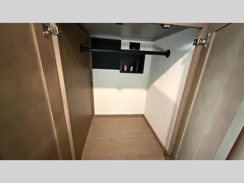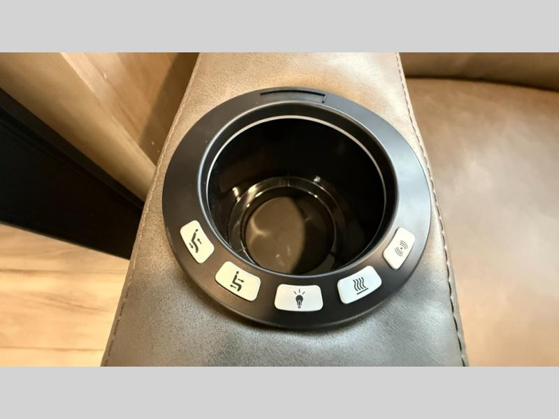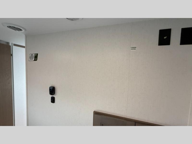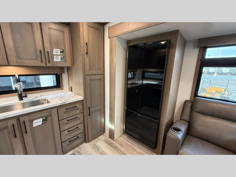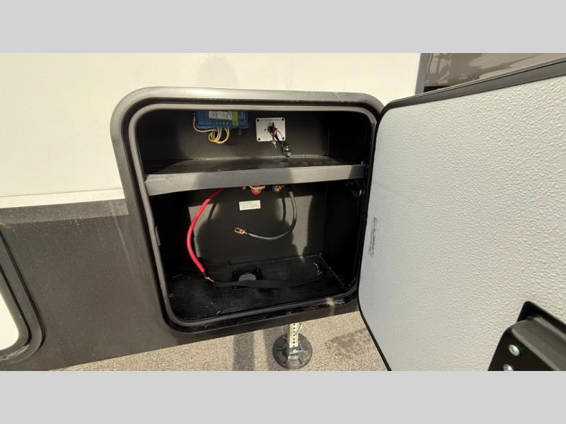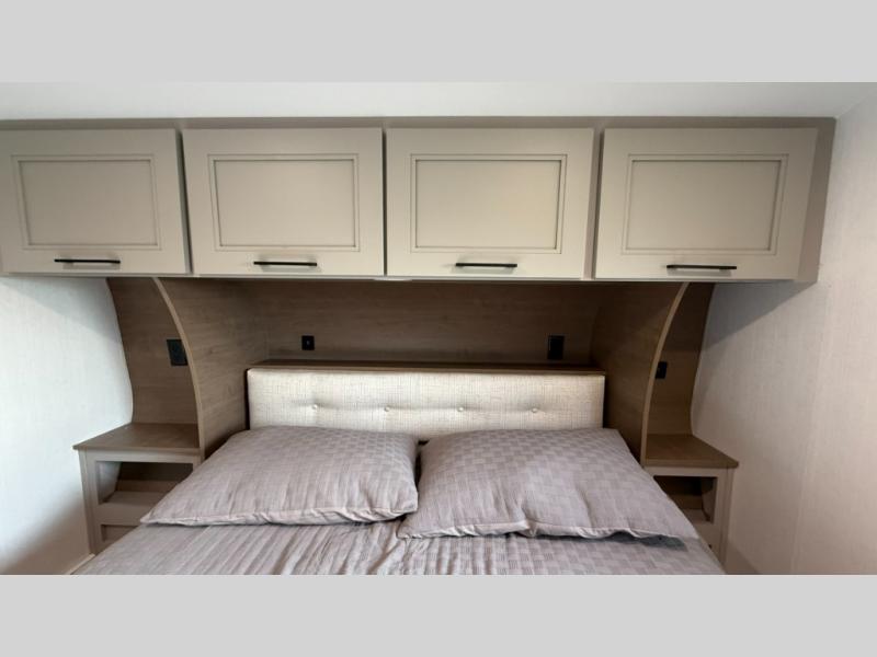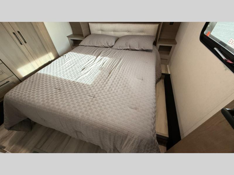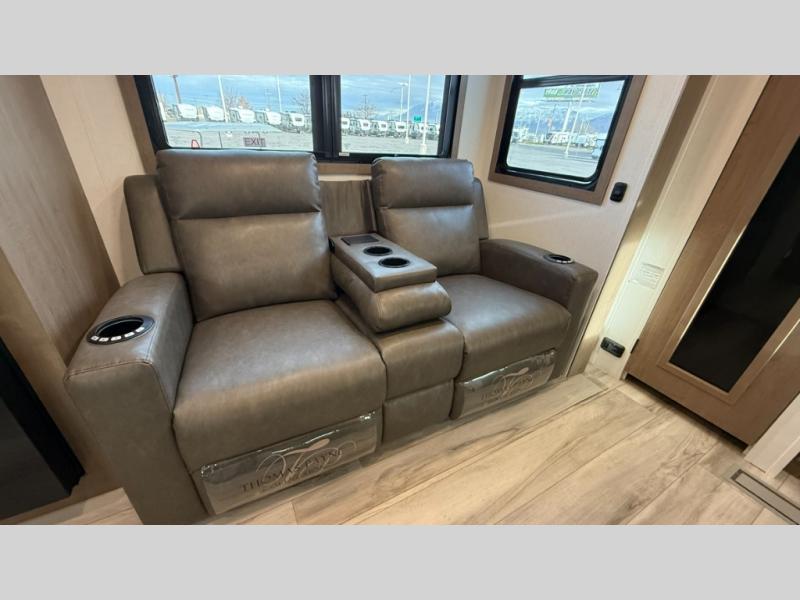 This fifth wheel has everything you need and more. Retreat to the serene bedroom, featuring a queen bed, spacious wardrobe, and washer/dryer prep for effortless laundry days. The kitchen is equipped with a pantry, 12-cu. refrigerator, and microwave for quick and easy meal prep. Enjoy meals with family and friends at the dinette, which features an EZ-adjustable table for customizable comfort. The living room boasts an entertainment center, hutch, and coat closet for ample storage. Relax in style in the full bathroom, featuring a spacious 36” x 30” shower. Finally, enjoy the convenience of pass-thru storage and stay in touch with nature under the shade of the 16“awning.