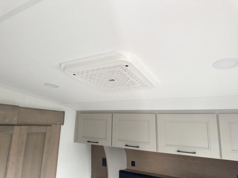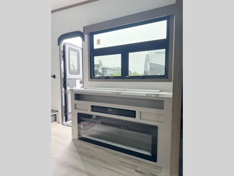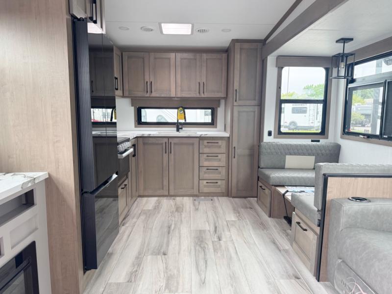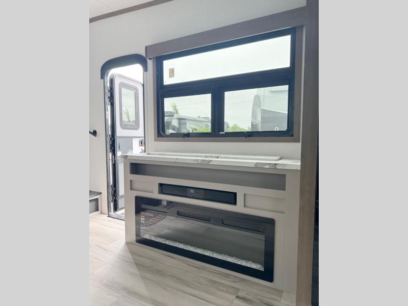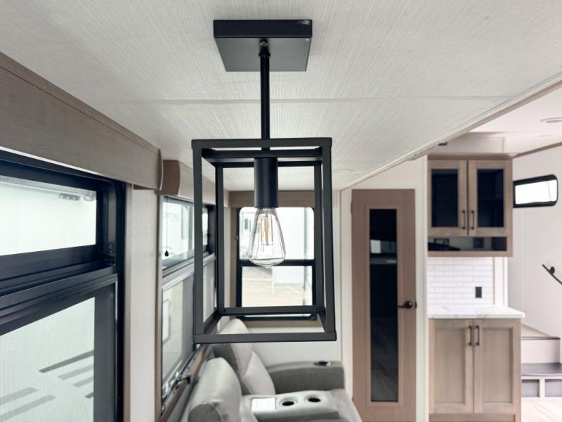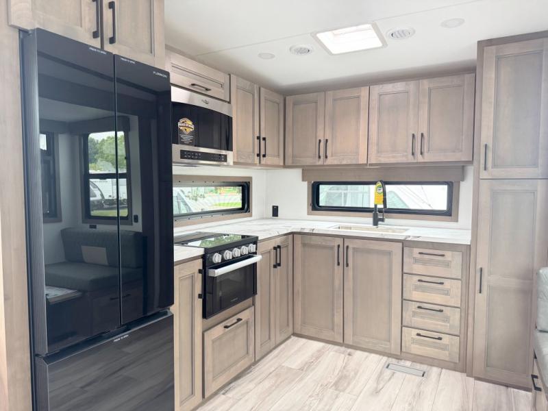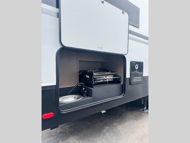 You'll fit right into this spacious fifth wheel for four! The rear kitchen includes plenty of counter space, a three burner drop-in cooktop, plus a spacious refrigerator and a pantry for food storage. Your crew can get cozy on the hide-a-bed sofa or choose the optional theater seating if you're not needing the extra sleeping space. The cook will also love having an outside kitchen with a griddle for pancakes in the morning! The dinette with EZ adjust table will give you a place to dine or play a game of cards, or you can sit outdoors under the 19' power awning with LED lights. The large 30" x 36" shower includes a skylight for more standing room and natural light, and the front private bedroom will provide you with your own space at night. Here, you'll find a queen bed with underbed storage, a wardrobe slide out, and a closet with washer and dryer prep that will make going full-time easier than ever!