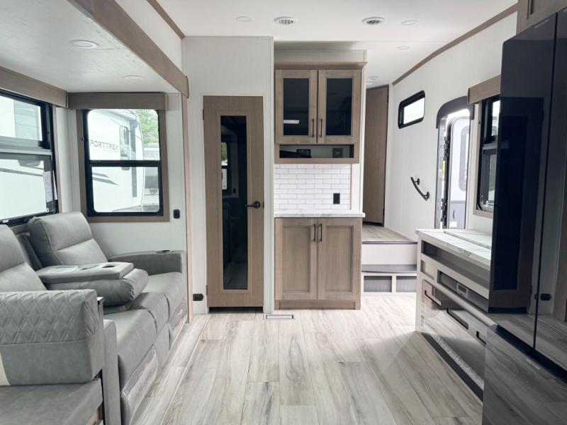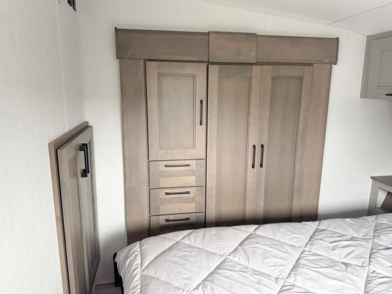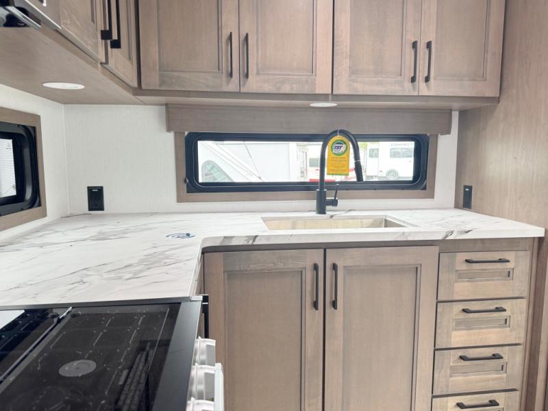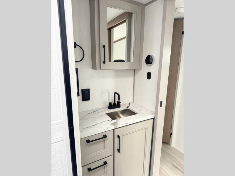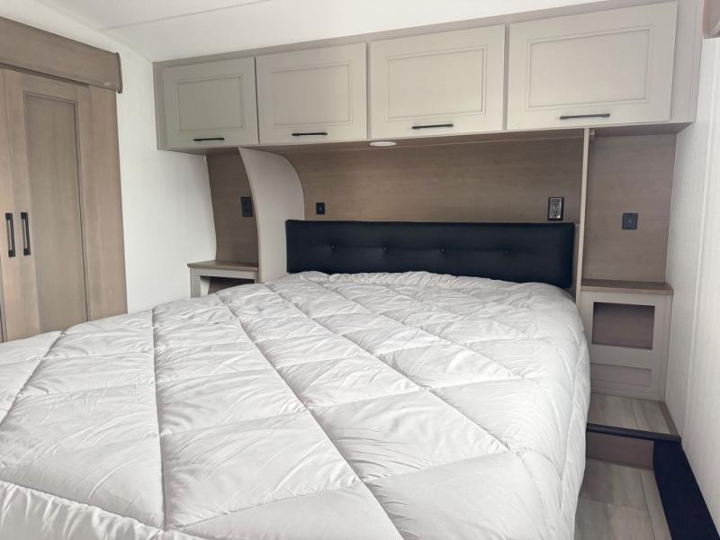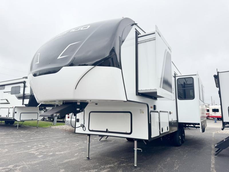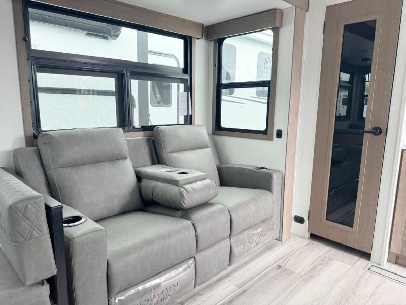 You'll fit right into this spacious fifth wheel for four! The rear kitchen includes plenty of counter space, a three burner drop-in cooktop, plus a spacious refrigerator and a pantry for food storage. Your crew can get cozy on the hide-a-bed sofa or choose the optional theater seating if you're not needing the extra sleeping space. The cook will also love having an outside kitchen with a griddle for pancakes in the morning! The dinette with EZ adjust table will give you a place to dine or play a game of cards, or you can sit outdoors under the 19' power awning with LED lights. The large 30" x 36" shower includes a skylight for more standing room and natural light, and the front private bedroom will provide you with your own space at night. Here, you'll find a queen bed with underbed storage, a wardrobe slide out, and a closet with washer and dryer prep that will make going full-time easier than ever!