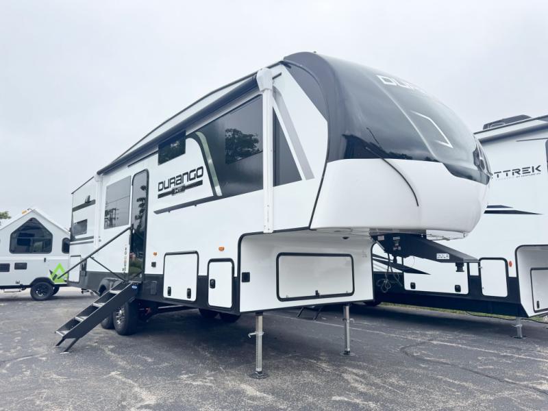 Each Durango Half-Ton fifth wheel by KZ provides lightweight towing with interior luxuries galore! Controlling the functions of your unit will be a breeze with the KZ Engage powered by OneControl that includes new integrated buttons & screen to control awnings, lights, tanks, and more. There are so many exterior conveniences to make each trip enjoyable, like the Dexter® axles with self adjusting brakes & height adjusting hangers metal latches on the baggage doors, heated water convenience center, and the flip-up main entry steps! Durable construction includes Tufflex PVC roofing, Pex® in-floor heated waterlines & kitchen gray pipes, and a reinforced heavy-duty fiberglass front cap. The interior will feel more like a residential home with new blancher cherry cabinets, seamless countertops, a spacious shower, a redesigned front bedroom, and smart storage spaces! You can also customize your fifth wheel to fit your needs with available options, such as, generator prep, wireless backup camera prep, a 32" exterior TV with bracket, and so much more!
