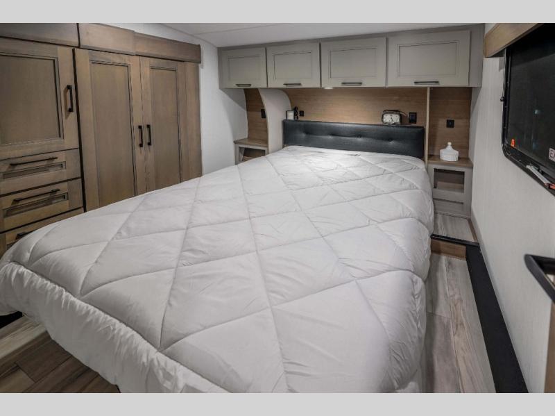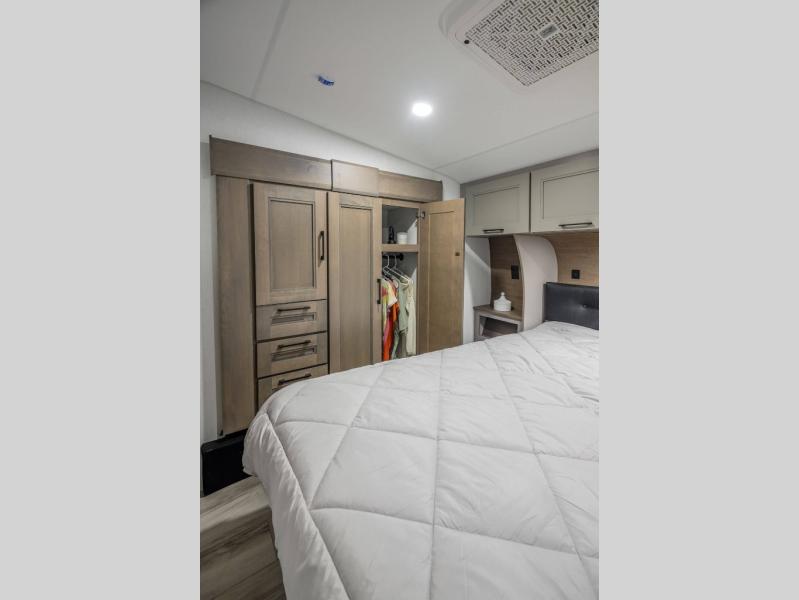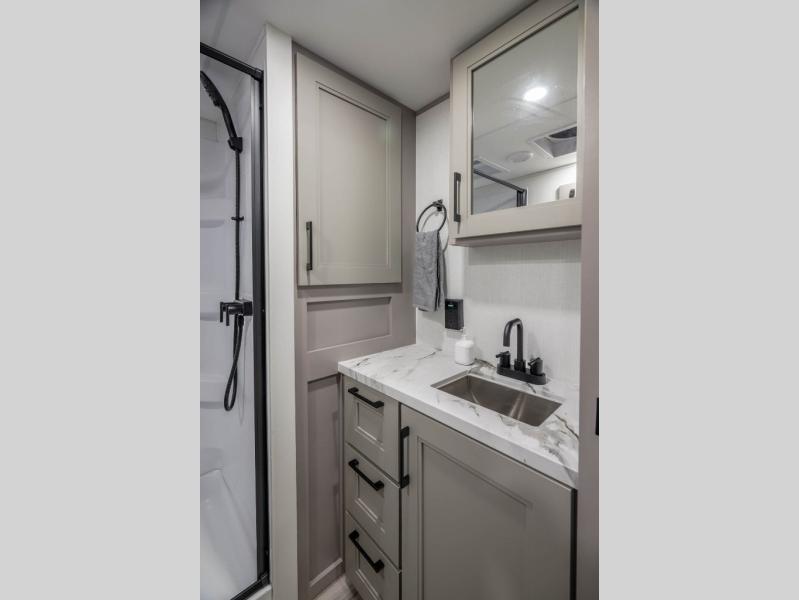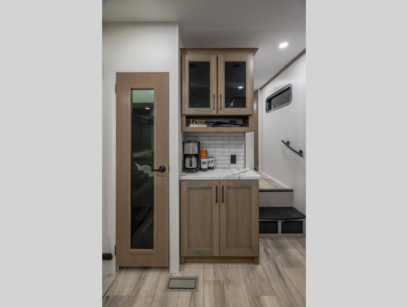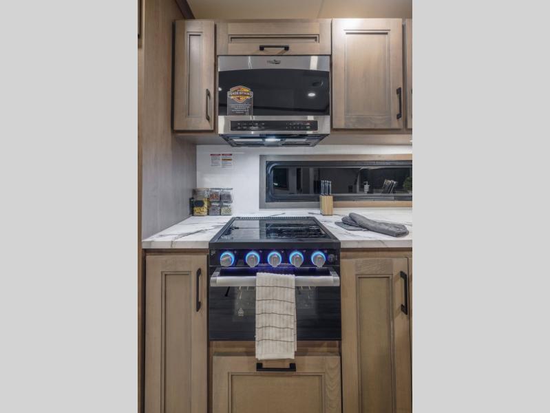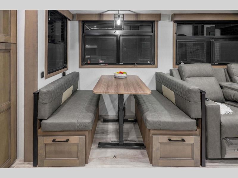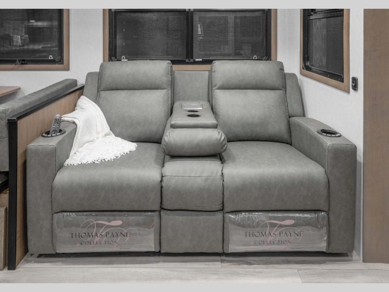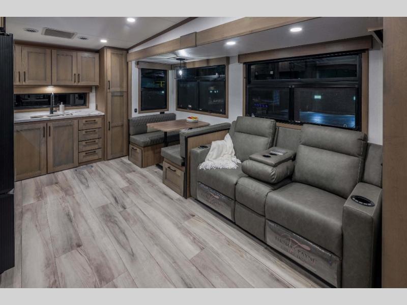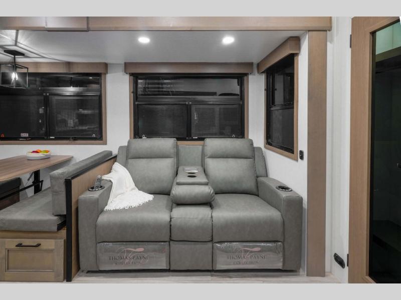 You'll fit right into this spacious fifth wheel for four! The rear kitchen includes plenty of counter space, a three burner drop-in cooktop, plus a spacious refrigerator and a pantry for food storage. Your crew can get cozy on the hide-a-bed sofa or choose the optional theater seating if you're not needing the extra sleeping space. The cook will also love having an outside kitchen with a griddle for pancakes in the morning! The dinette with EZ adjust table will give you a place to dine or play a game of cards, or you can sit outdoors under the 19' power awning with LED lights. The large 30" x 36" shower includes a skylight for more standing room and natural light, and the front private bedroom will provide you with your own space at night. Here, you'll find a queen bed with underbed storage, a wardrobe slide out, and a closet with washer and dryer prep that will make going full-time easier than ever!