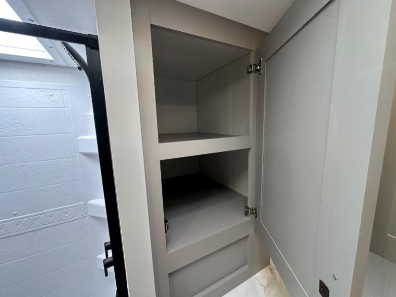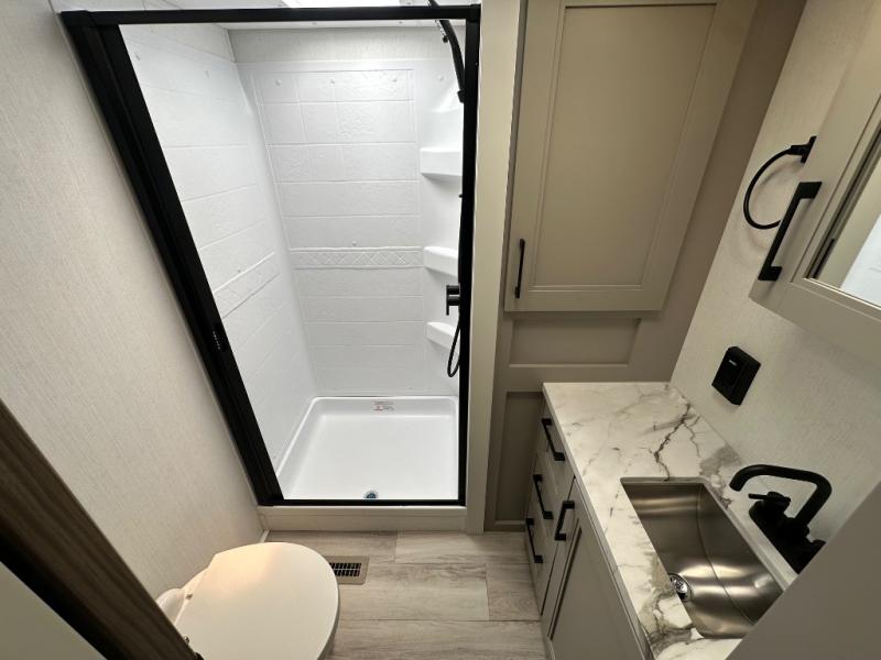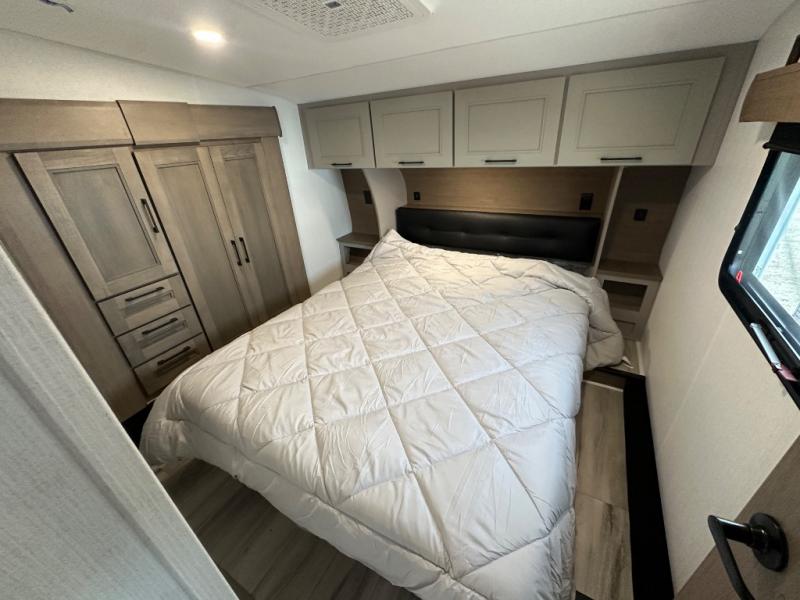 Escape the hustle and bustle of city life for weekends in this cozy fifth wheel. The dual opposing slides in the main living area will create an open floorplan, and you can choose an optional 40" fireplace here for a more at-home feel. There is also an entertainment center and a 43" Smart LED TV for movie night and a dinette with EZ adjust table to dine at. If the weather is nice, head outdoors to relax under the 14' power awning while the chef of your group cooks on the outside kitchen with a smart TV. The rear kitchen inside features tons of counter space, an 12 cu. ft. refrigerator, a drop-in cooktop, and a 24" microwave. And don't overlook the front private bedroom with its slide out wardrobe, a closet with washer and dryer prep, and a queen bed!