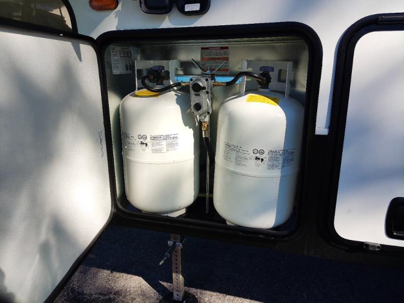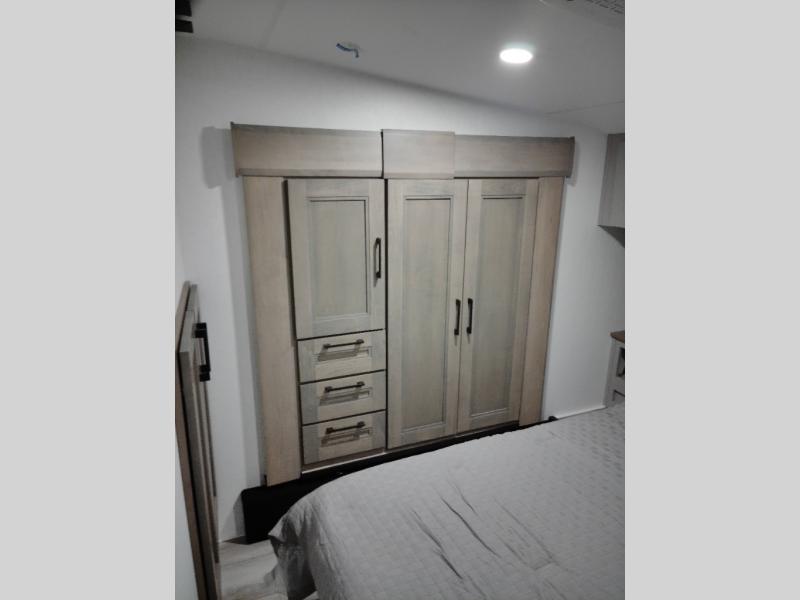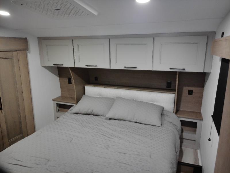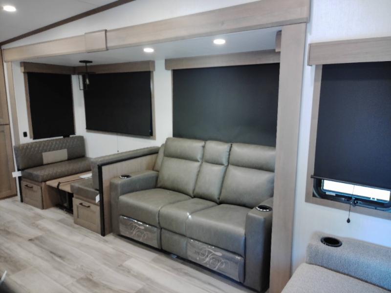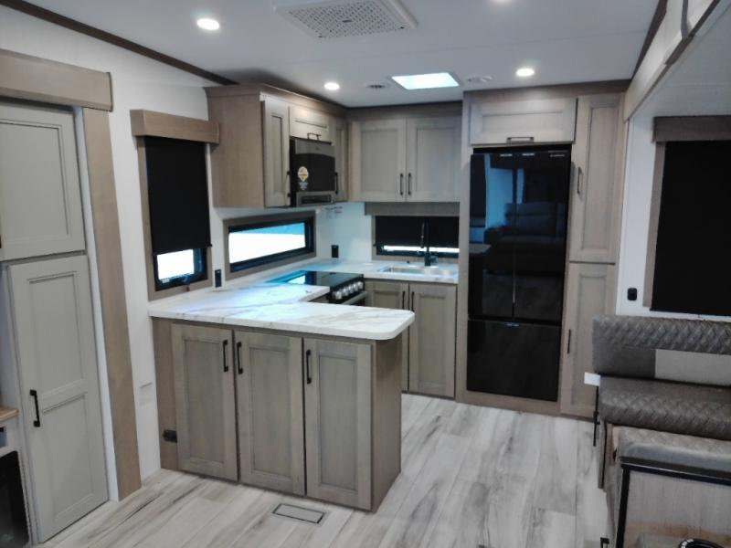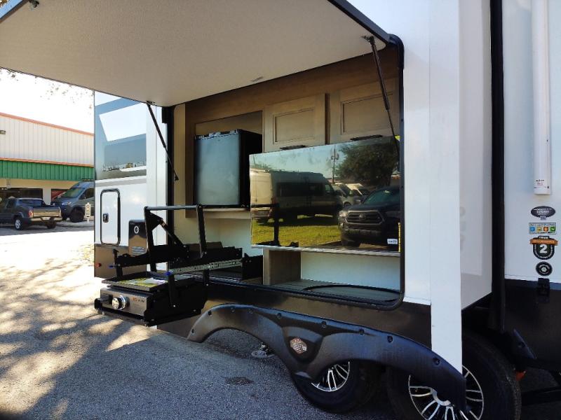 Escape the hustle and bustle of city life for weekends in this cozy fifth wheel. The dual opposing slides in the main living area will create an open floorplan, and you can choose an optional 40" fireplace here for a more at-home feel. There is also an entertainment center and a 43" Smart LED TV for movie night and a dinette with EZ adjust table to dine at. If the weather is nice, head outdoors to relax under the 14' power awning while the chef of your group cooks on the outside kitchen with a smart TV. The rear kitchen inside features tons of counter space, an 12 cu. ft. refrigerator, a drop-in cooktop, and a 24" microwave. And don't overlook the front private bedroom with its slide out wardrobe, a closet with washer and dryer prep, and a queen bed!