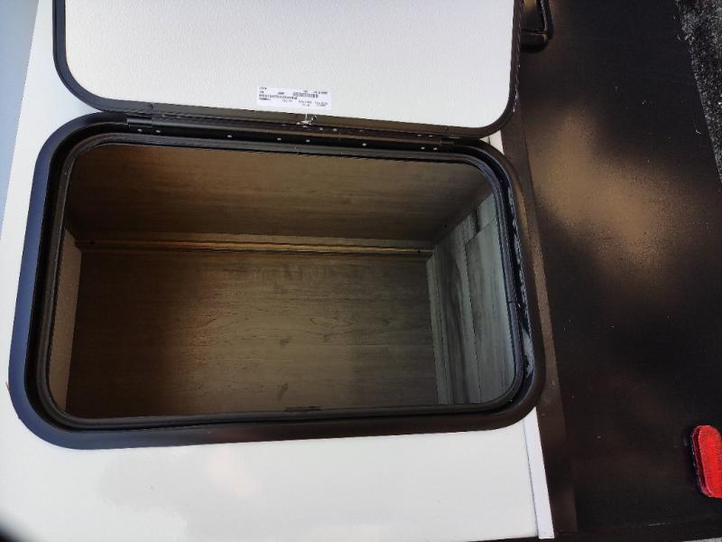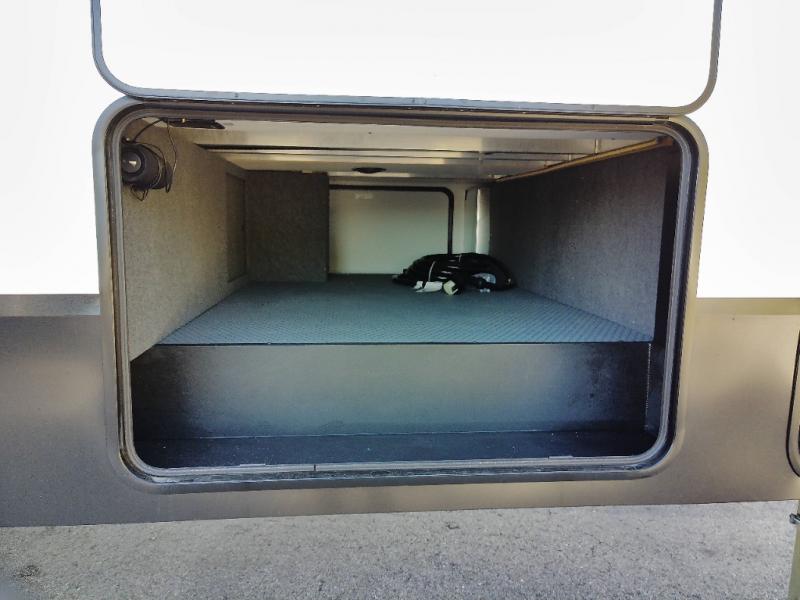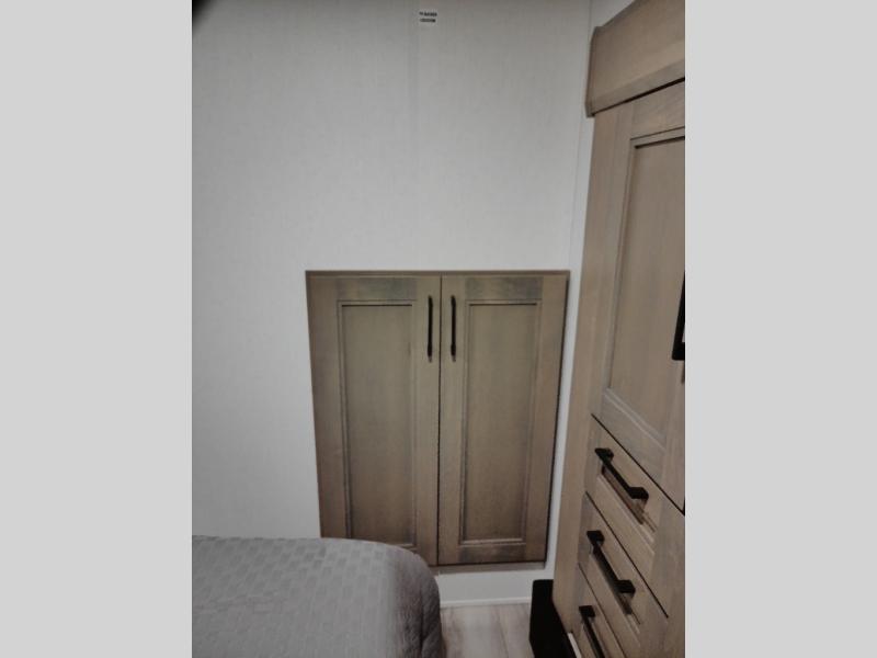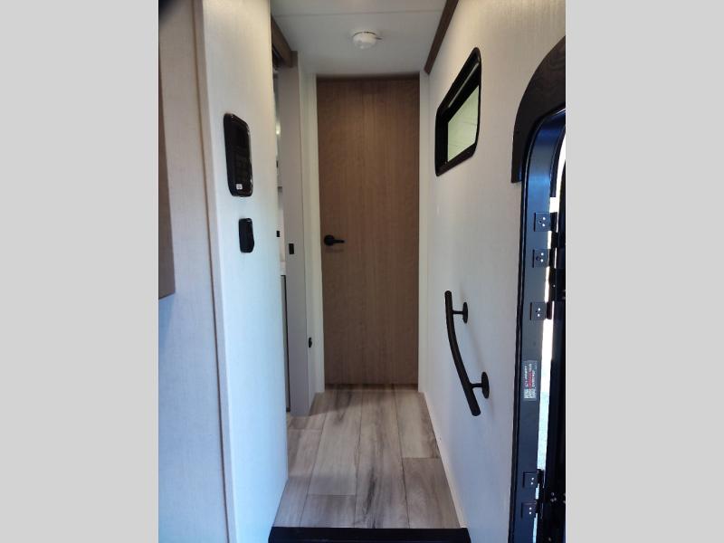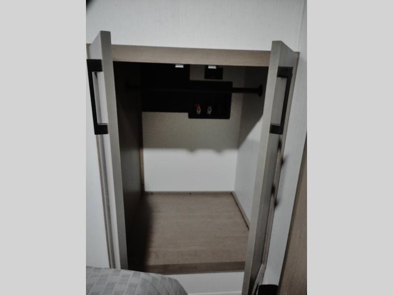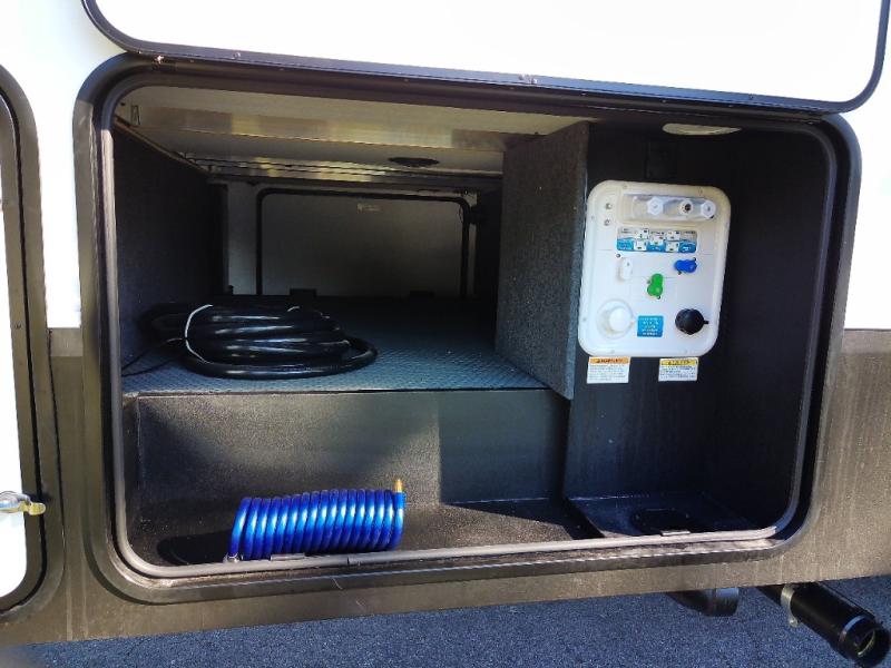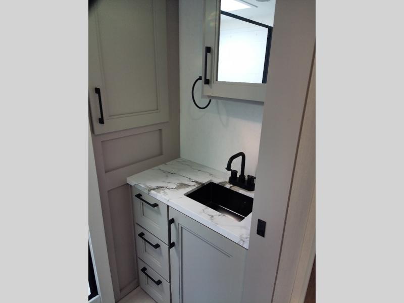 Escape the hustle and bustle of city life for weekends in this cozy fifth wheel. The dual opposing slides in the main living area will create an open floorplan, and you can choose an optional 40" fireplace here for a more at-home feel. There is also an entertainment center and a 43" Smart LED TV for movie night and a dinette with EZ adjust table to dine at. If the weather is nice, head outdoors to relax under the 14' power awning while the chef of your group cooks on the outside kitchen with a smart TV. The rear kitchen inside features tons of counter space, an 12 cu. ft. refrigerator, a drop-in cooktop, and a 24" microwave. And don't overlook the front private bedroom with its slide out wardrobe, a closet with washer and dryer prep, and a queen bed!