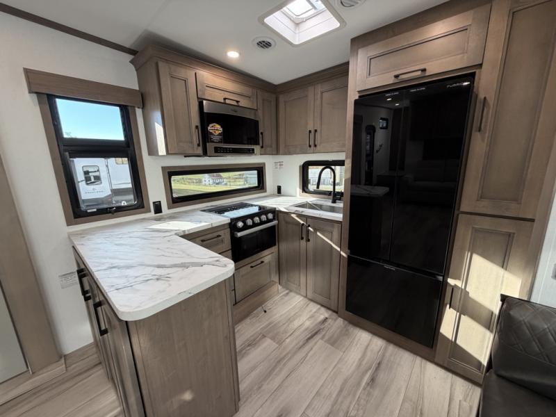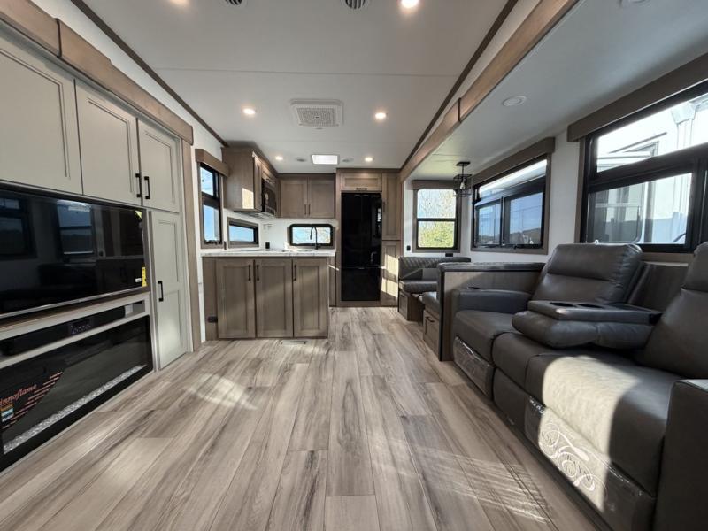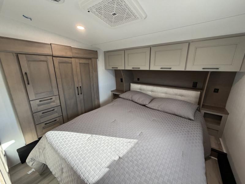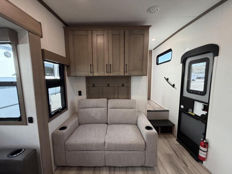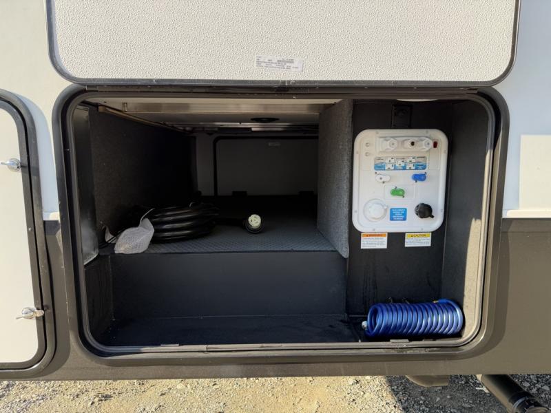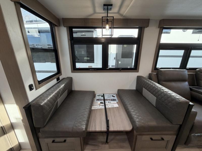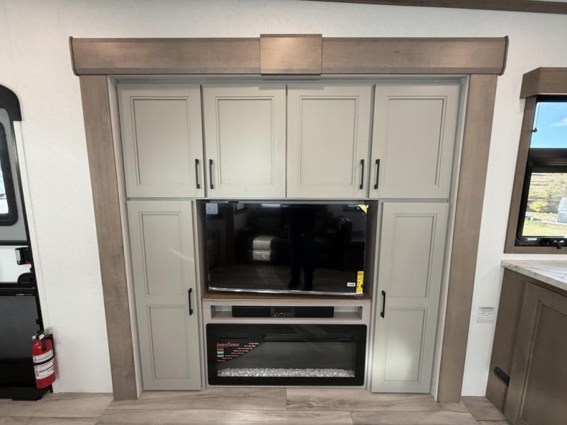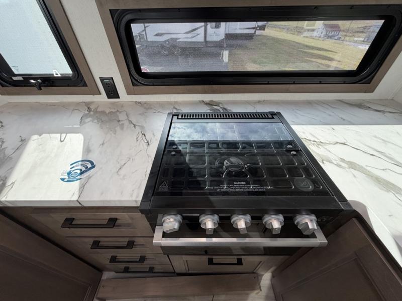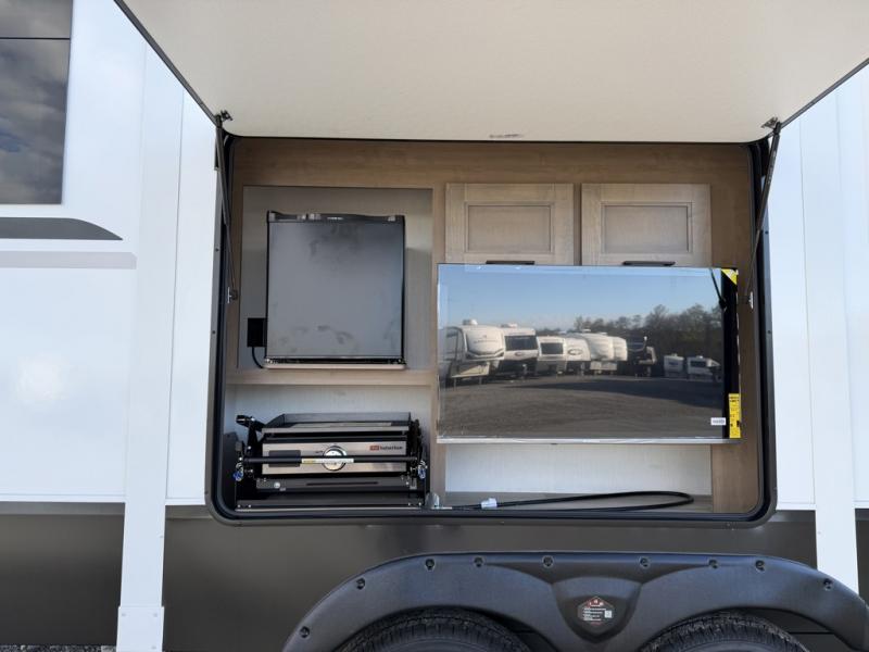 Escape the hustle and bustle of city life for weekends in this cozy fifth wheel. The dual opposing slides in the main living area will create an open floorplan, and you can choose an optional 40" fireplace here for a more at-home feel. There is also an entertainment center and a 43" Smart LED TV for movie night and a dinette with EZ adjust table to dine at. If the weather is nice, head outdoors to relax under the 14' power awning while the chef of your group cooks on the outside kitchen with a smart TV. The rear kitchen inside features tons of counter space, an 12 cu. ft. refrigerator, a drop-in cooktop, and a 24" microwave. And don't overlook the front private bedroom with its slide out wardrobe, a closet with washer and dryer prep, and a queen bed!