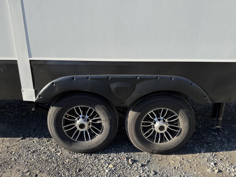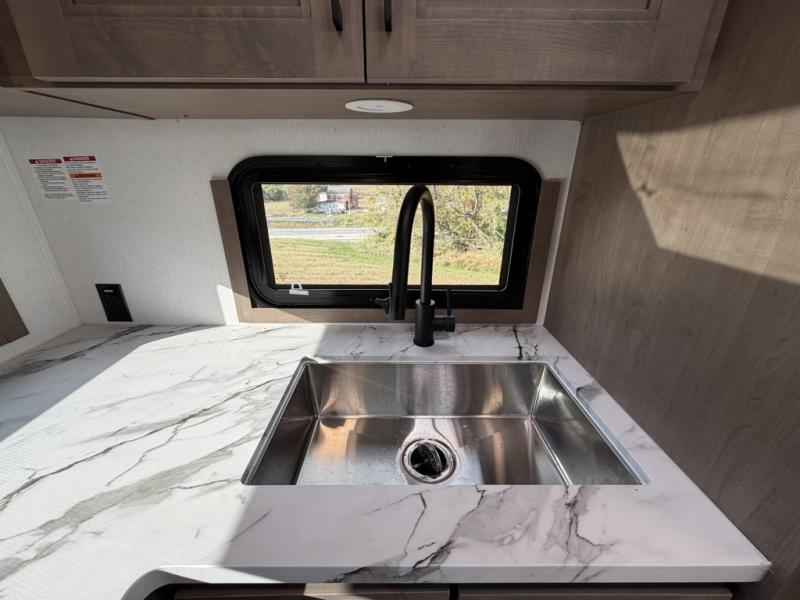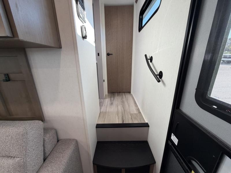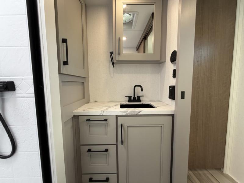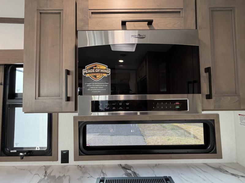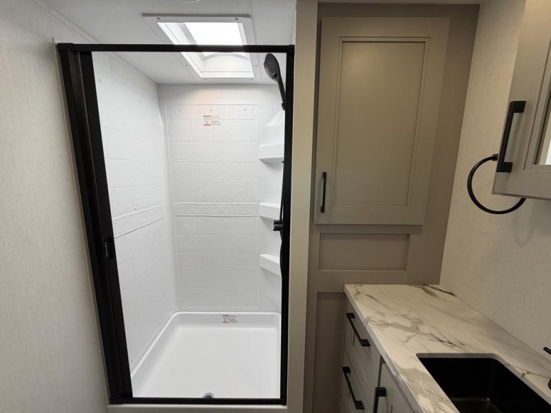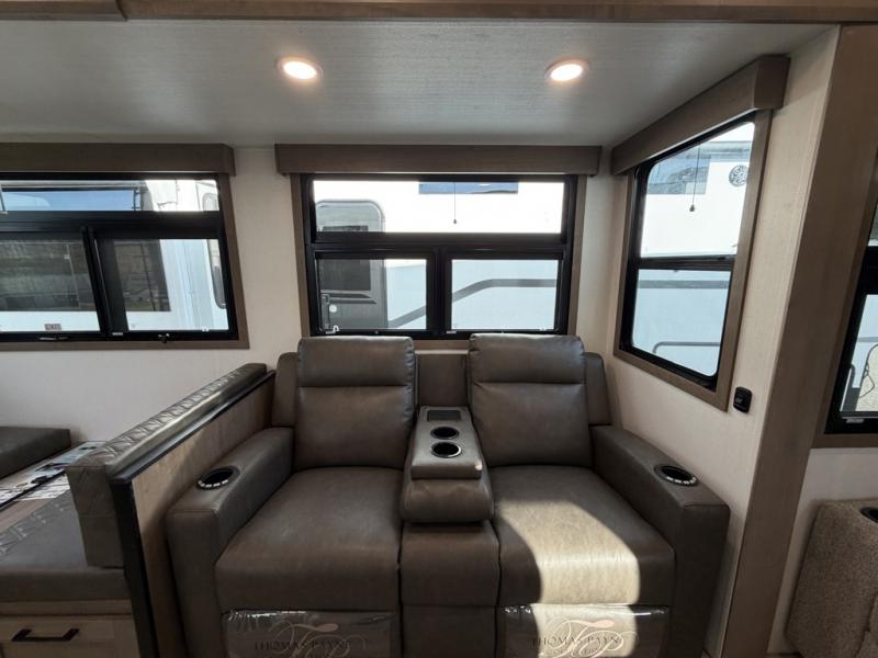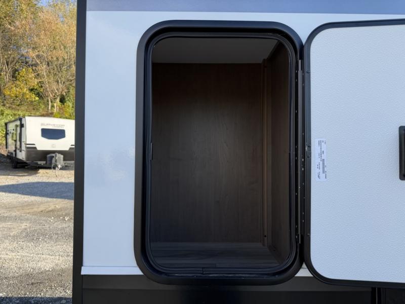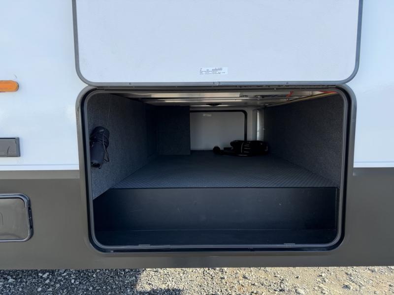 Escape the hustle and bustle of city life for weekends in this cozy fifth wheel. The dual opposing slides in the main living area will create an open floorplan, and you can choose an optional 40" fireplace here for a more at-home feel. There is also an entertainment center and a 43" Smart LED TV for movie night and a dinette with EZ adjust table to dine at. If the weather is nice, head outdoors to relax under the 14' power awning while the chef of your group cooks on the outside kitchen with a smart TV. The rear kitchen inside features tons of counter space, an 12 cu. ft. refrigerator, a drop-in cooktop, and a 24" microwave. And don't overlook the front private bedroom with its slide out wardrobe, a closet with washer and dryer prep, and a queen bed!