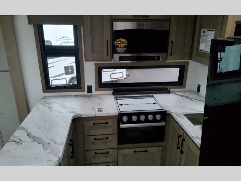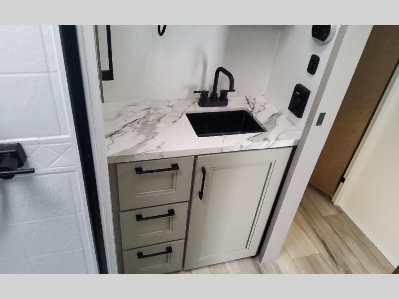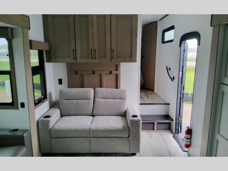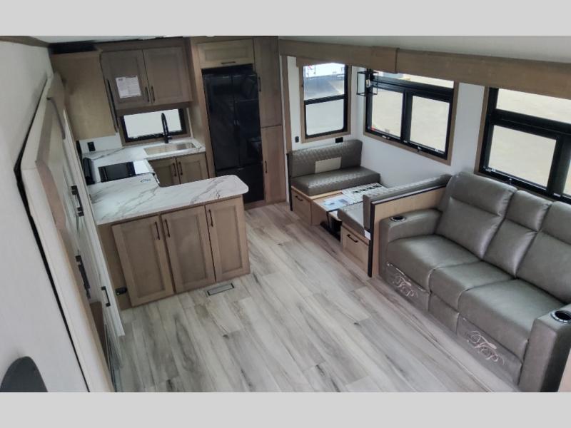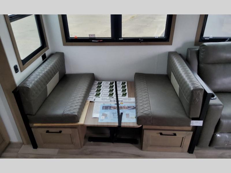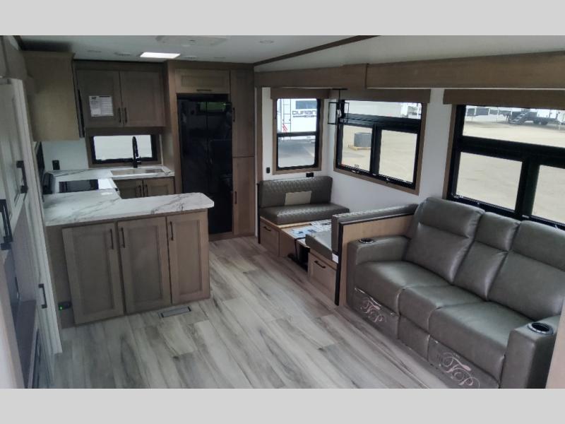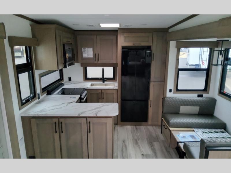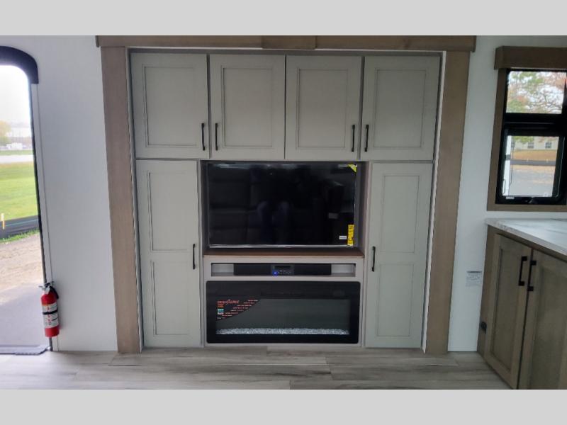 Escape the hustle and bustle of city life for weekends in this cozy fifth wheel. The dual opposing slides in the main living area will create an open floorplan, and you can choose an optional 40" fireplace here for a more at-home feel. There is also an entertainment center and a 43" Smart LED TV for movie night and a dinette with EZ adjust table to dine at. If the weather is nice, head outdoors to relax under the 14' power awning while the chef of your group cooks on the outside kitchen with a smart TV. The rear kitchen inside features tons of counter space, an 12 cu. ft. refrigerator, a drop-in cooktop, and a 24" microwave. And don't overlook the front private bedroom with its slide out wardrobe, a closet with washer and dryer prep, and a queen bed!