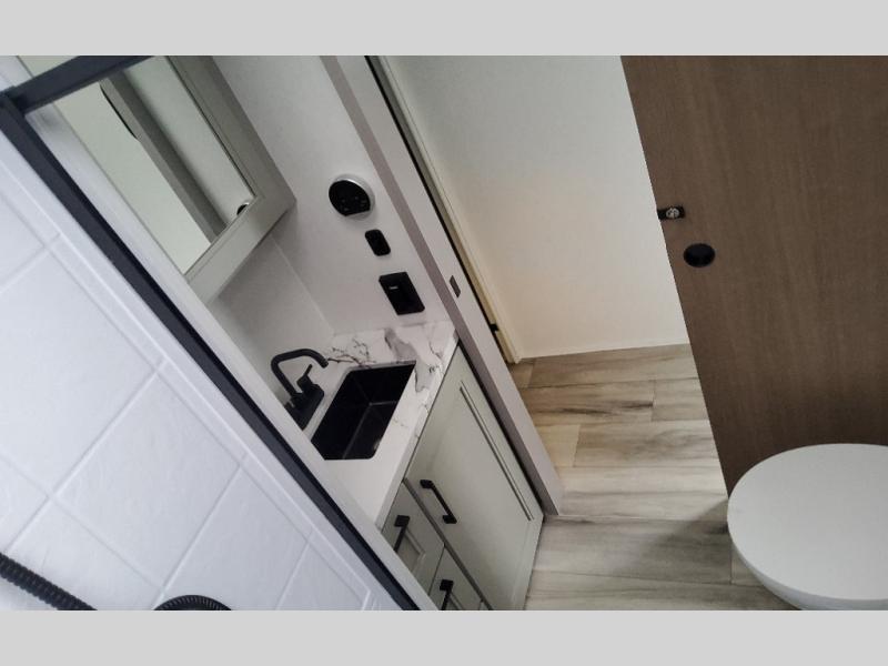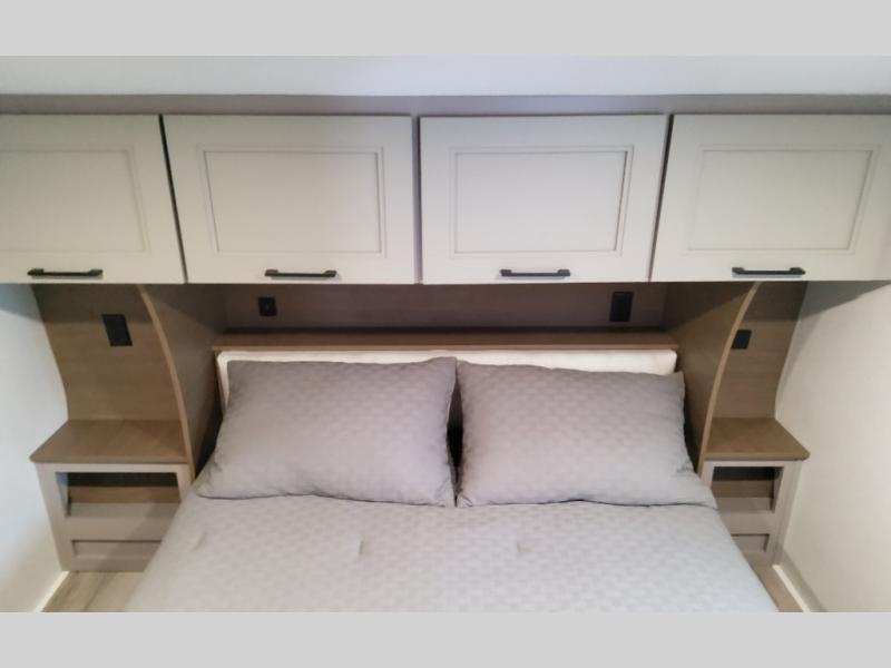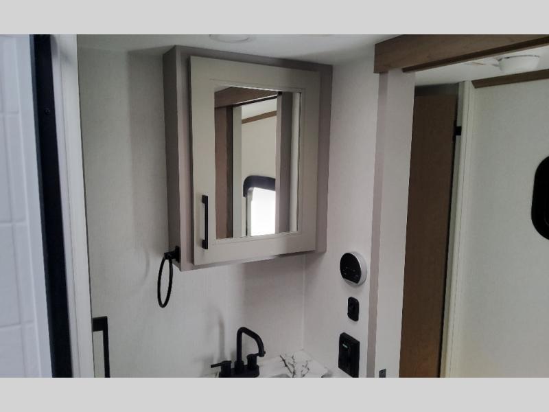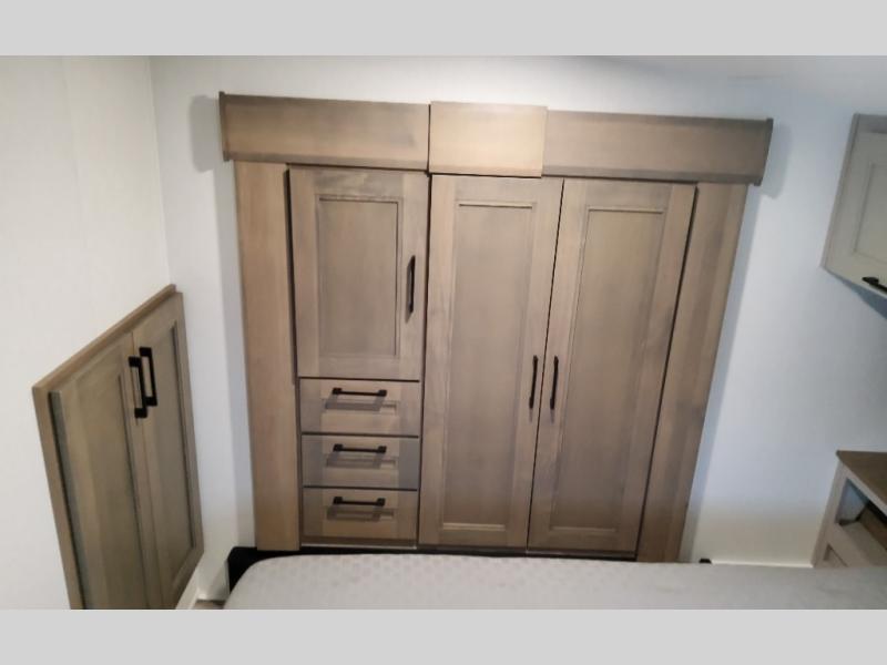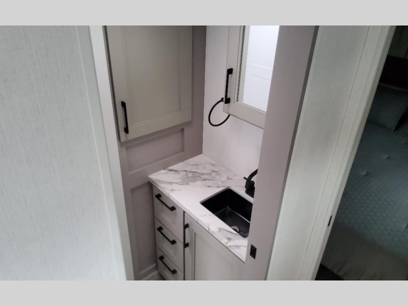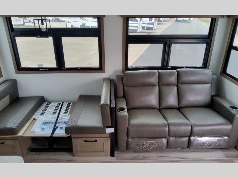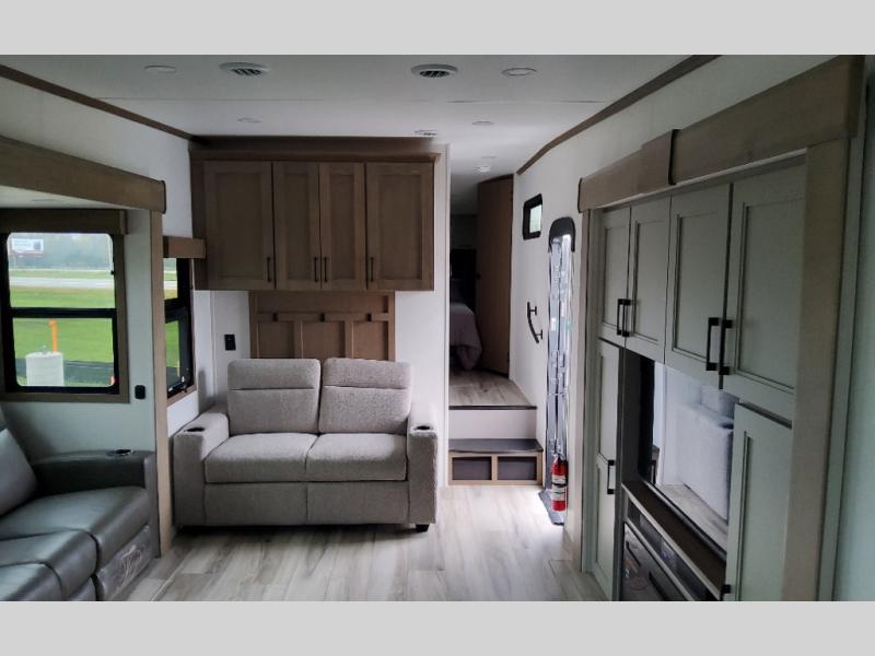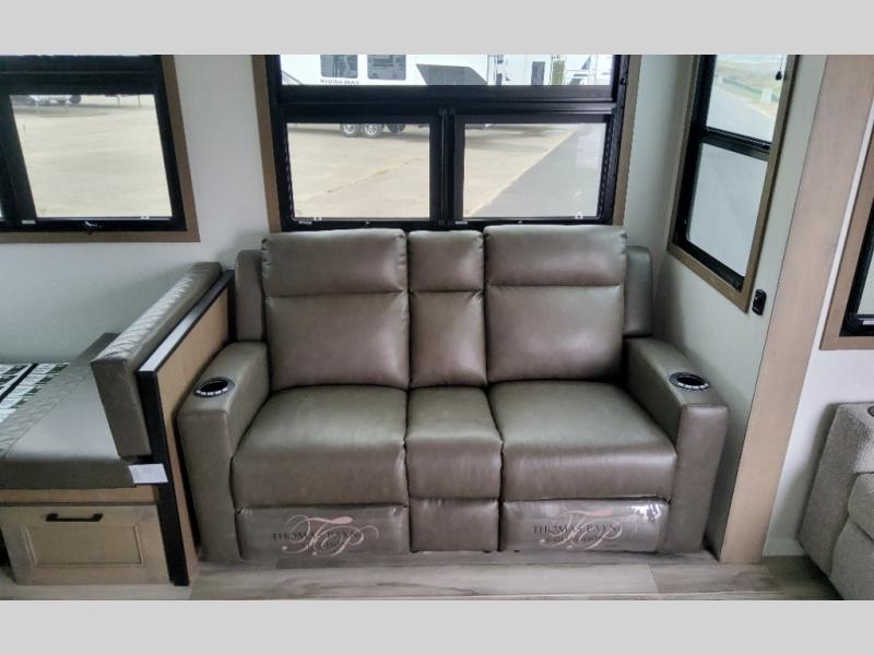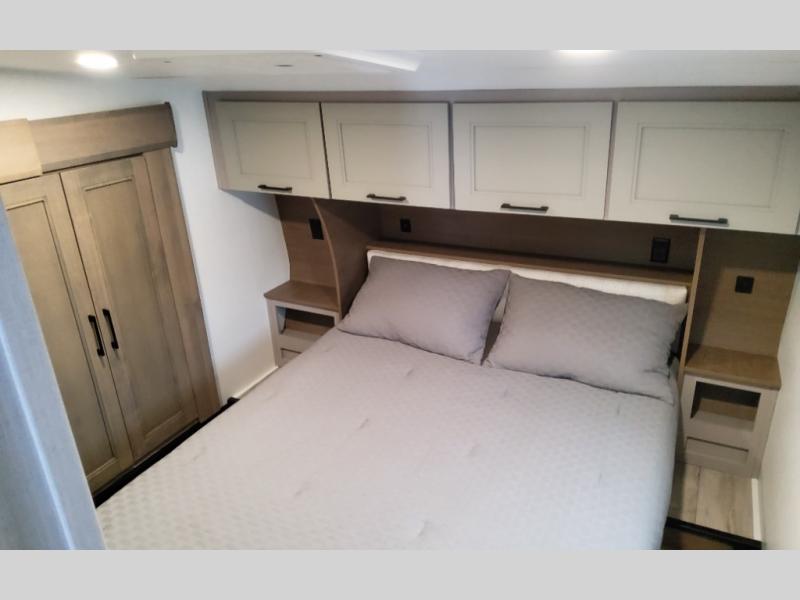 Escape the hustle and bustle of city life for weekends in this cozy fifth wheel. The dual opposing slides in the main living area will create an open floorplan, and you can choose an optional 40" fireplace here for a more at-home feel. There is also an entertainment center and a 43" Smart LED TV for movie night and a dinette with EZ adjust table to dine at. If the weather is nice, head outdoors to relax under the 14' power awning while the chef of your group cooks on the outside kitchen with a smart TV. The rear kitchen inside features tons of counter space, an 12 cu. ft. refrigerator, a drop-in cooktop, and a 24" microwave. And don't overlook the front private bedroom with its slide out wardrobe, a closet with washer and dryer prep, and a queen bed!