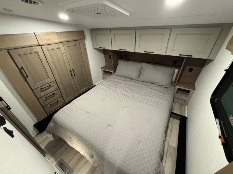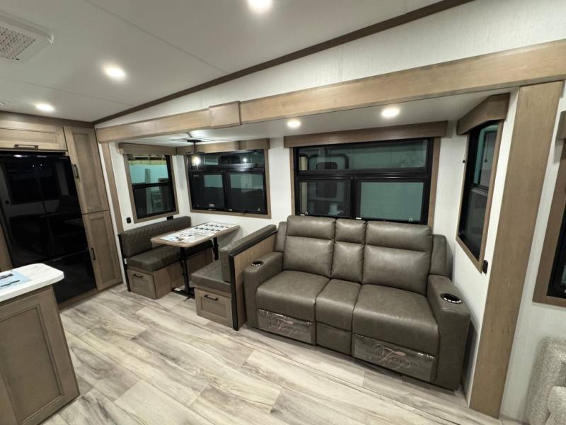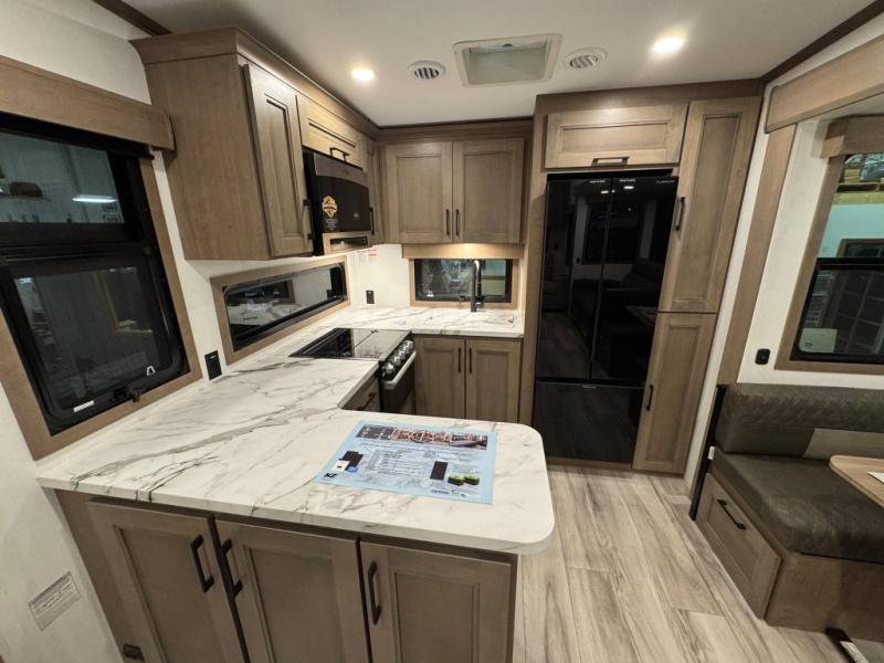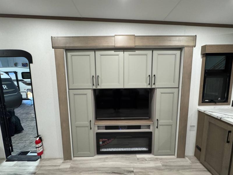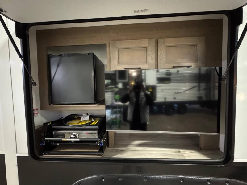 Escape the hustle and bustle of city life for weekends in this cozy fifth wheel. The dual opposing slides in the main living area will create an open floorplan, and you can choose an optional 40" fireplace here for a more at-home feel. There is also an entertainment center and a 43" Smart LED TV for movie night and a dinette with EZ adjust table to dine at. If the weather is nice, head outdoors to relax under the 14' power awning while the chef of your group cooks on the outside kitchen with a smart TV. The rear kitchen inside features tons of counter space, an 12 cu. ft. refrigerator, a drop-in cooktop, and a 24" microwave. And don't overlook the front private bedroom with its slide out wardrobe, a closet with washer and dryer prep, and a queen bed!