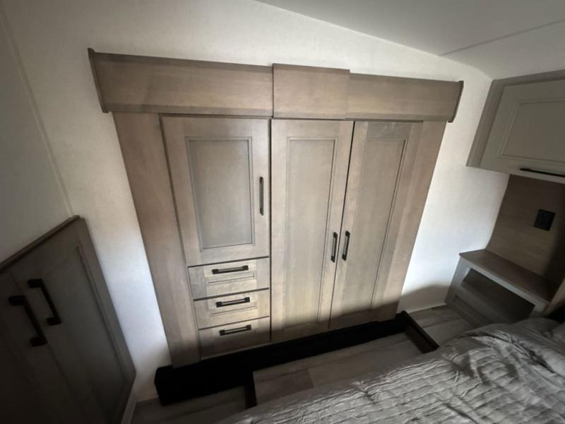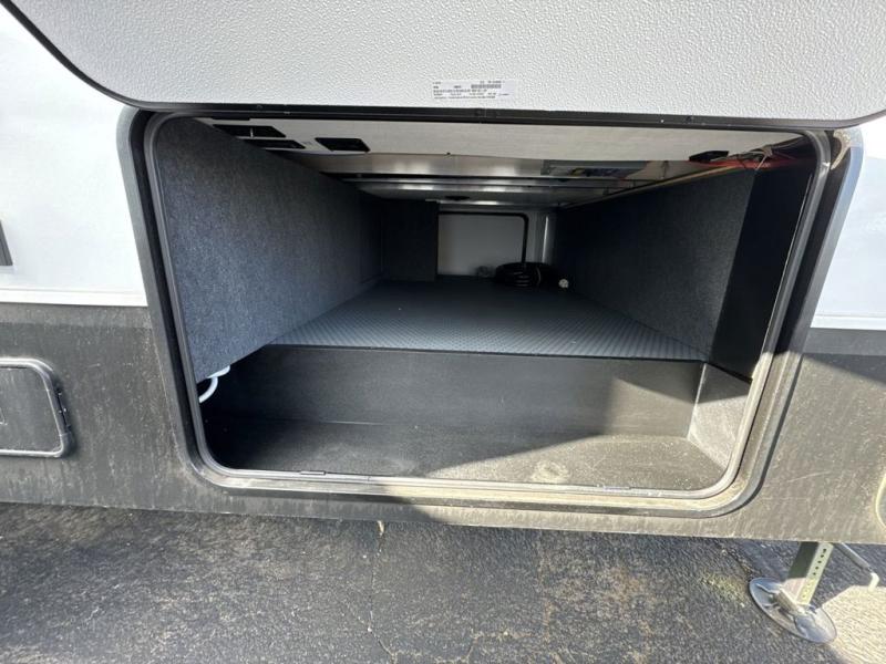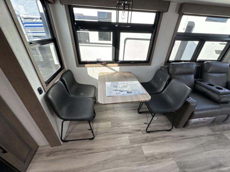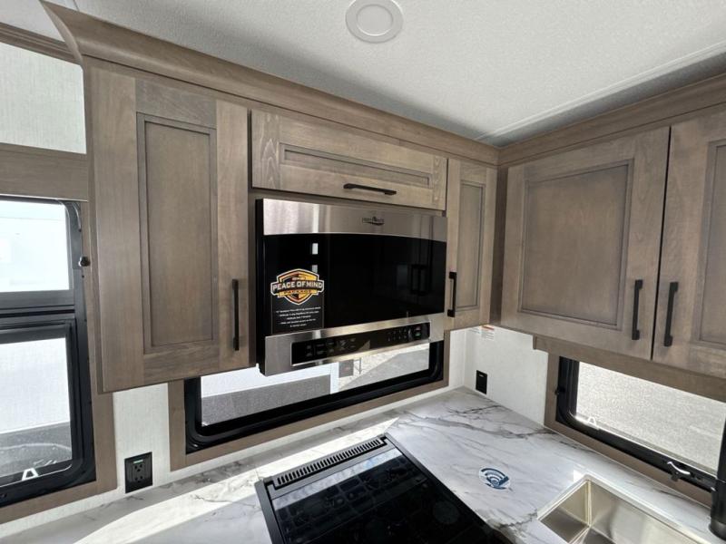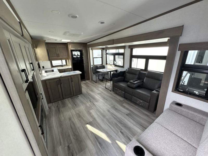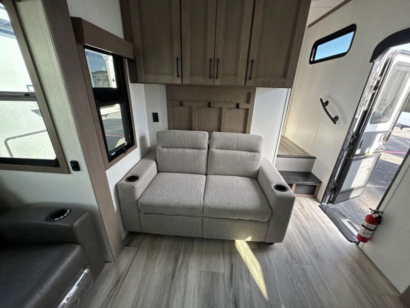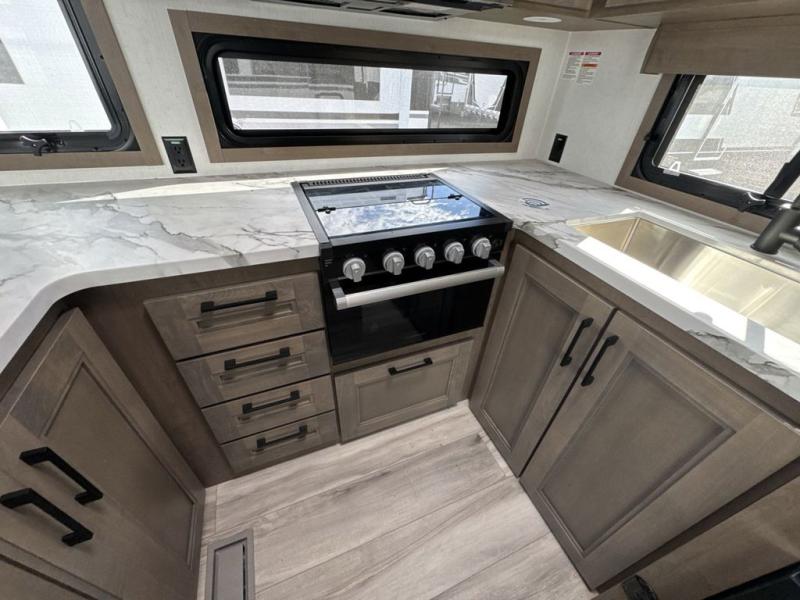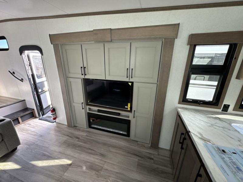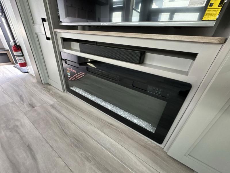 Escape the hustle and bustle of city life for weekends in this cozy fifth wheel. The dual opposing slides in the main living area will create an open floorplan, and you can choose an optional 40" fireplace here for a more at-home feel. There is also an entertainment center and a 43" Smart LED TV for movie night and a dinette with EZ adjust table to dine at. If the weather is nice, head outdoors to relax under the 14' power awning while the chef of your group cooks on the outside kitchen with a smart TV. The rear kitchen inside features tons of counter space, an 12 cu. ft. refrigerator, a drop-in cooktop, and a 24" microwave. And don't overlook the front private bedroom with its slide out wardrobe, a closet with washer and dryer prep, and a queen bed!