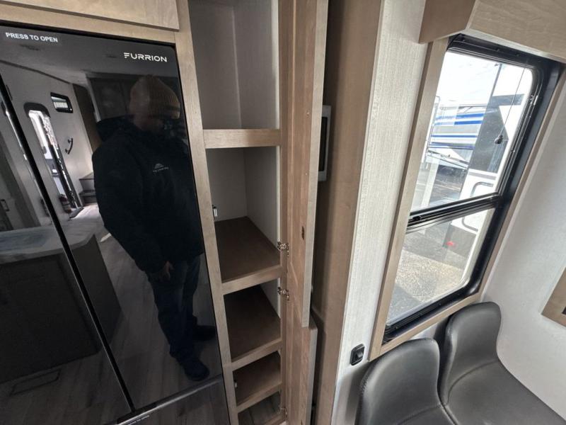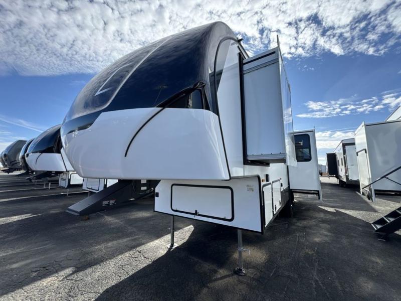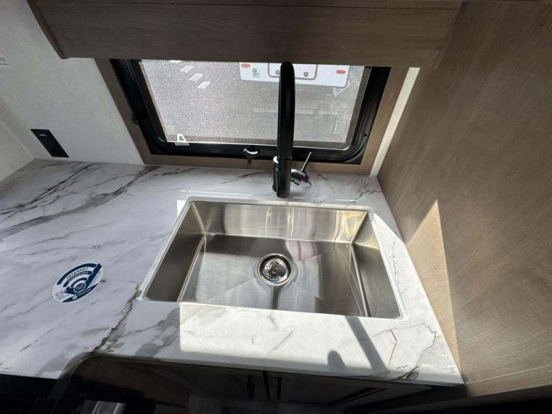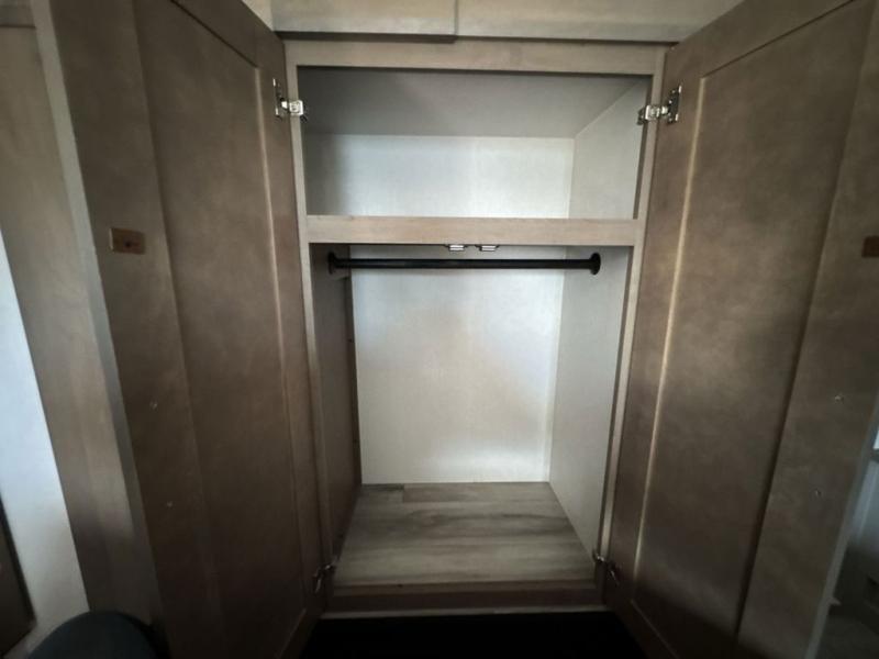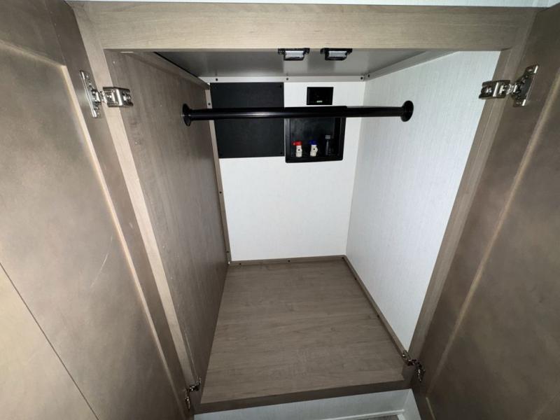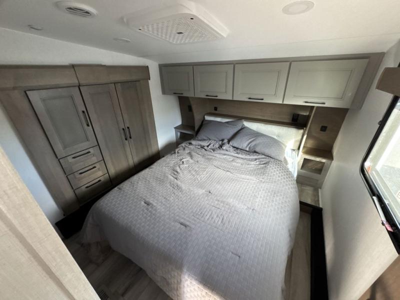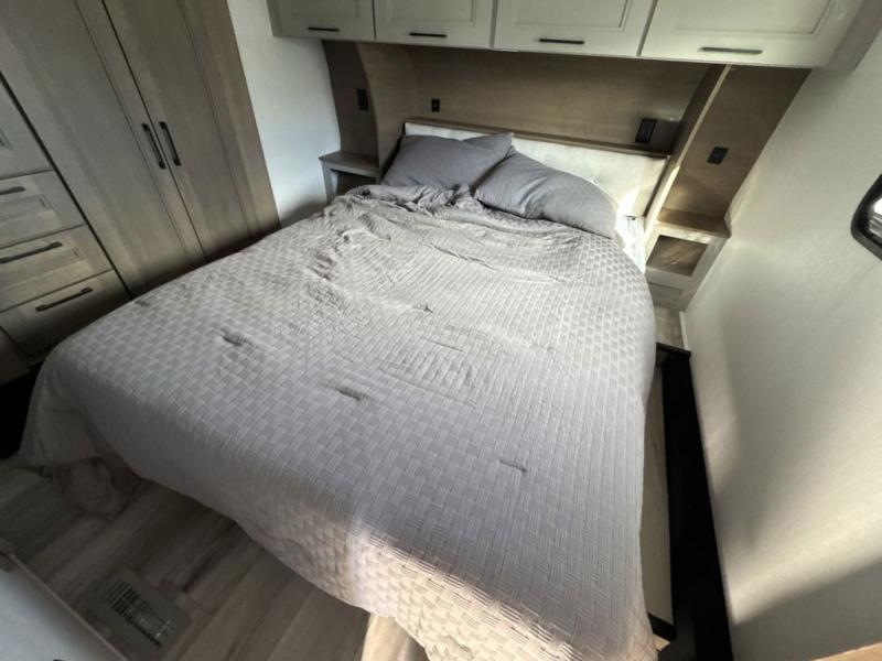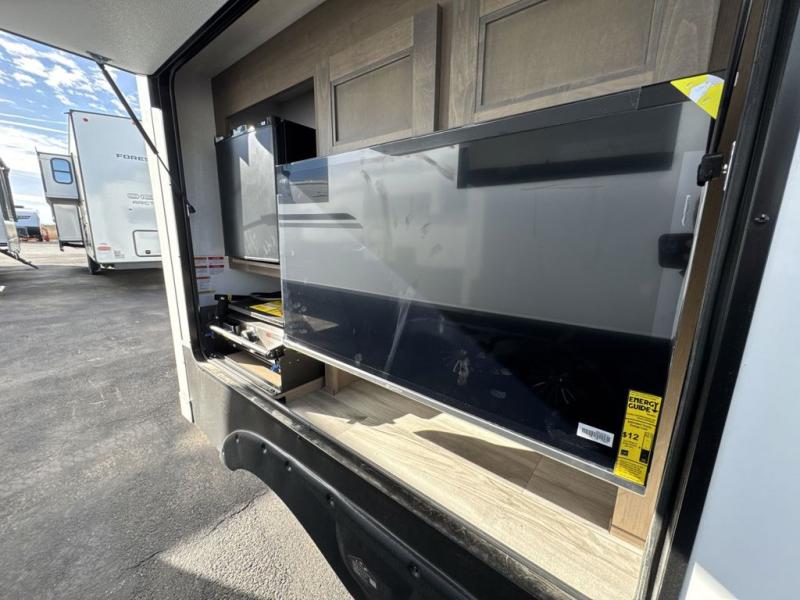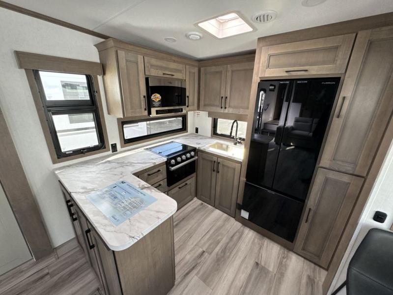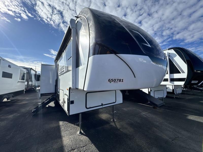Escape the hustle and bustle of city life for weekends in this cozy fifth wheel. The dual opposing slides in the main living area will create an open floorplan, and you can choose an optional 40" fireplace here for a more at-home feel. There is also an entertainment center and a 43" Smart LED TV for movie night and a dinette with EZ adjust table to dine at. If the weather is nice, head outdoors to relax under the 14' power awning while the chef of your group cooks on the outside kitchen with a smart TV. The rear kitchen inside features tons of counter space, an 12 cu. ft. refrigerator, a drop-in cooktop, and a 24" microwave. And don't overlook the front private bedroom with its slide out wardrobe, a closet with washer and dryer prep, and a queen bed!