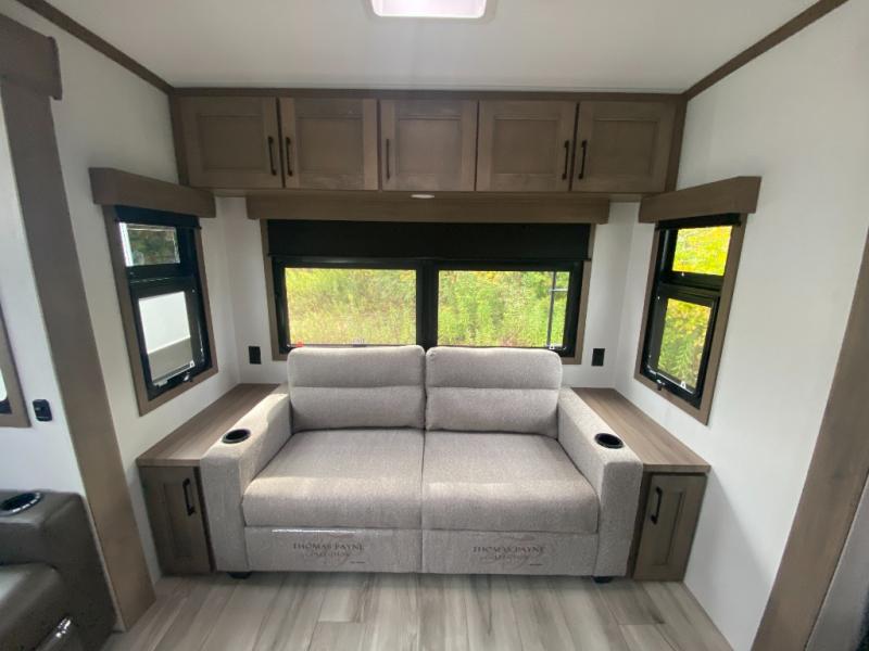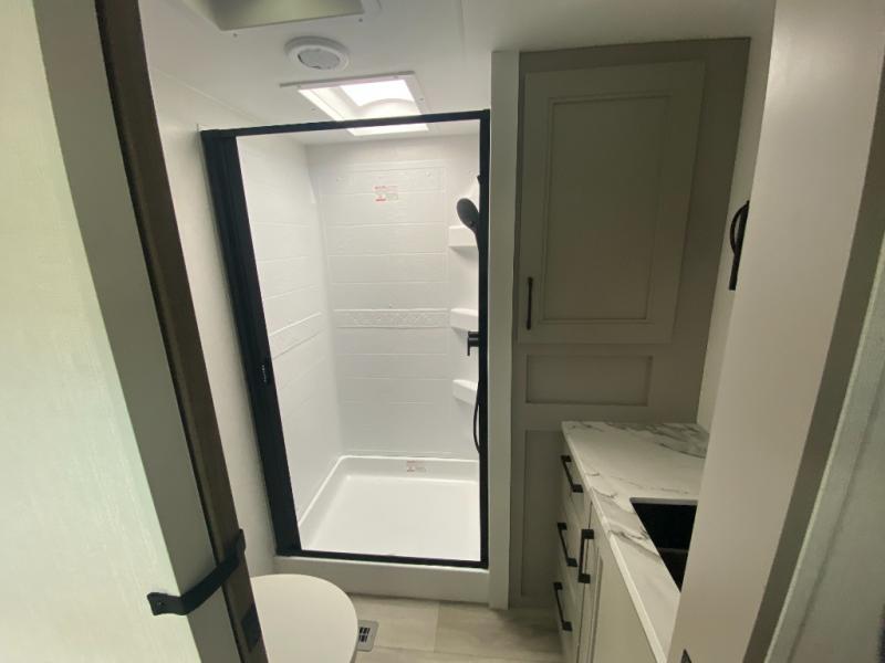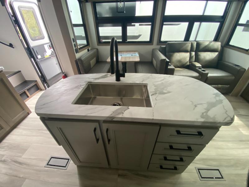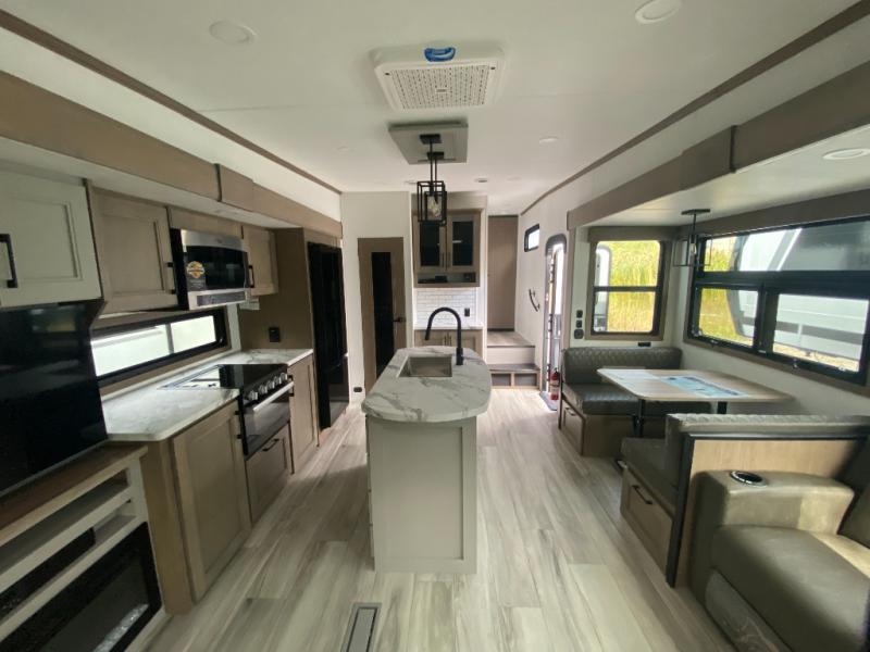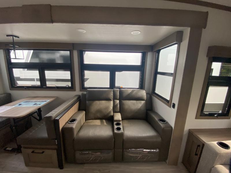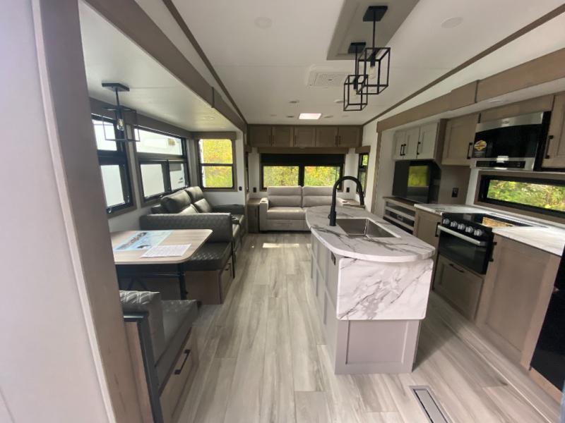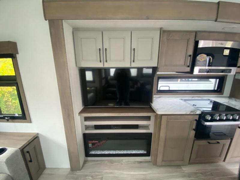 This fifth wheel will feel just like home with its kitchen island, theater seating, and front private bedroom! If you have any overnight guests, they can sleep on the rear hide-a-bed sofa. There is also a dinette with EZ adjust table for dining space, an entertainment center with a 43" Smart LED TV and an optional 40" fireplace. You will love the extra features that have been added, like the hutch in the kitchen for extra counter and storage space, the shower skylight in the spacious full bath, and the slide out wardrobe in the front bedroom!
