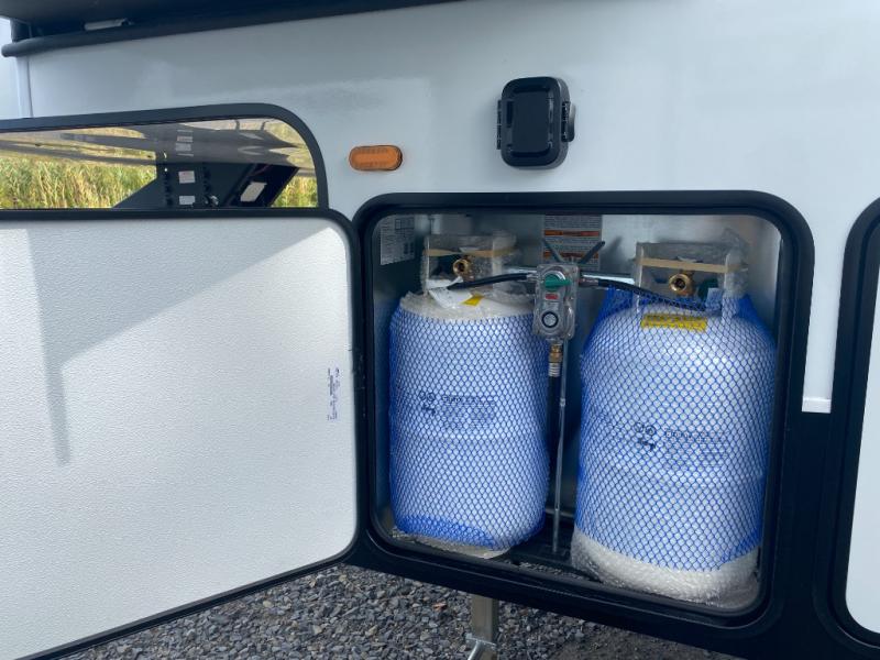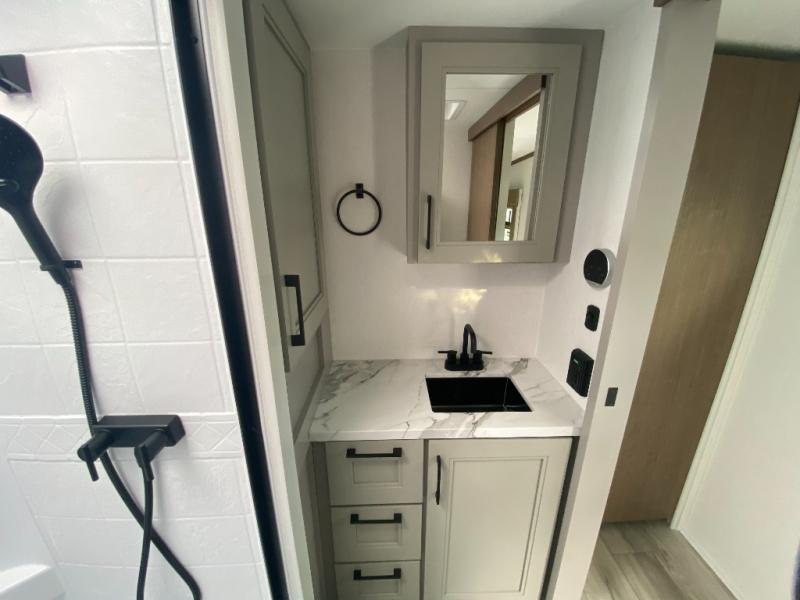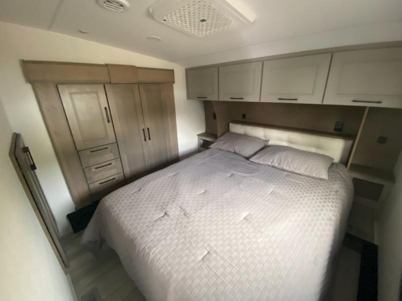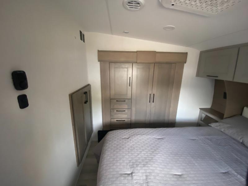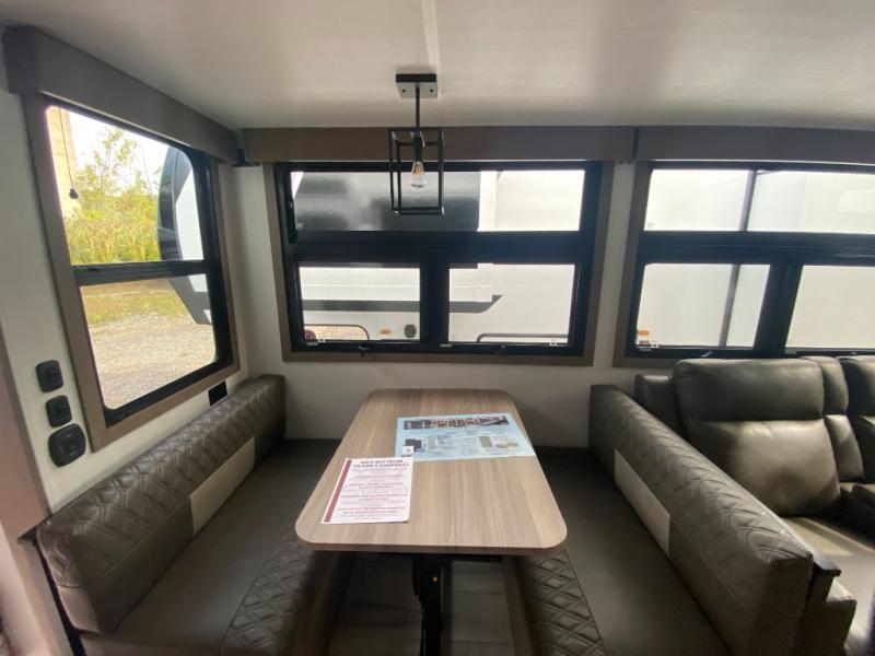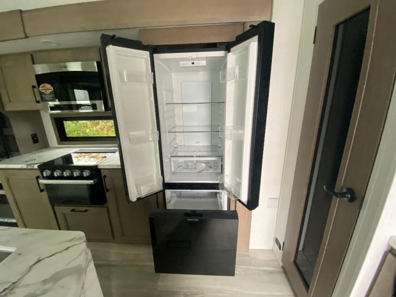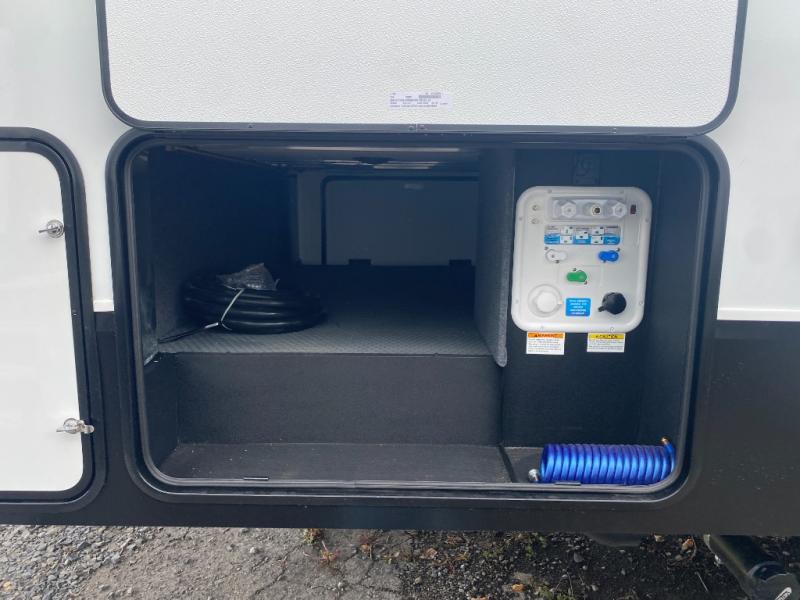 This fifth wheel will feel just like home with its kitchen island, theater seating, and front private bedroom! If you have any overnight guests, they can sleep on the rear hide-a-bed sofa. There is also a dinette with EZ adjust table for dining space, an entertainment center with a 43" Smart LED TV and an optional 40" fireplace. You will love the extra features that have been added, like the hutch in the kitchen for extra counter and storage space, the shower skylight in the spacious full bath, and the slide out wardrobe in the front bedroom!