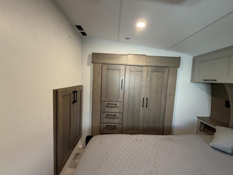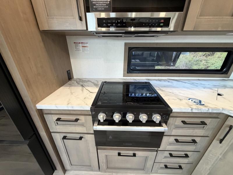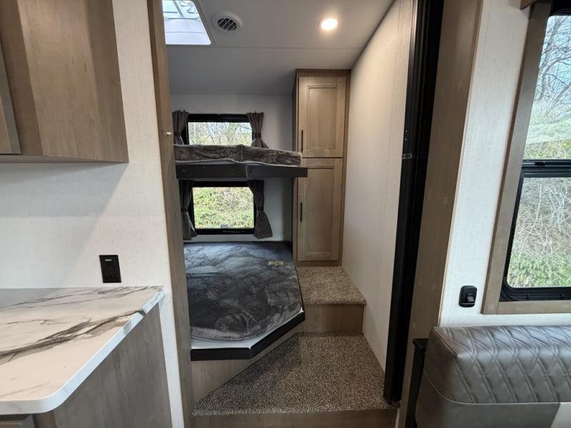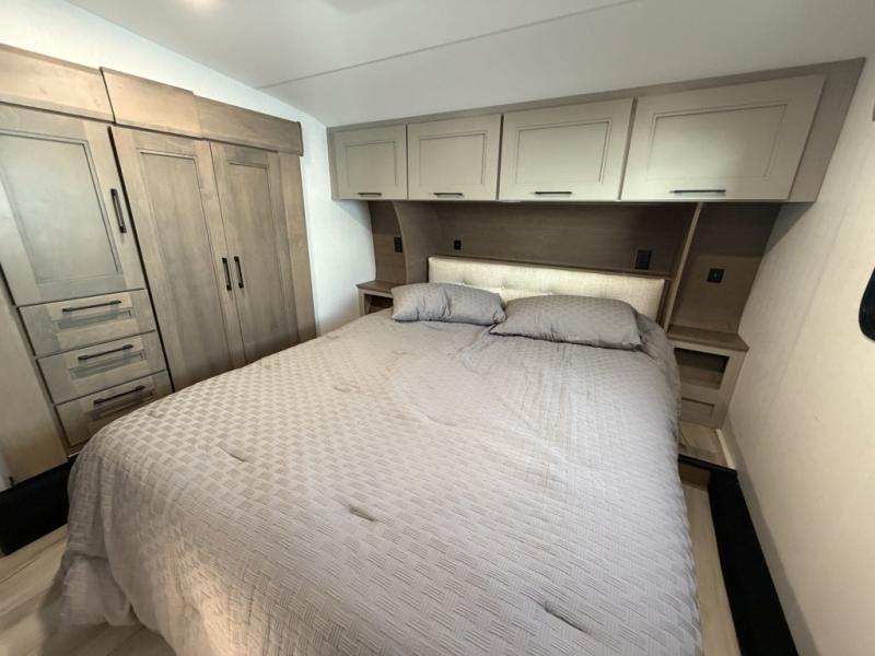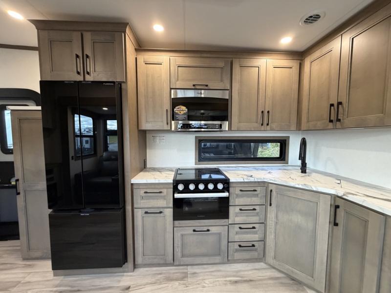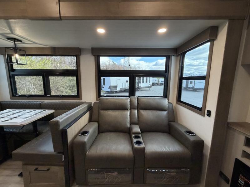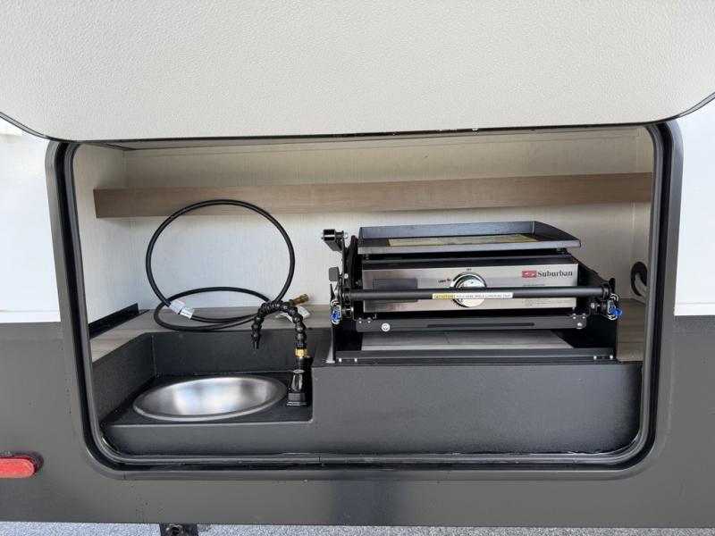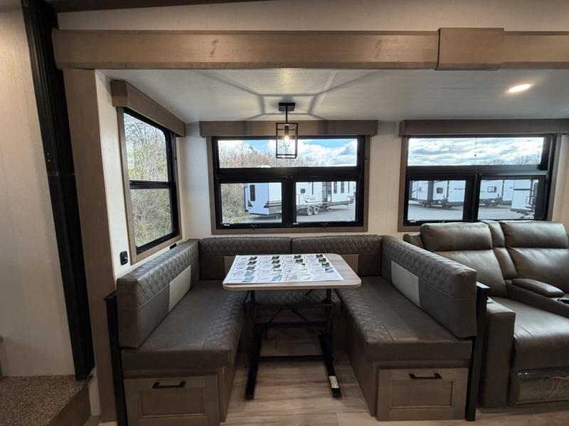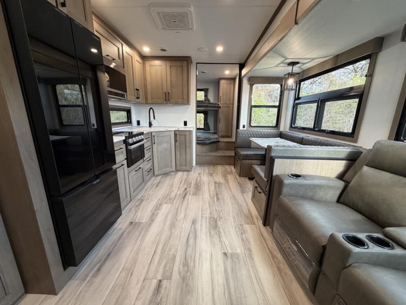 This fifth wheel is perfect for camping with a large group or family since it can sleep ten people each night! There are queen-size bunks, a U-shaped dinette, a hide-a-bed sofa, plus a queen bed in the front private bedroom. And if you'd rather have theater seating in place of the sofa, you can choose that option! The chef will have their choice to cook indoors on the three burner drop-in cooktop or outdoors on the outside griddle, plus there are two power awnings here for maximum shade. Don't let this fifth wheel slip away!