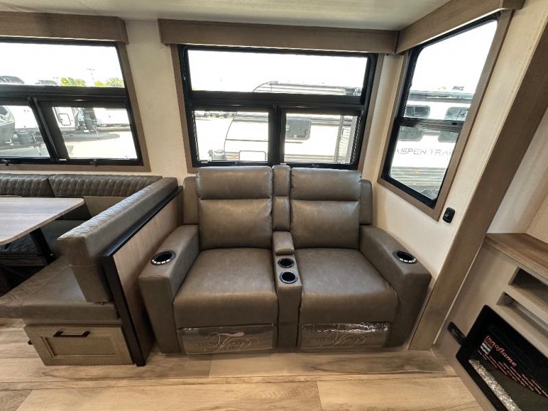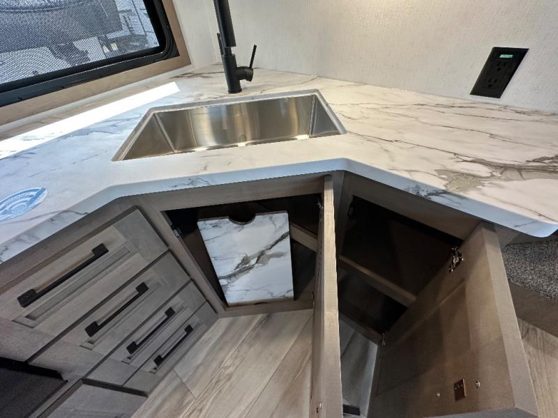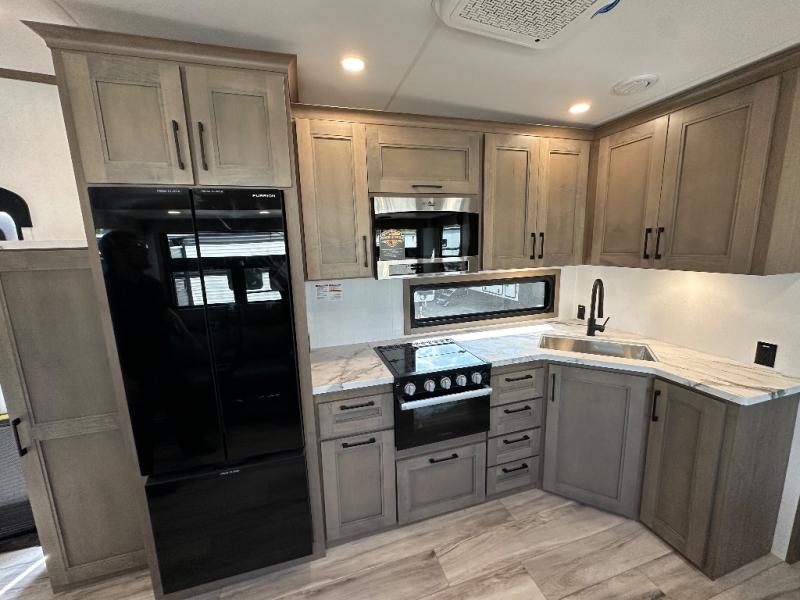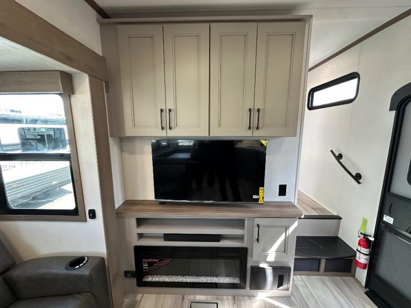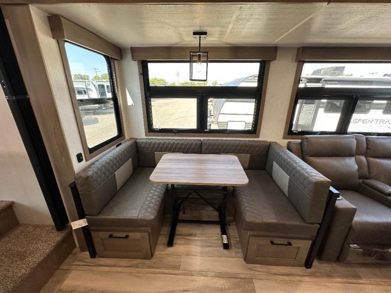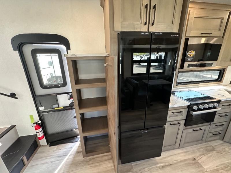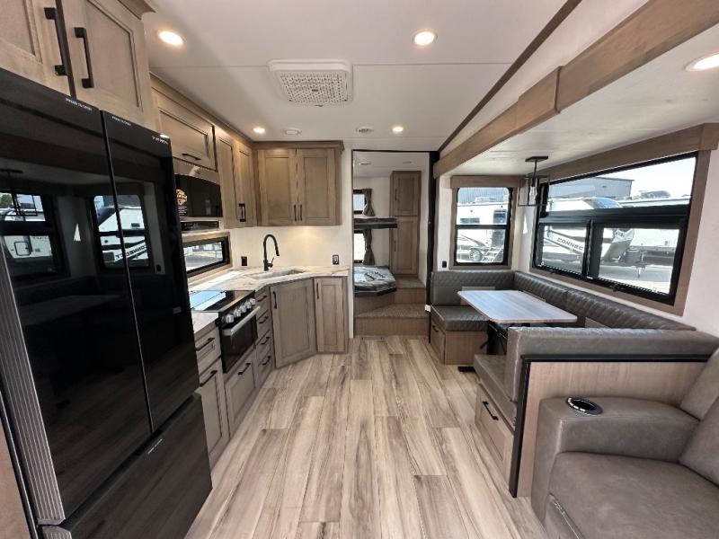 This fifth wheel is perfect for camping with a large group or family since it can sleep ten people each night! There are queen-size bunks, a U-shaped dinette, a hide-a-bed sofa, plus a queen bed in the front private bedroom. And if you'd rather have theater seating in place of the sofa, you can choose that option! The chef will have their choice to cook indoors on the three burner drop-in cooktop or outdoors on the outside griddle, plus there are two power awnings here for maximum shade. Don't let this fifth wheel slip away!