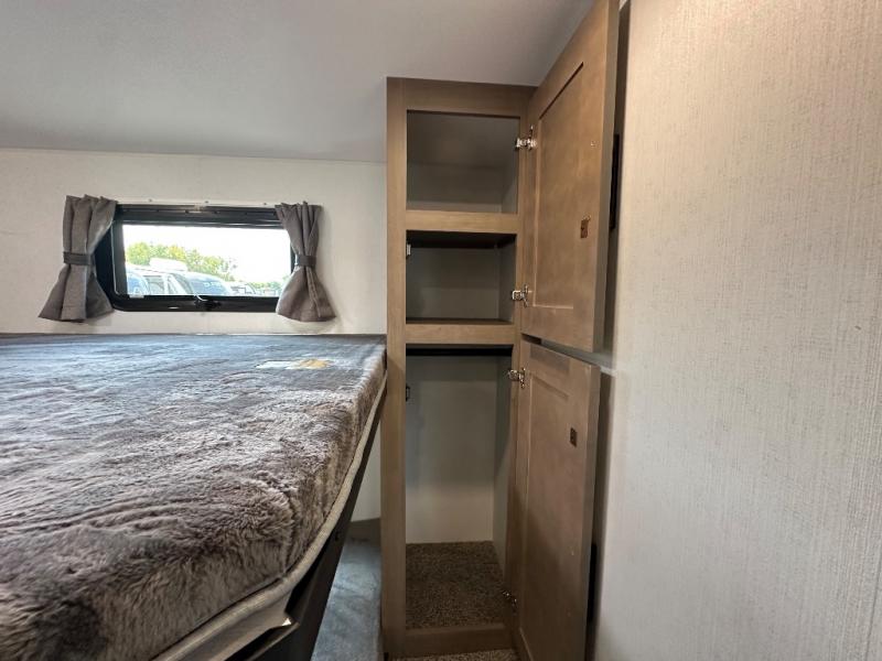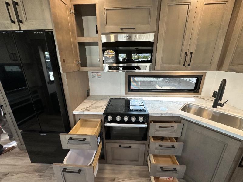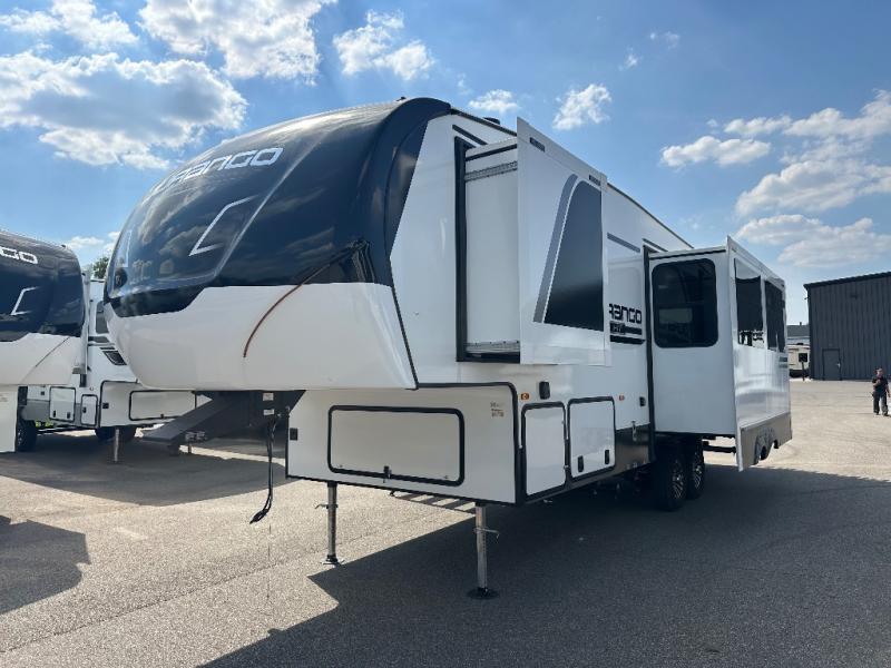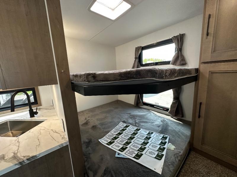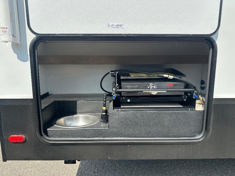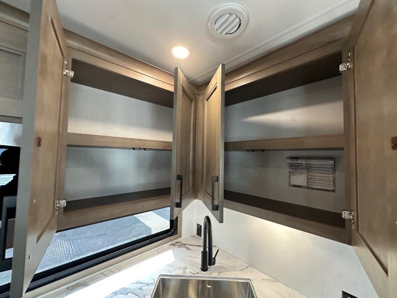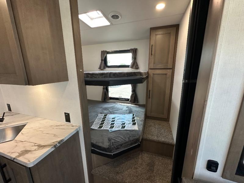 This fifth wheel is perfect for camping with a large group or family since it can sleep ten people each night! There are queen-size bunks, a U-shaped dinette, a hide-a-bed sofa, plus a queen bed in the front private bedroom. And if you'd rather have theater seating in place of the sofa, you can choose that option! The chef will have their choice to cook indoors on the three burner drop-in cooktop or outdoors on the outside griddle, plus there are two power awnings here for maximum shade. Don't let this fifth wheel slip away!