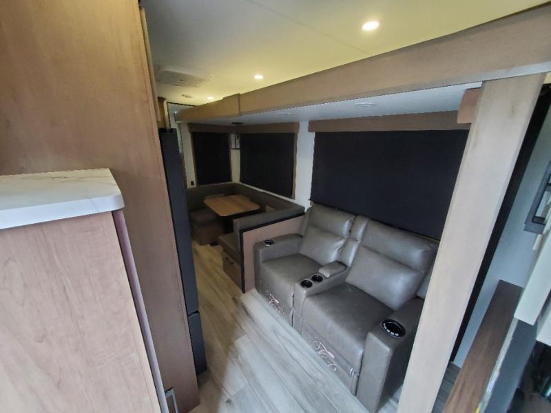 This fifth wheel is perfect for camping with a large group or family since it can sleep ten people each night! There are queen-size bunks, a U-shaped dinette, a hide-a-bed sofa, plus a queen bed in the front private bedroom. And if you'd rather have theater seating in place of the sofa, you can choose that option! The chef will have their choice to cook indoors on the three burner drop-in cooktop or outdoors on the outside griddle, plus there are two power awnings here for maximum shade. Don't let this fifth wheel slip away!