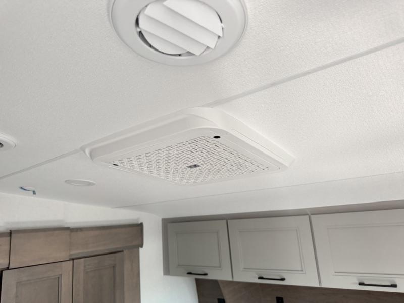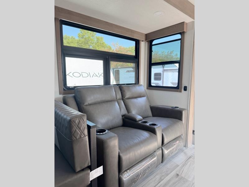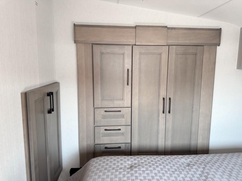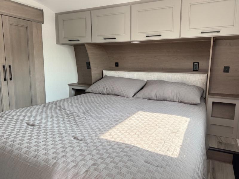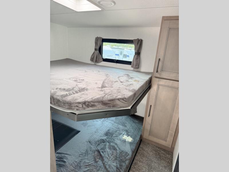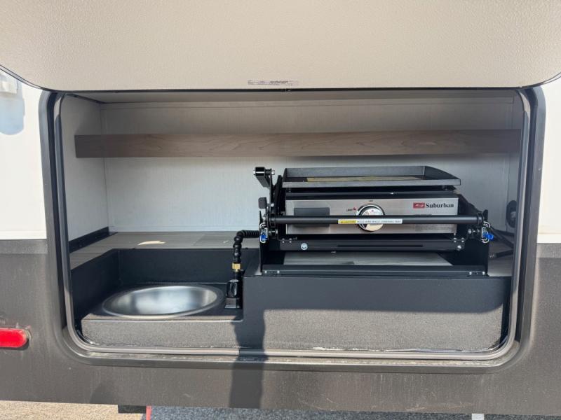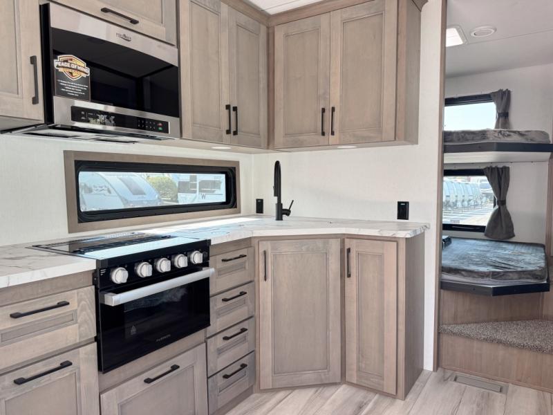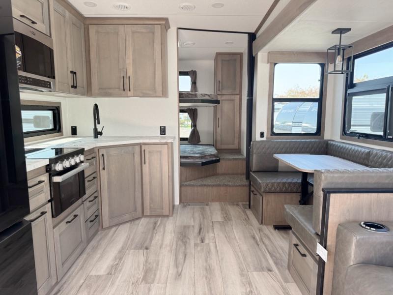 This fifth wheel is perfect for camping with a large group or family since it can sleep ten people each night! There are queen-size bunks, a U-shaped dinette, a hide-a-bed sofa, plus a queen bed in the front private bedroom. And if you'd rather have theater seating in place of the sofa, you can choose that option! The chef will have their choice to cook indoors on the three burner drop-in cooktop or outdoors on the outside griddle, plus there are two power awnings here for maximum shade. Don't let this fifth wheel slip away!
