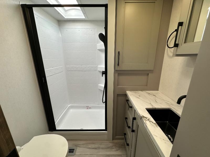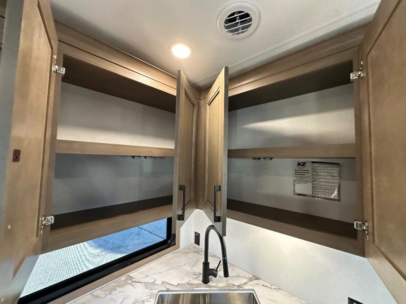Each Durango Half-Ton fifth wheel by KZ provides lightweight towing with interior luxuries galore! Controlling the functions of your unit will be a breeze with the KZ Engage powered by OneControl that includes new integrated buttons & screen to control awnings, lights, tanks, and more. There are so many exterior conveniences to make each trip enjoyable, like the heated water convenience center, and the flip-up main entry steps! Durable construction includes Tufflex PVC roofing, Pex® in-floor heated waterlines & kitchen gray pipes, and a reinforced heavy-duty fiberglass front cap. The interior will feel more like a residential home with new blancher maple & morel fog cabinets, seamless countertops, a spacious shower, a redesigned front bedroom, and smart storage spaces! You can also customize your fifth wheel to fit your needs with available options, such as, generator prep, wireless backup camera prep, a 32" exterior TV with bracket, and so much more!