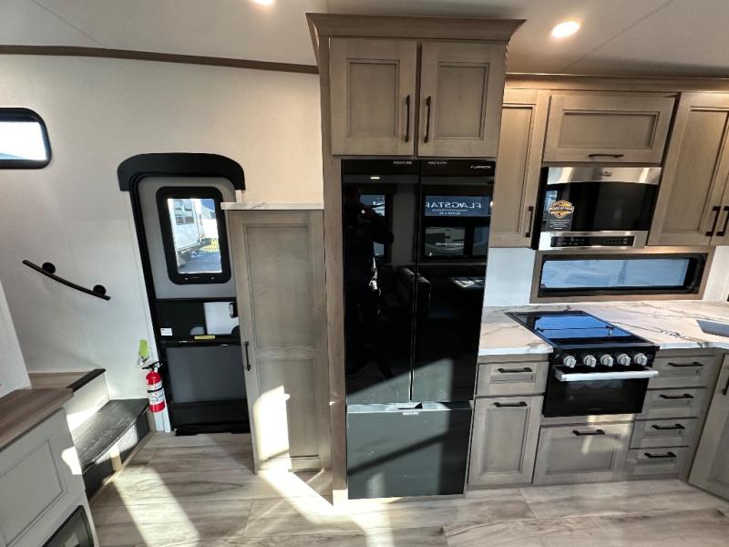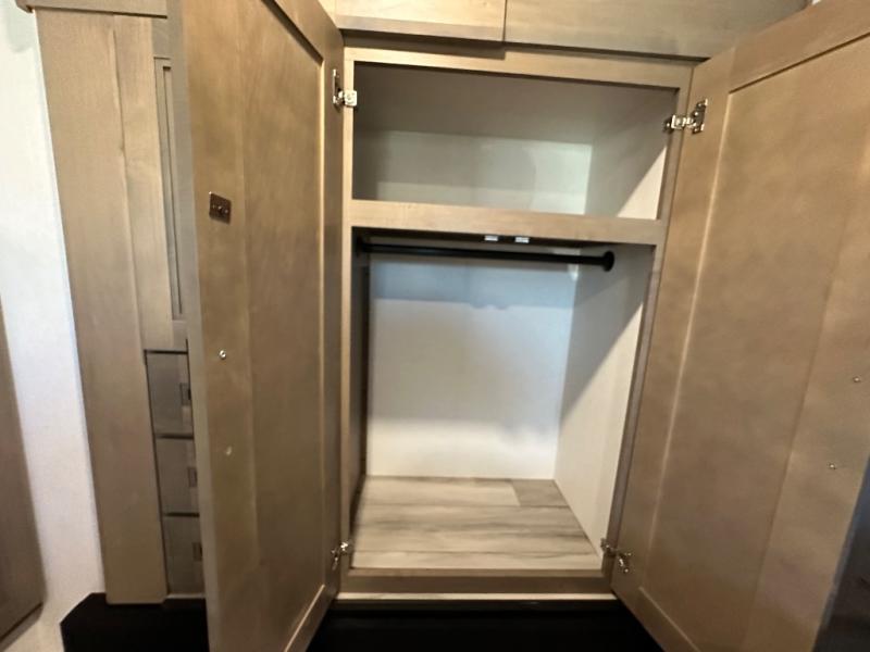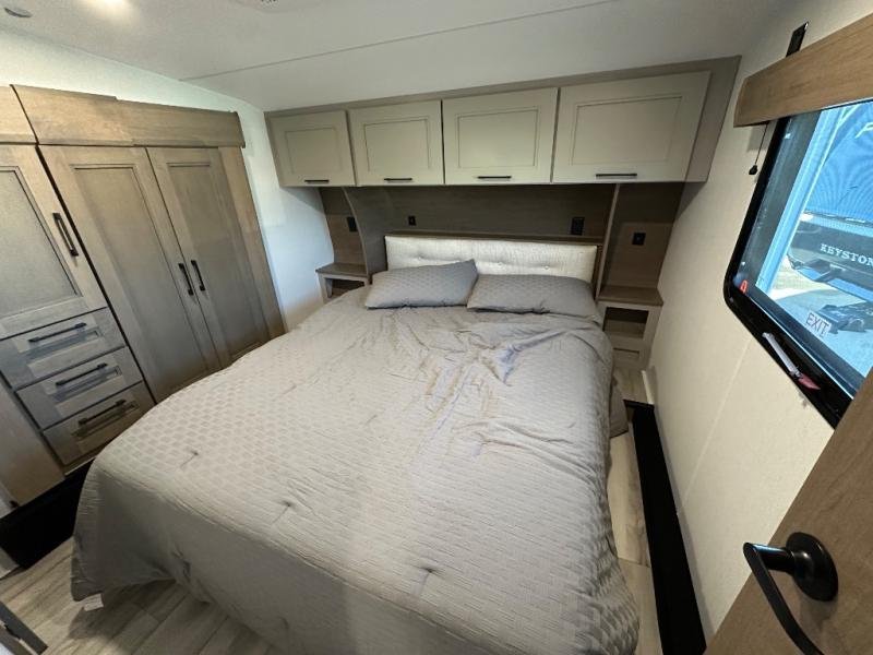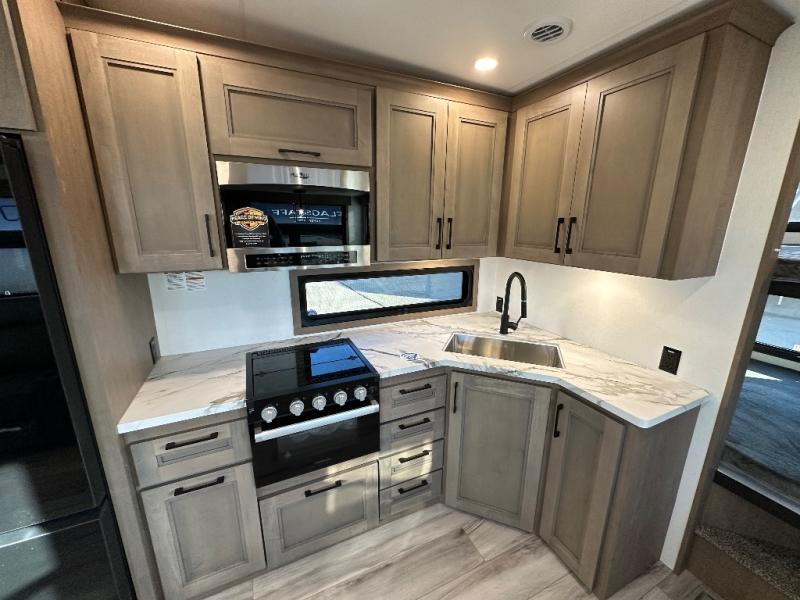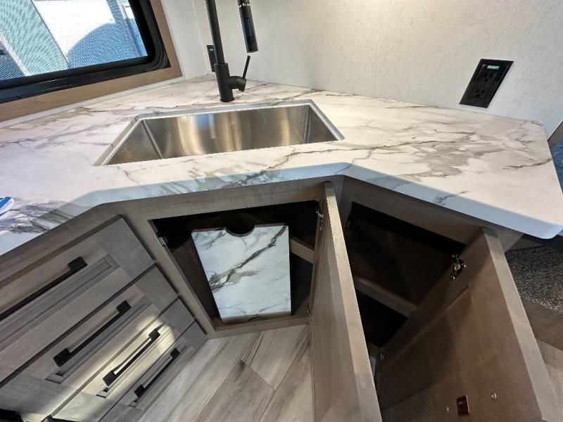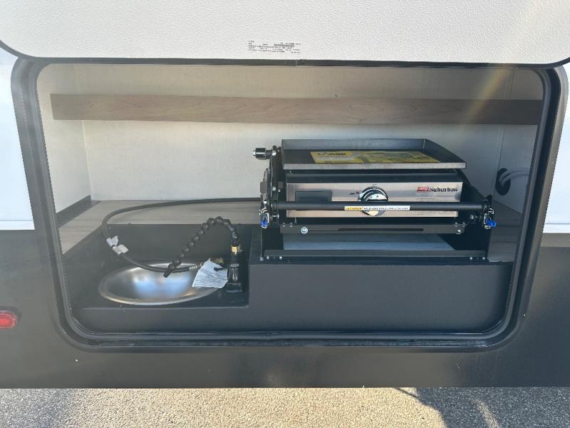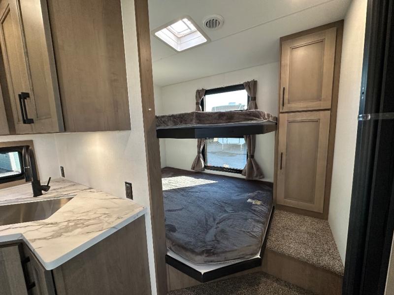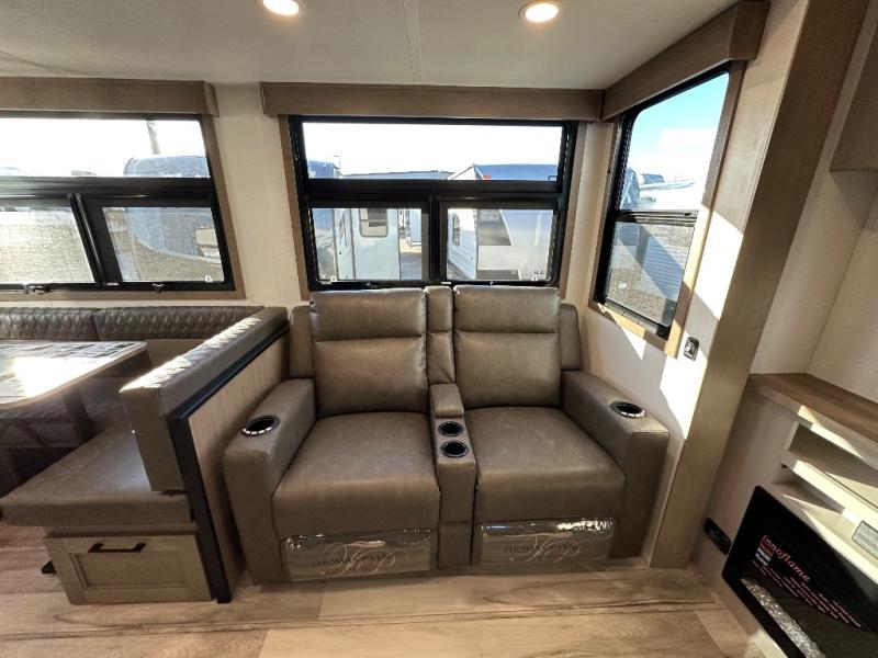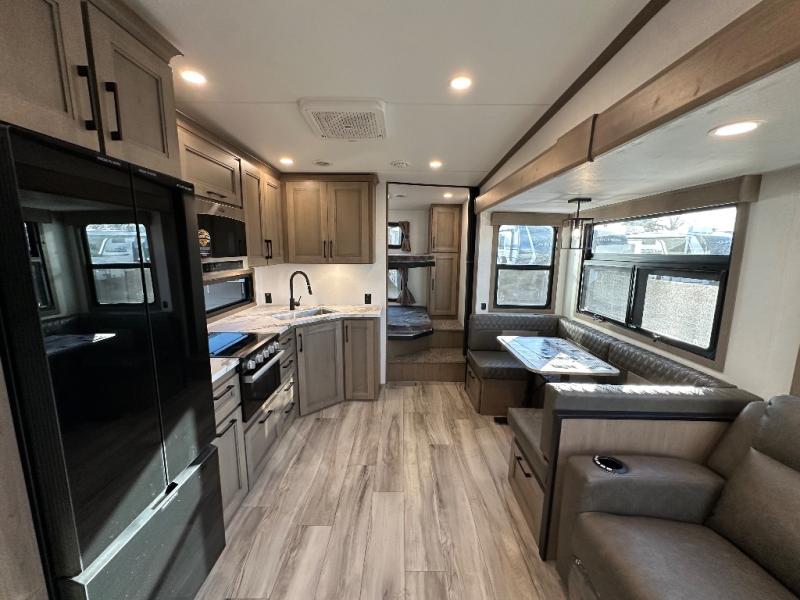 This fifth wheel is perfect for camping with a large group or family since it can sleep ten people each night! There are queen-size bunks, a U-shaped dinette, a hide-a-bed sofa, plus a queen bed in the front private bedroom. And if you'd rather have theater seating in place of the sofa, you can choose that option! The chef will have their choice to cook indoors on the three burner drop-in cooktop or outdoors on the outside griddle, plus there are two power awnings here for maximum shade. Don't let this fifth wheel slip away!