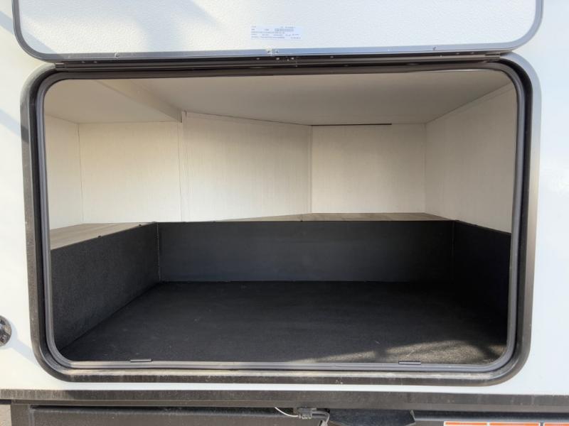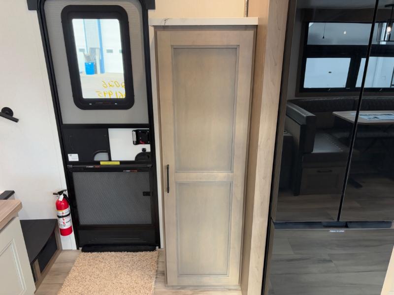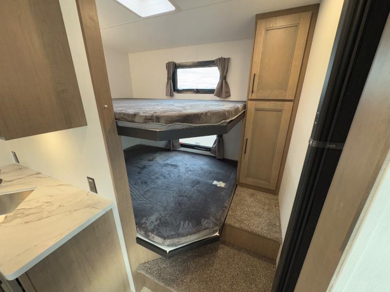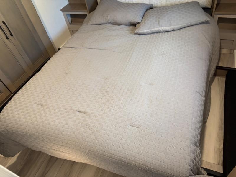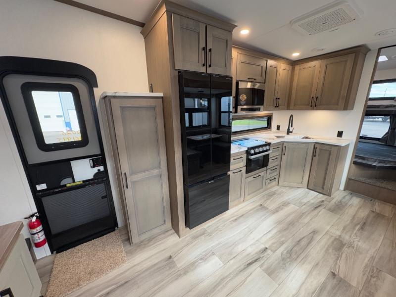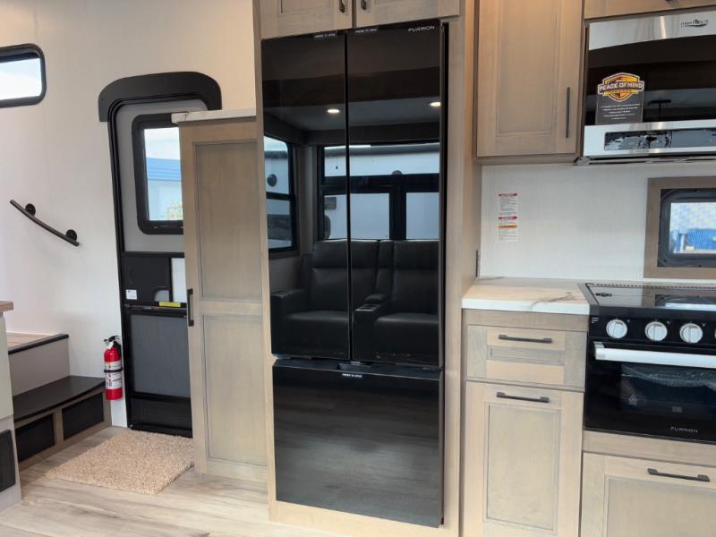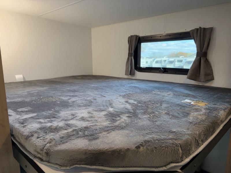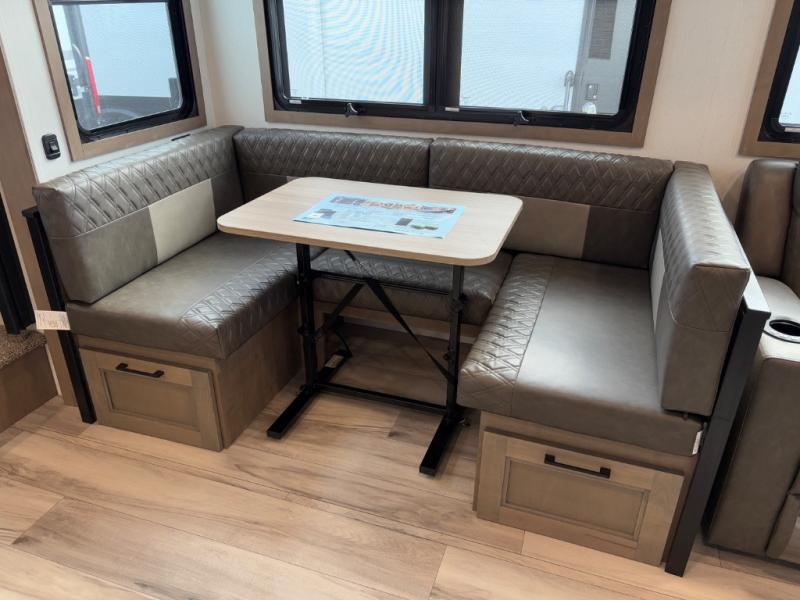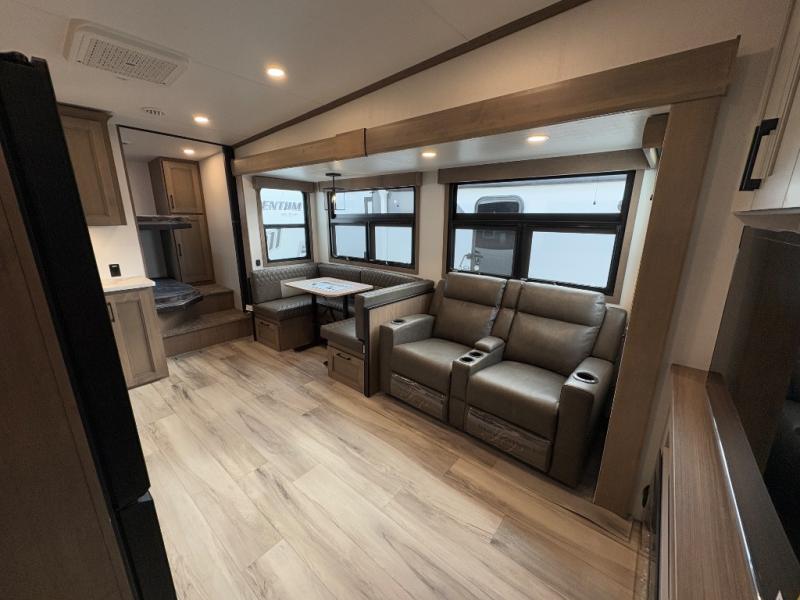 This fifth wheel is perfect for camping with a large group or family since it can sleep ten people each night! There are queen-size bunks, a U-shaped dinette, a hide-a-bed sofa, plus a queen bed in the front private bedroom. And if you'd rather have theater seating in place of the sofa, you can choose that option! The chef will have their choice to cook indoors on the three burner drop-in cooktop or outdoors on the outside griddle, plus there are two power awnings here for maximum shade. Don't let this fifth wheel slip away!