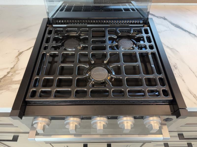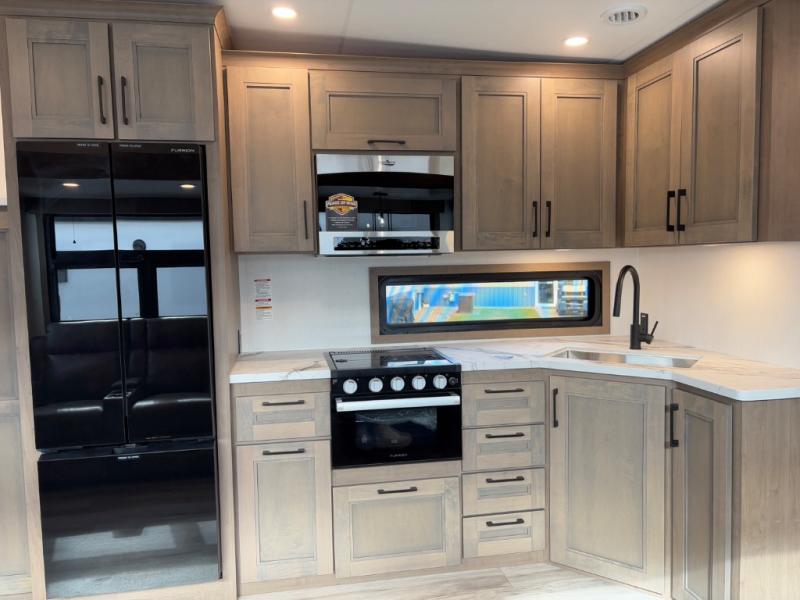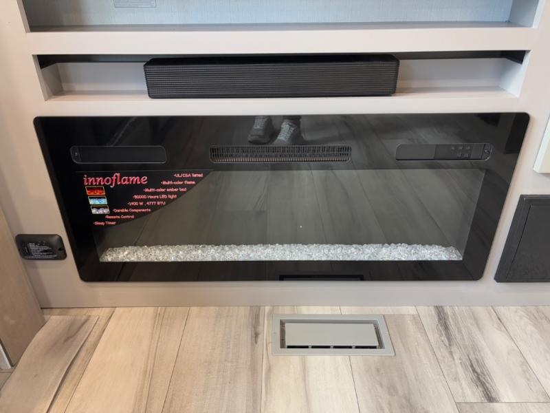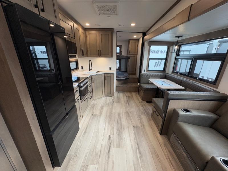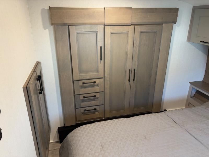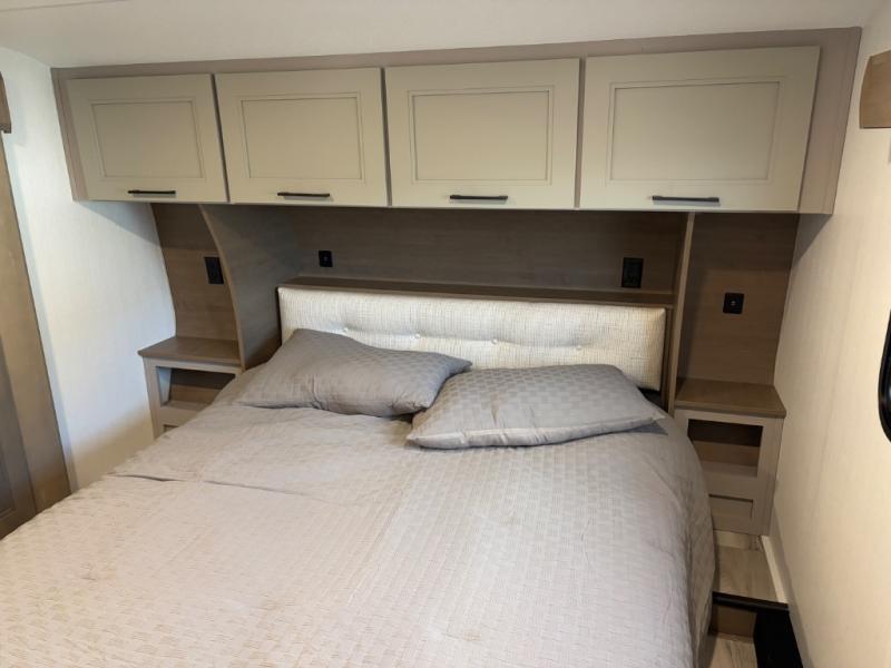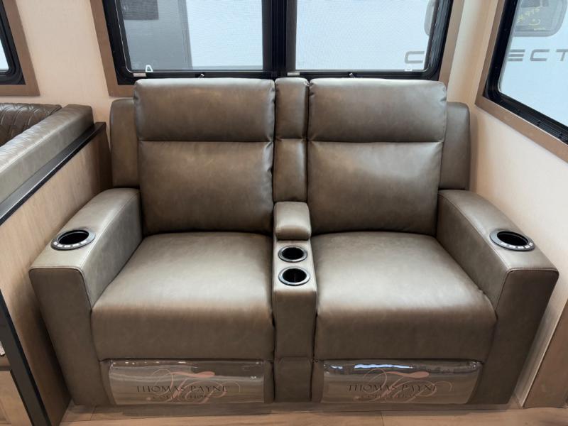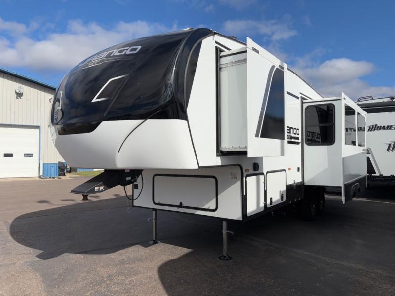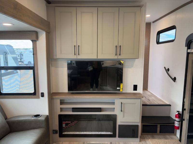This fifth wheel is perfect for camping with a large group or family since it can sleep ten people each night! There are queen-size bunks, a U-shaped dinette, a hide-a-bed sofa, plus a queen bed in the front private bedroom. And if you'd rather have theater seating in place of the sofa, you can choose that option! The chef will have their choice to cook indoors on the three burner drop-in cooktop or outdoors on the outside griddle, plus there are two power awnings here for maximum shade. Don't let this fifth wheel slip away!
