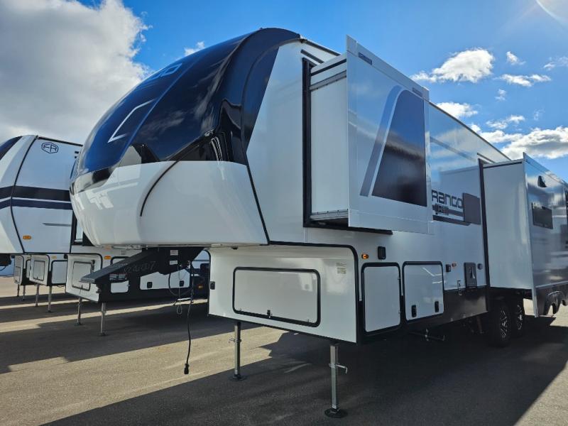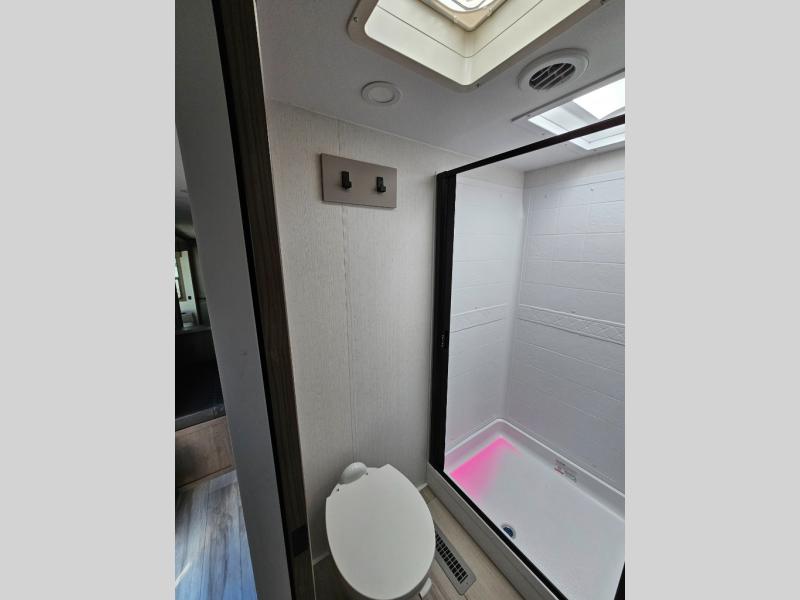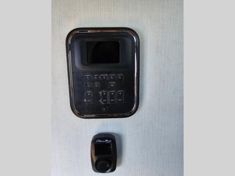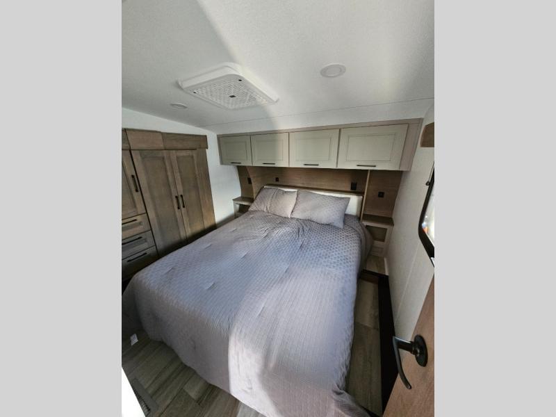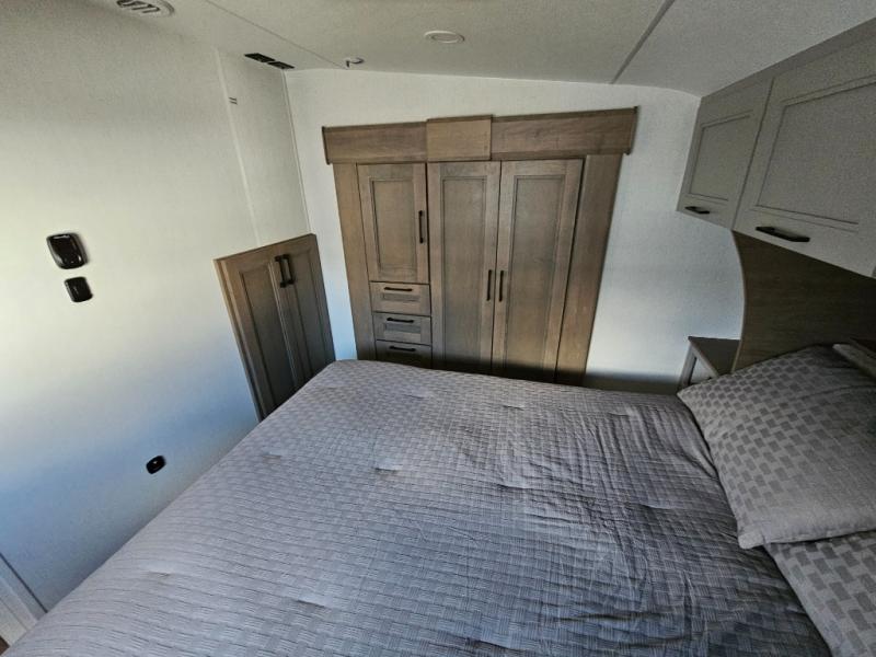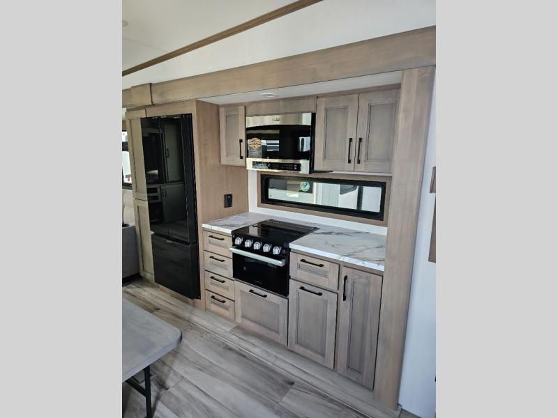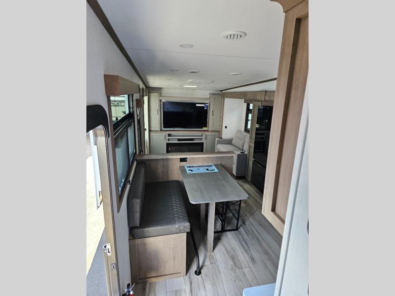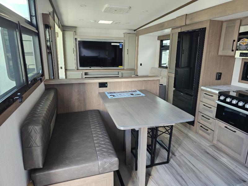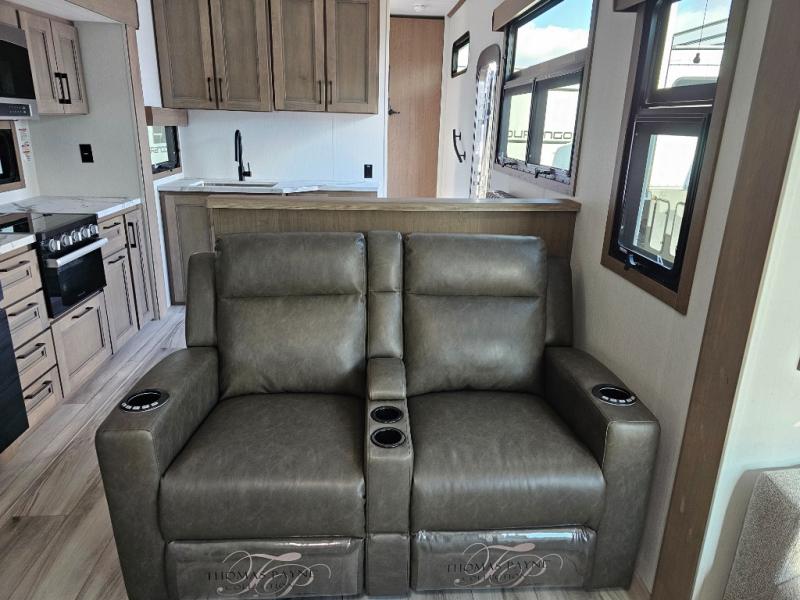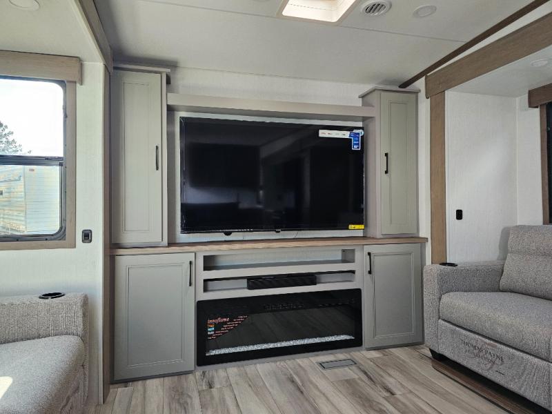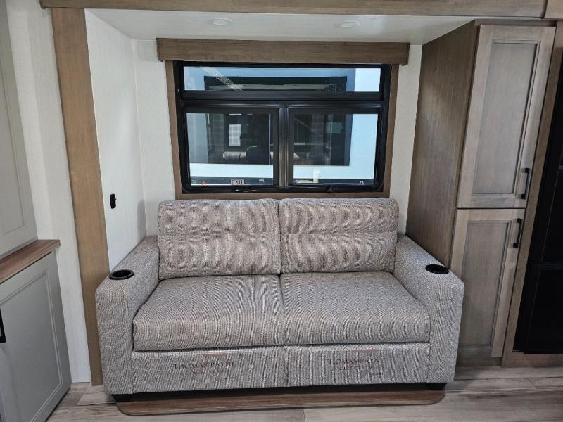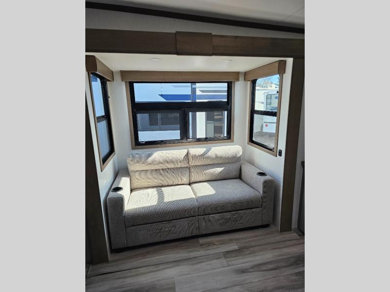 Head to your favorite state park in this spacious fifth wheel. You crew will love to visit in the rear living area that includes two hide-a-bed sofas, theater seating with USB ports, plus an entertainment center with a 65" TV! This area can double as your guests' bedroom at night, while you take the front private bedroom with a queen bed and a slide out wardrobe. In the morning, the little ones can enjoy their breakfast at the legless table, stools, and a bench, or take their plate outdoors to sit under the 19' power awning. There is also a spacious 12 cu. ft. refrigerator for food storage you are sure to appreciate!
