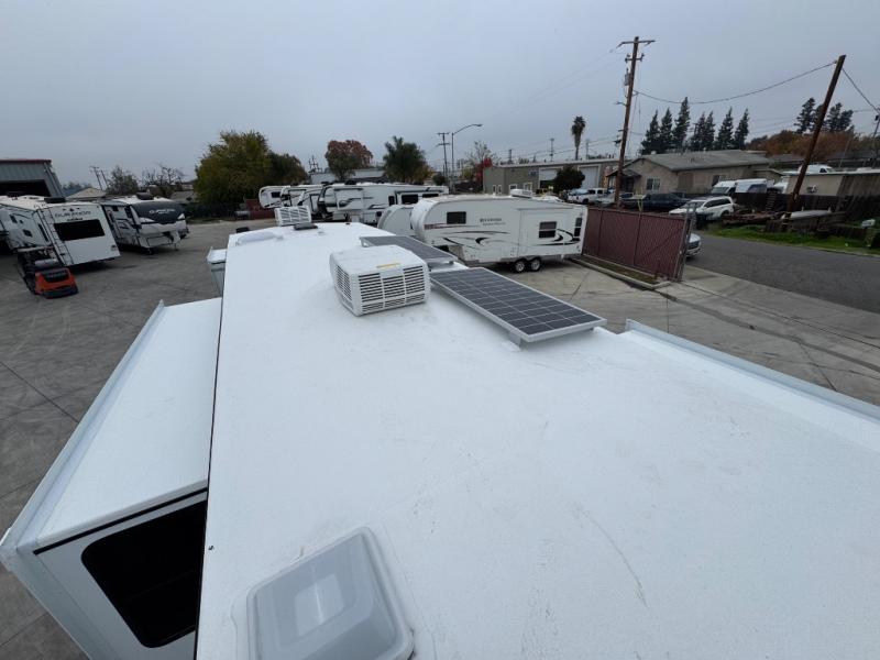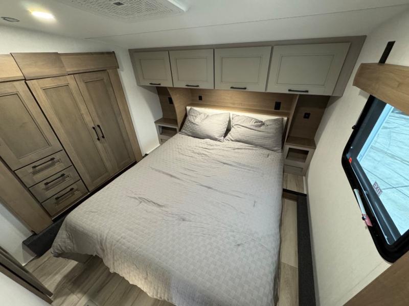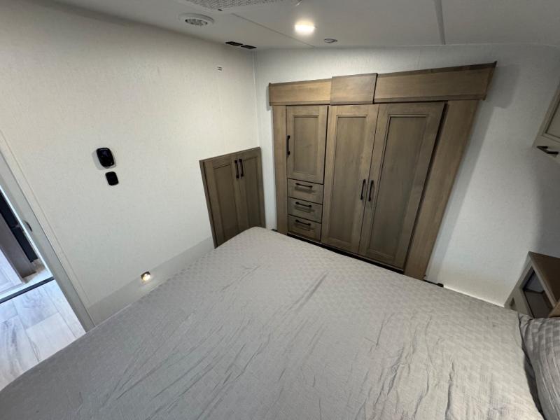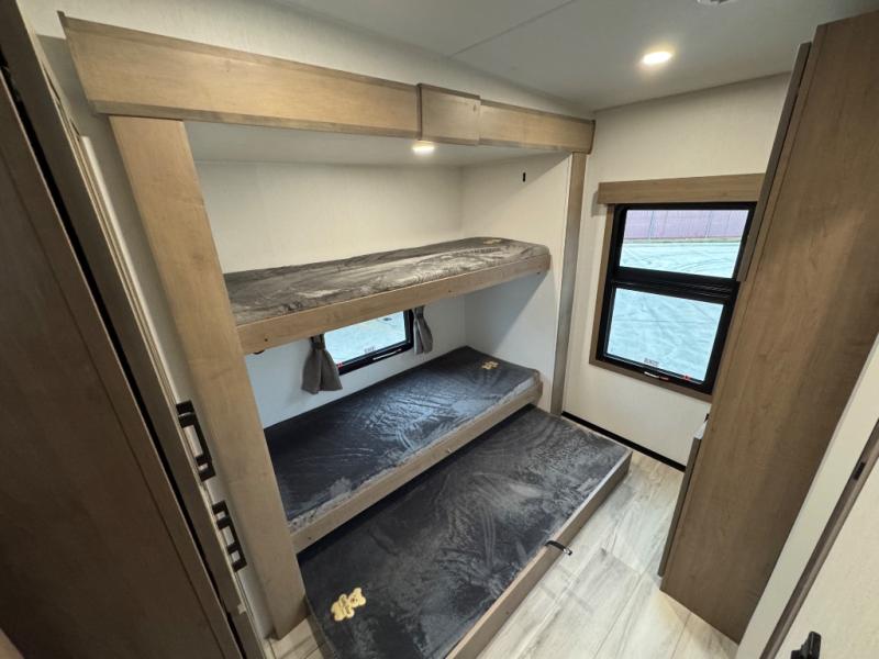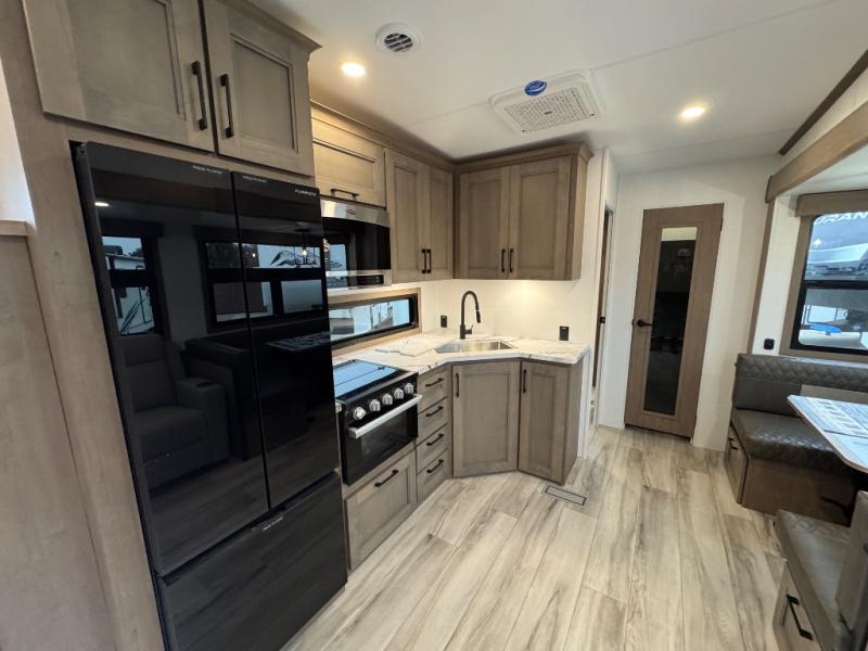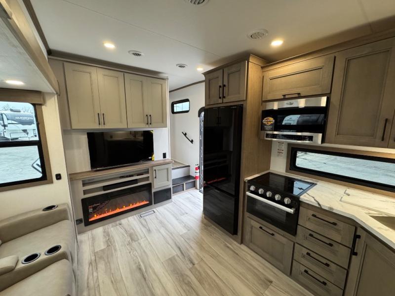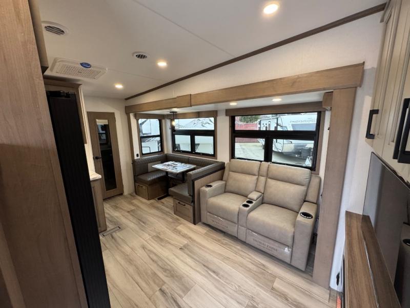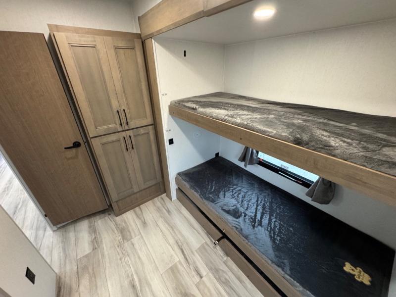This fifth wheel is perfect for camping with a large group or family since it can sleep ten people each night! There are queen-size bunks, a U-shaped dinette, a hide-a-bed sofa, plus a queen bed in the front private bedroom. And if you'd rather have theater seating in place of the sofa, you can choose that option! The chef will have their choice to cook indoors on the three burner drop-in cooktop or outdoors on the outside griddle, plus there are two power awnings here for maximum shade. Don't let this fifth wheel slip away!