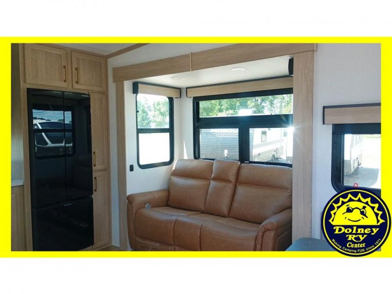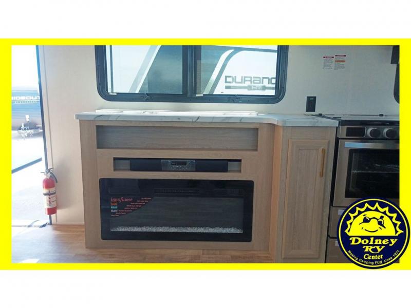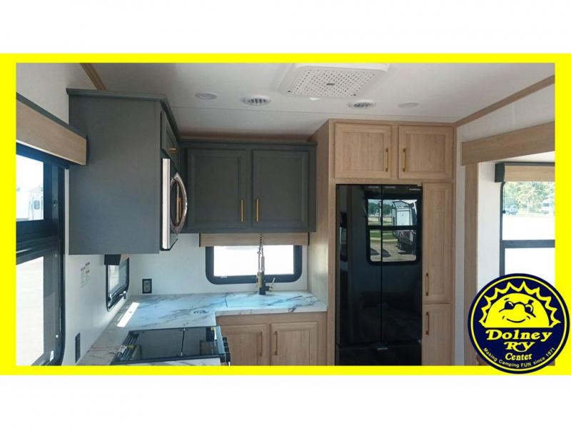 When you want to get away from it all, hitch up this spacious fifth wheel and head out! Once you arrive at the campground, you can make lunch in the rear kitchen that includes ample counter space, a 21" oven and 30" microwave, plus a pantry and French door refrigerator for food storage. Your crew can relax at the L-dinette with an EZ adjust table or on the theater seating across from the fireplace and Smart LED TV. And if you're needing additional sleeping space, just choose the optional hide-a-bed sofa in place of the theater seating! The dual entry bath features a spacious 42" x 30" residential shower, convenient towel hooks and a large slide out that is shared with the front master bedroom. You'll sleep soundly on the king bed here, and you can keep your things organized in the dresser and front closet. There is also washer and dryer prep if you want to add those appliances!