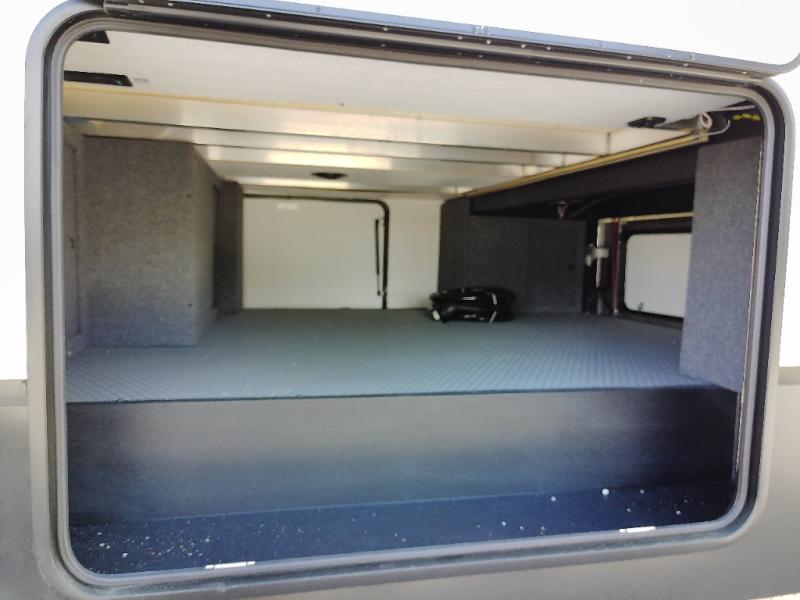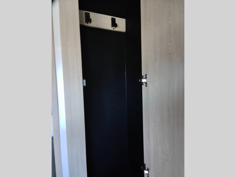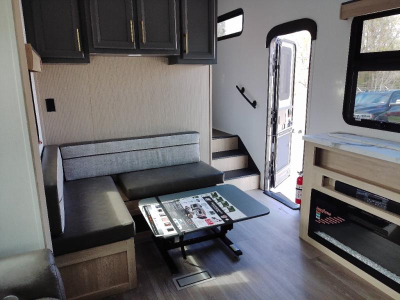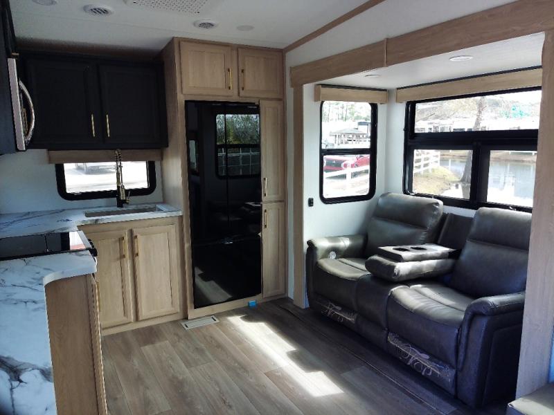 When you want to get away from it all, hitch up this spacious fifth wheel and head out! Once you arrive at the campground, you can make lunch in the rear kitchen that includes ample counter space, a 21" oven and 30" microwave, plus a pantry and French door refrigerator for food storage. Your crew can relax at the L-dinette with an EZ adjust table or on the theater seating across from the fireplace and Smart LED TV. And if you're needing additional sleeping space, just choose the optional hide-a-bed sofa in place of the theater seating! The dual entry bath features a spacious 42" x 30" residential shower, convenient towel hooks and a large slide out that is shared with the front master bedroom. You'll sleep soundly on the king bed here, and you can keep your things organized in the dresser and front closet. There is also washer and dryer prep if you want to add those appliances!