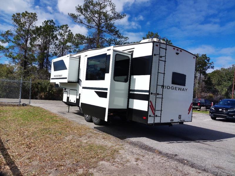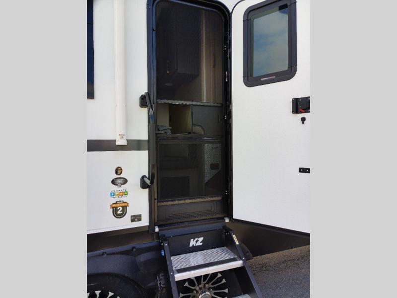 When you choose a Ridgeway fifth wheel by KZ you are choosing a modern design, convenient features, and comfort at every turn! These units have been constructed with some of the most durable materials in the industry, including Tufflex roofing material. The exterior includes a full painted front cap, a fully-finished, heated and sealed basement storage compartment, and a deluxe heated water convenience center to easily monitor your units water levels. There is also 4-point auto electric leveling, a 2" towing receiver hitch, and many more stand-out exterior features. Once inside, you'll enjoy the ceiling crown molding, 5" gold cabinet hardware, deluxe residential-style furniture, and all-wood lumber core screwed cabinets with hardwood doors. The comforts continue on in the bathroom and bedroom with a shower skylight and built-in seat, large linen closets, a luxurious bedspread, and XL under-bed storage for luggage, extra blankets and more!