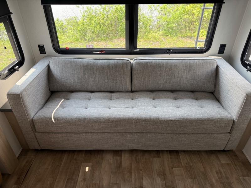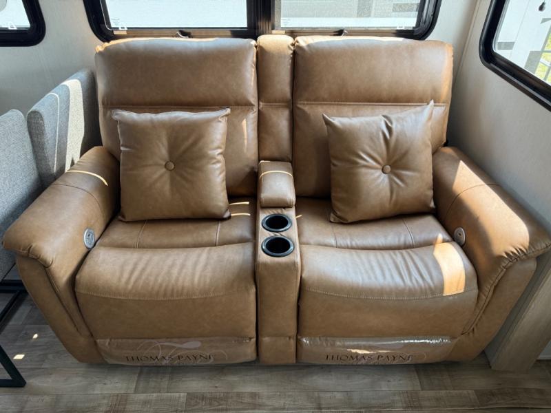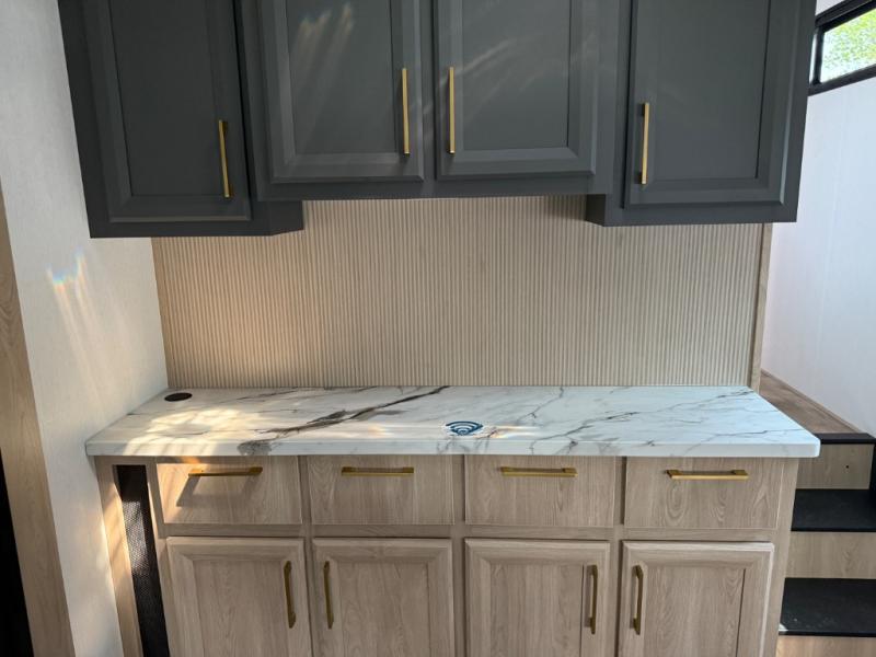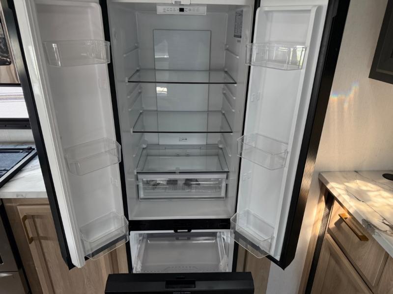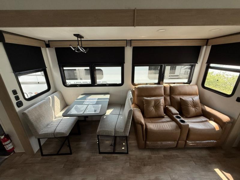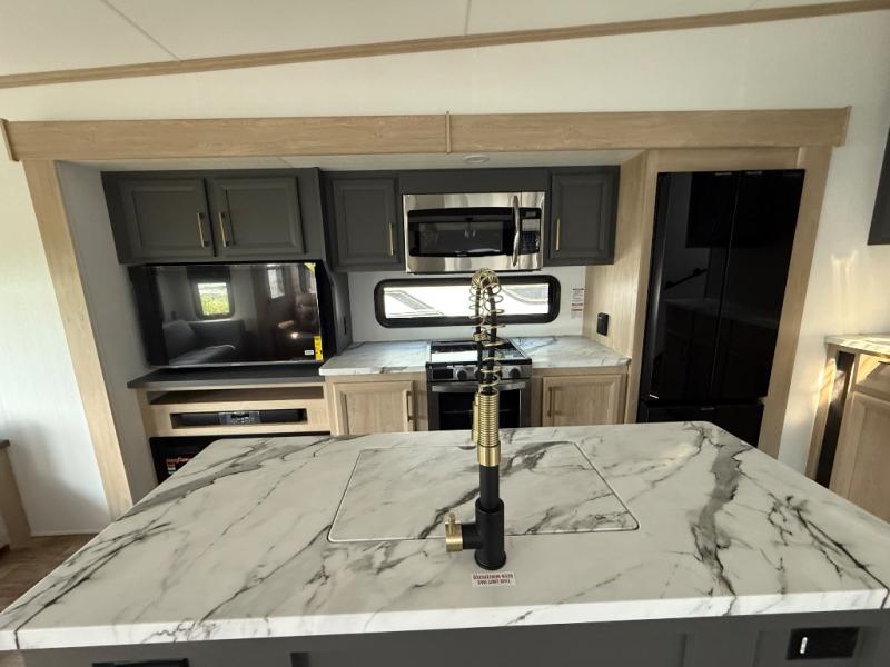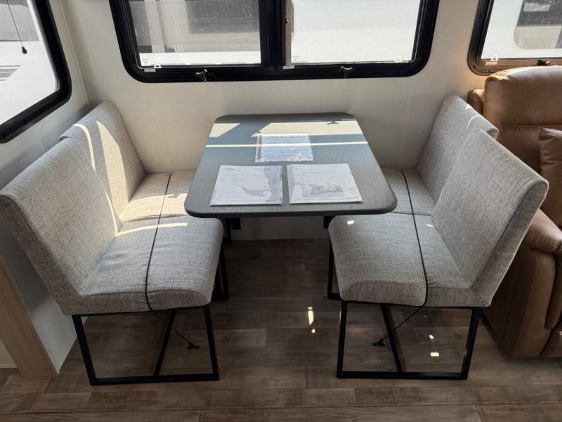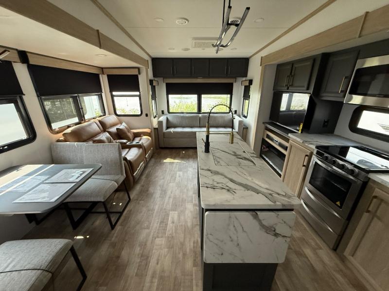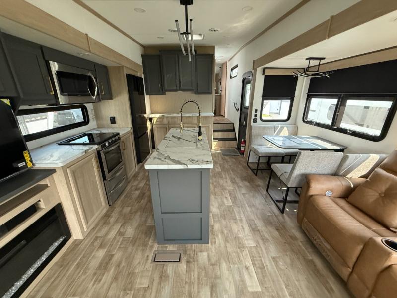You will love the amount of interior space in this fifth wheel with triple slides, including dual opposing slides in the combined kitchen and rear living area. The chef of your group will appreciate the kitchen island for more prep space, along with a hutch/pantry for additional storage. A table with four chairs provides a place to dine together, and there is theater seating across from the Smart LED TV for movie night. If you have any guests, they can sleep on the rear hide-a-bed sofa, while you take the king bed in the front master bedroom. You'll also find a front closet here with washer and dryer prep, a dresser, and a large slide that is shared with the dual entry bath.