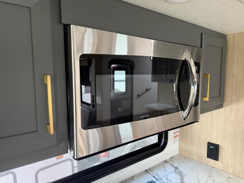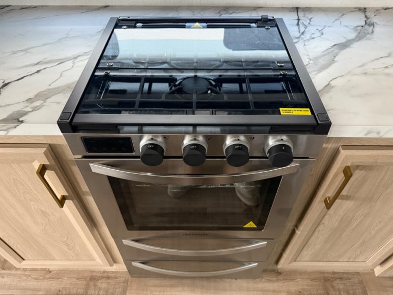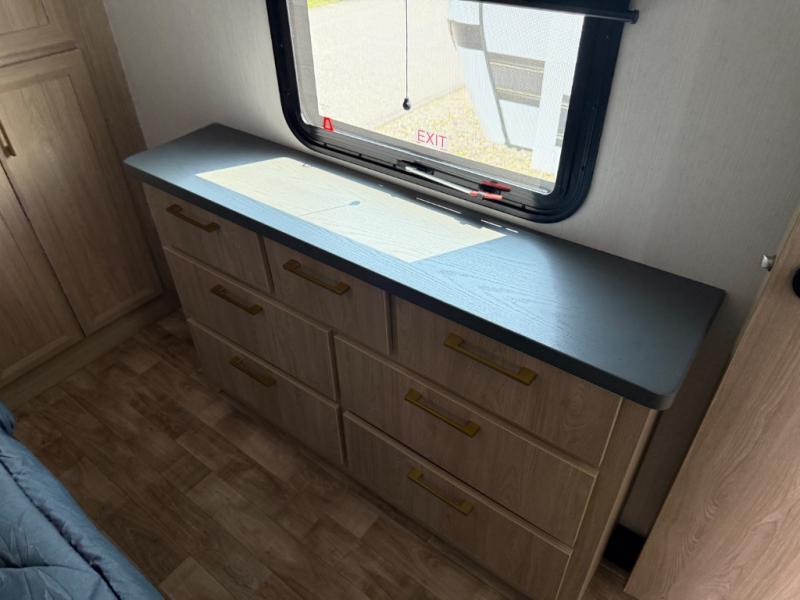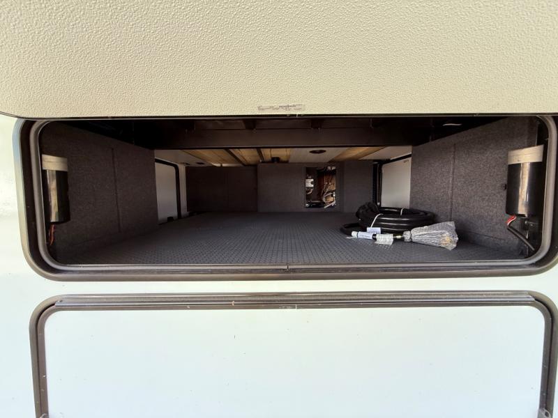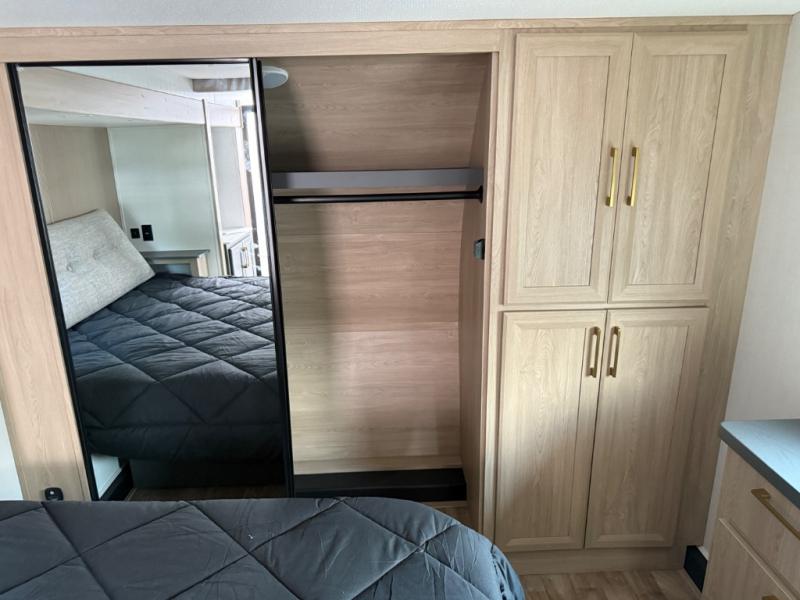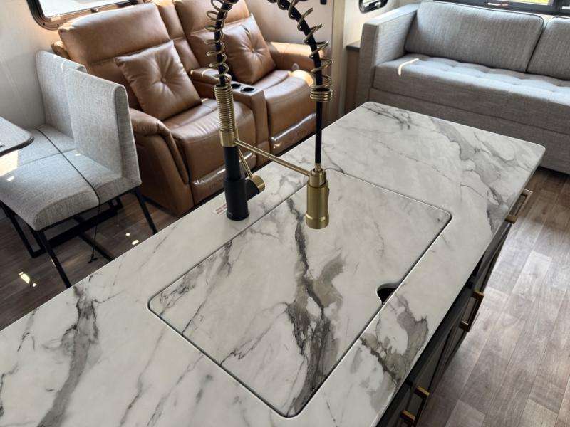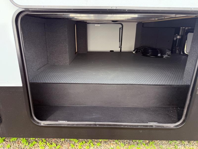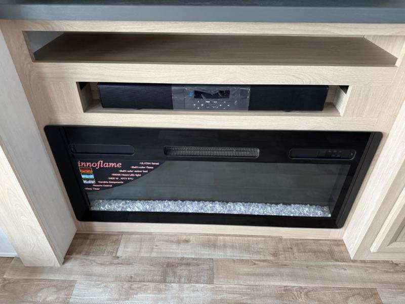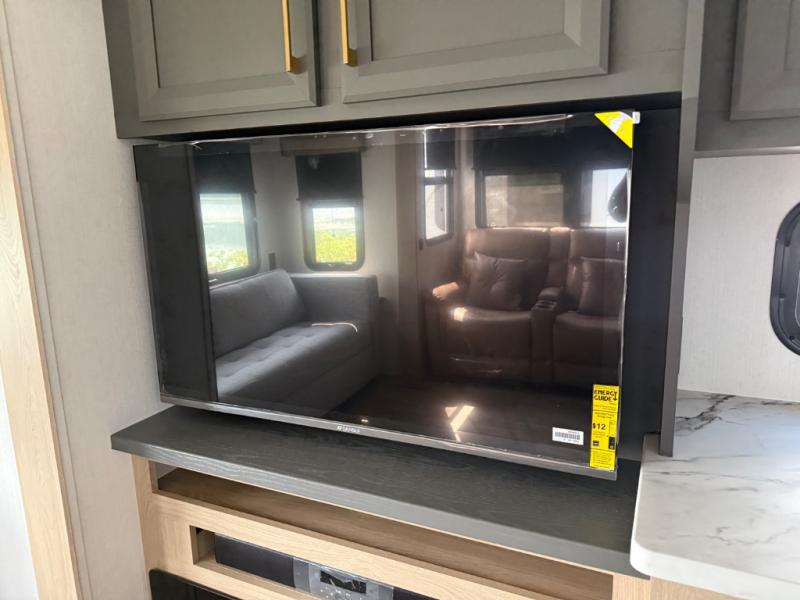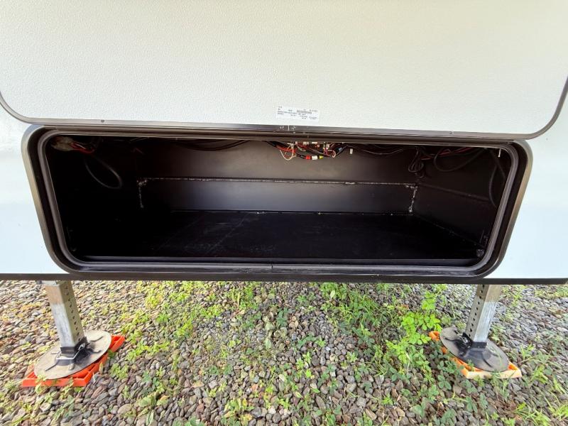 You will love the amount of interior space in this fifth wheel with triple slides, including dual opposing slides in the combined kitchen and rear living area. The chef of your group will appreciate the kitchen island for more prep space, along with a hutch/pantry for additional storage. A table with four chairs provides a place to dine together, and there is theater seating across from the Smart LED TV for movie night. If you have any guests, they can sleep on the rear hide-a-bed sofa, while you take the king bed in the front master bedroom. You'll also find a front closet here with washer and dryer prep, a dresser, and a large slide that is shared with the dual entry bath.